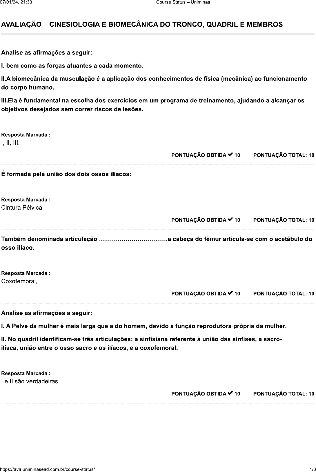 Avaliação - Cinesiologia e Biomecânica do Tronco, Quadril e Membros