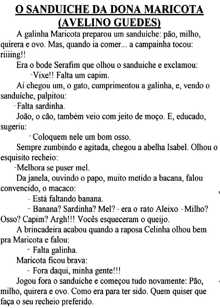 1) COMO É O NOME DA HISTÓRIA? ____________________________________________________________________________________________________________________________________________________________________ 2) QUEM ESCREVEU A HISTÓRIA? __________________________________________________________________________________ 3) ESCREVA A ORDEM DA CHEGADA DOS ANIMAIS EM FORMA DE LISTA. ________________________________________________________________________________________________________________________________________________________________________________________________________________________________________________________________________________________________________________________________________ 4) QUAIS ERAM OS INGREDIENTES PREFERIDOS DA GALINHA? __________________________________________________________________________________ 5) QUEM SUGERIU QUE COLOCASSEM MEL? _________________________________________ 6) POR QUE A BRINCADEIRA ACABOU QUANDO A RAPOSA SUGERIU SEU INGREDIENTE PREFERIDO? ___________________________________________________________________________________________________________________________ 7) SEPARE AS SÍLABAS DAS PALAVRAS: GALINHA _________________________________ RAPOSA __________________________________ MEL _____________________________________ BODE ____________________________________ QUIRERA _________________________________ ABELHA __________________________________ GATO ____________________________________ 8) ESCREVA FRASES PARA AS PALAVRAS MEL ___________________________________________________________________________________________________________________________ RAPOSA ___________________________________________________________________________________________________________________________ 1) QUAL É O NOME DO TEXTO? __________________________________________________________________________________ 2) DE QUAL ANIMAL FALA O TEXTO? __________________________________________________________________________________ 3) O QUE ACONTECE QUANDO PEGAM A BOLA DO GATO? __________________________________________________________________________________ 4) QUANDO BETO BATE A MÃO, O QUE O GATO FAZ? __________________________________________________________________________________ 5) O QUE O GATO FAZ, QUANDO O GATO BATE O PÉ? __________________________________________________________________________________ 6) O QUE O GATO FAZ QUANDO O BETO ASSOBIA? __________________________________________________________________________________ ESCREVA O DOBRO DE CADA CONJUNTO. DESENHE O QUE VOCÊ LER: O GATO DA MINHA TIA É BONITO E PRETO. PERTO DA ESCOLA TEM UMA CASA COM UM GALINHEIRO CHEIO DE GALINHAS E PINTINHOS. A GALINHA MARICOTA GOSTA DE COMER MILHO E QUIRERA. PREENCHA A CRUZADINHA DOS ANIMAIS DA HISTÓRIA “O SANDUÍCHE DE DONA MARICOTA. PINTE O RESULTADO DAS OPERAÇÕES DE ACORDO COM A LEGENDA. 1) QUALÉ O TÍTULO DO TEXTO? _________________________________________________________________________________ 2) O QUE O CACHORRO FAZ PARA FAZER XIXI? ( ) LEVANTA AS ORELHAS ( ) LEVANTA A PERNA ( ) LEVANTA O NARIZ 3) O QUE ELE FAZ PARA FALAR OI? __________________________________________________________________________________ 4) PORQUE ELE COLOCA A LÍNGUA PARA FORA? __________________________________________________________________________________ 5) FAÇA IMA LISTA DO PRECISAMOS PARA CUIDAR DOS ANIMAIS. ______________________________________________________________________________________________________________________________________________________________________________________________________________________________________________________ RODA DA CONVERSA SEMANA PASSADA FALAMOS SOBRE A HISTÓRIA DO “SANDUÍCHE DE DONA MARICOTA. NESTA MÚSCIA DE HOJE, FALA SOBRE UM CACHORRO E ALGUMAS PARTES DO CORPO DELE. VOCÊ SABIA QUE NÓS TAMBÉM TEMOS UM CORPO E ASSIM COMO A GALINHA MARICOTA, NÓS TAMBÉM TEMOS PREFERENCIAS, ASSIM COMO ESSE CACHORRO CITADO NO TEXTO, TAMBÉM TEMOS ATITUDES E SENTIMENTOS QUE DEMONSTRAM COMO NÓS SOMOS. DESENHE NO ESPAÇO ABAIXO COISAS QUE VOCÊ GOSTA. CONTE OS ELEMENTOS DE CADA CONJUNTO E CALCULE O DOBRO. ESCREVA O NOME DOS NÚMEROS 1 ________________________________________ 2________________________________________ 3_______________________________________ 4________________________________________ 5________________________________________ 6________________________________________ 8________________________________________ 9 ________________________________________ 10________________________________________ 11________________________________________ 12________________________________________ 13_________________________________________ 14_________________________________________ 15_________________________________________ 16_________________________________________ 17_________________________________________ 18 _________________________________________ CONTE OS DOCES E REGISTRE O DOBRO