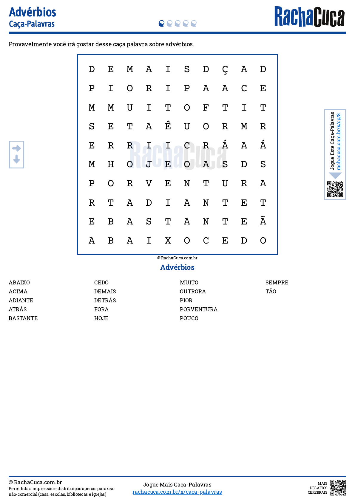 Provavelmente você irá gostar desse caça palavra sobre advérbios. Advérbios © RachaCuca.com.br Permitida a impressão e distribuição apenas para uso não-comercial (casa, escolas, bibliotecas e igrejas) Jogue Mais Caça-Palavras rachacuca.com.br/x/caca-palavras MAIS DESAFIOS CEREBRAIS ABAIXO ACIMA ADIANTE ATRÁS BASTANTE CEDO DEMAIS DETRÁS FORA HOJE MUITO OUTRORA PIOR PORVENTURA POUCO SEMPRE TÃO Advérbios Caça-Palavras D E M A I S D Ç A D P I O R I P A A C E M M U I T O F T I T S E T A Ê U O R M R E R R I I C R Á A Á M H O J E O A S D S P O R V E N T U R A R T A D I A N T E T E B A S T A N T E Ã A B A I X O C E D O © RachaCuca.com.br J o g u e E st e C a ç a -P a la v ra s ra c h a c u c a .c o m .b r/ x /c p /8 https://rachacuca.com.br/x/main/home/?src=RWSS8&evt=copyright-footer/click https://rachacuca.com.br/x/caca-palavras/?src=RWSS8&evt=play-more/click https://rachacuca.com.br/x/main/home/?src=RWSS8&evt=logo/click https://rachacuca.com.br/x/main/home/?src=RWSS8&evt=copyright-game/click https://rachacuca.com.br/x/cp/8/?src=RWSS8&evt=link-widget/click Provavelmente você irá gostar desse caça palavra sobre advérbios. © RachaCuca.com.br Permitida a impressão e distribuição apenas para uso não-comercial (casa, escolas, bibliotecas e igrejas) Jogue Mais Caça-Palavras rachacuca.com.br/x/caca-palavras MAIS DESAFIOS CEREBRAIS Advérbios Caça-Palavras D E M A I S D Ç A D P I O R I P A A C E M M U I T O F T I T S E T A Ê U O R M R E R R I I C R Á A Á M H O J E O A S D S P O R V E N T U R A R T A D I A N T E T E B A S T A N T E Ã A B A I X O C E D O © RachaCuca.com.br J o g u e E st e C a ç a -P a la v ra s ra c h a c u c a .c o m .b r/ x /c p /8 https://rachacuca.com.br/x/main/home/?src=RWSS8&evt=copyright-footer/click https://rachacuca.com.br/x/caca-palavras/?src=RWSS8&evt=play-more/click https://rachacuca.com.br/x/main/home/?src=RWSS8&evt=logo/click https://rachacuca.com.br/x/main/home/?src=RWSS8&evt=copyright-game/click https://rachacuca.com.br/x/cp/8/?src=RWSS8&evt=link-widget/click Conhecido como o Rei do Baião, foi um importante compositor e cantor popular brasileiro. © RachaCuca.com.br © RachaCuca.com.br Permitida a impressão e distribuição apenas para uso não-comercial (casa, escolas, bibliotecas e igrejas) Jogue Mais Criptogramas rachacuca.com.br/x/criptogramas MAIS DESAFIOS INTELIGENTES Criptograma #150 Criptogramas Fazer ir de encontro. Encobrir; esconder. Caixa pequena. Que mora perto. País cuja capital é Budapeste. Saco de alça utilizado para carregar compras (plural). Que tem muita carne. Mulher que anda a cavalo. Tempo que uma coisa dura. Que apresenta rasgo. Aquele que relata. Jogue Este Criptograma rachacuca.com.br/x/cri/150 https://rachacuca.com.br/x/main/home/?src=RCRY46&evt=copyright-game/click https://rachacuca.com.br/x/main/home/?src=RCRY46&evt=copyright-footer/click https://rachacuca.com.br/x/criptogramas/?src=RCRY46&evt=play-more/click https://rachacuca.com.br/x/main/home/?src=RCRY46&evt=logo/click https://rachacuca.com.br/x/cri/150/?src=RCRY46&evt=link-widget/click