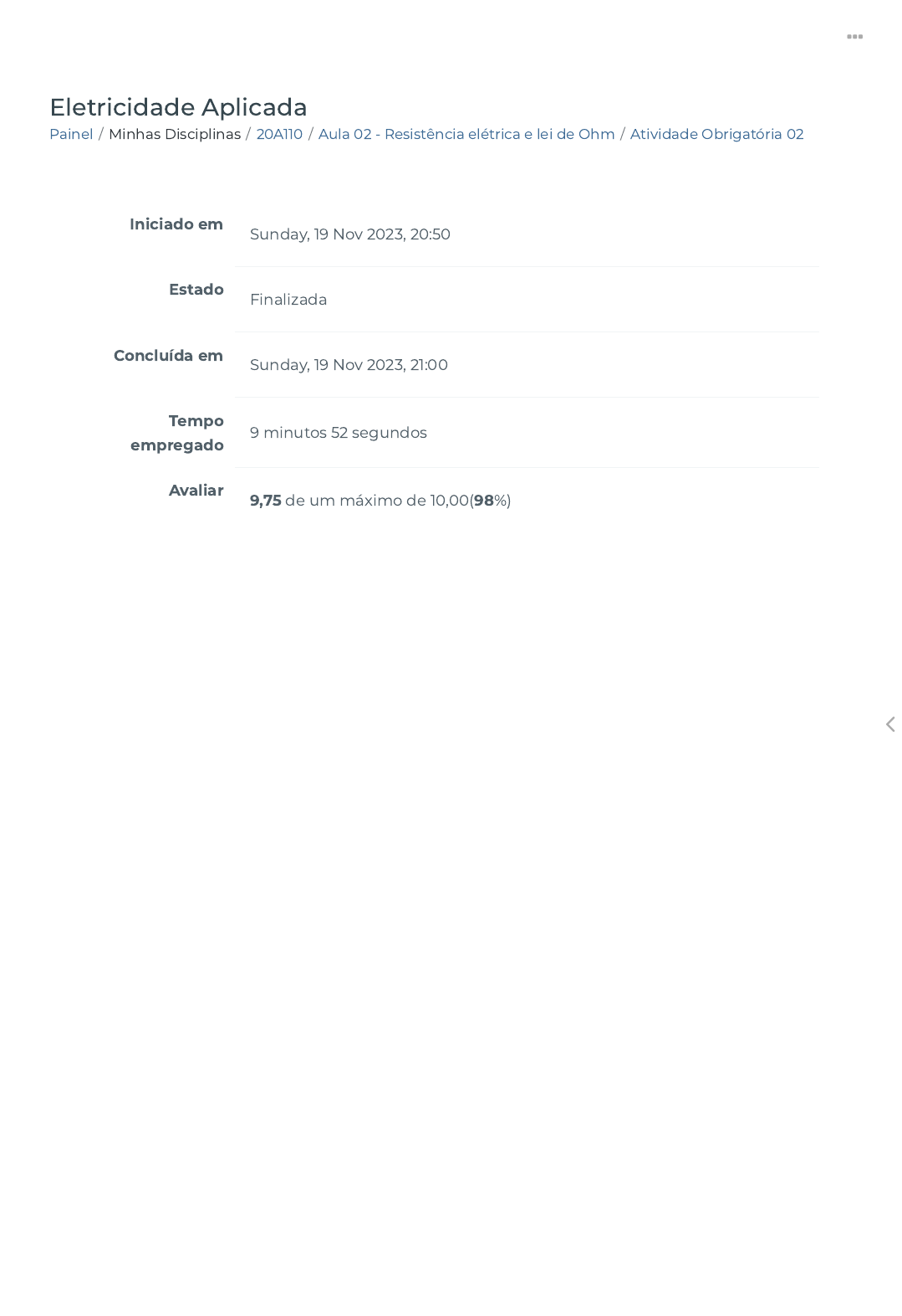 19/11/2023, 21:00 Atividade Obrigatória 02 https://ava.politecnicabr.com.br/mod/quiz/review.php?attempt=5925331 1/7 Painel / Minhas Disciplinas / 20A110 / Aula 02 - Resistência elétrica e lei de Ohm / Atividade Obrigatória 02 Eletricidade Aplicada Iniciado em Sunday, 19 Nov 2023, 20:50 Estado Finalizada Concluída em Sunday, 19 Nov 2023, 21:00 Tempo empregado 9 minutos 52 segundos Avaliar 9,75 de um máximo de 10,00(98%) https://ava.politecnicabr.com.br/my/ https://ava.politecnicabr.com.br/my/ https://ava.politecnicabr.com.br/course/view.php?id=945 https://ava.politecnicabr.com.br/course/view.php?id=945#section-3 https://ava.politecnicabr.com.br/mod/quiz/view.php?id=31386 https://ava.politecnicabr.com.br/ 19/11/2023, 21:00 Atividade Obrigatória 02 https://ava.politecnicabr.com.br/mod/quiz/review.php?attempt=5925331 2/7 Questão 1 Correto Atingiu 1,00 de 1,00 Qual o valor nominal e tolerância deste resistor ? Escolha uma opção: 250kΩ ±20% 250kΩ ±5% 390kΩ ±10% 390kΩ ±5% https://ava.politecnicabr.com.br/ 19/11/2023, 21:00 Atividade Obrigatória 02 https://ava.politecnicabr.com.br/mod/quiz/review.php?attempt=5925331 3/7 Questão 2 Correto Atingiu 1,00 de 1,00 Faça a correta correspondência: Reostato Potenciômetro trimpot https://ava.politecnicabr.com.br/ 19/11/2023, 21:00 Atividade Obrigatória 02 https://ava.politecnicabr.com.br/mod/quiz/review.php?attempt=5925331 4/7 Questão 3 Correto Atingiu 1,00 de 1,00 A unidade de medida de resistência elétrica é o Ohm. Escolha uma opção: Questão 4 Correto Atingiu 1,00 de 1,00 Qual a intensidade de corrente elétrica que passa por uma resistência de 1kΩ submetida a uma tensão de 10V? Escolha uma opção: Verdadeiro Falso 1KA 0,01A 100A Nenhuma das alternativas aqui apresentadas https://ava.politecnicabr.com.br/ 19/11/2023, 21:00 Atividade Obrigatória 02 https://ava.politecnicabr.com.br/mod/quiz/review.php?attempt=5925331 5/7 Questão 5 Parcialmente correto Atingiu 0,75 de 1,00 Considerando que o resistor abaixo seja de 10kΩ. Coloque corretamente os anéis de cores correspondentes a este valor a �gura abaixo. Questão 6 Correto Atingiu 1,00 de 1,00 Por um resistência de 150Ω passa uma corrente de 100mA. Qual é a queda de tensão que este resistor provoca no circuito? Escolha uma opção: 150V 15V 15mV 15KV https://ava.politecnicabr.com.br/ 19/11/2023, 21:00 Atividade Obrigatória 02 https://ava.politecnicabr.com.br/mod/quiz/review.php?attempt=5925331 6/7 Questão 7 Correto Atingiu 1,00 de 1,00 A resistência é a característica elétrica dos materiais, que representam a facilitação á passagem da corrente. Escolha uma opção: Questão 8 Correto Atingiu 1,00 de 1,00 A característica é o que chamamos de comportamento ôhmico. Este valor constante equivalente á resistência elétrica R do material, cuja unidade de medida é o . Questão 9 Correto Atingiu 1,00 de 1,00 Por uma resistência passa uma corrente de 150mA. Provocando uma queda de tensão de 15V. qual o valor da resistência em ohms? Resposta: 100 Verdadeiro Falso Linear Ohm https://ava.politecnicabr.com.br/ 19/11/2023, 21:00 Atividade Obrigatória 02 https://ava.politecnicabr.com.br/mod/quiz/review.php?attempt=5925331 7/7 © 2022 - Escola Politécnica Brasileira Questão 10 Correto Atingiu 1,00 de 1,00 Uma resistência de 22kΩ e tolerância de ±5% tem como anéis gravados no resistor. Entre em Contato https://www.politecnicabr.com.br 0800 084 2627 0800 084 2627 Links Úteis Dicas da nossa Diretora Acadêmica Planner de Estudos Declaração de Matrícula Orientações do AVA Abertura de Ticket Fale com o Tutor Cronograma de Estudos Manual de Estágio Manual de Competência Siga-nos nas redes sociais https://ava.politecnicabr.com.br/mod/quiz/0 https://ava.politecnicabr.com.br/mod/quiz/0 https://www.politecnicabr.com.br/ https://soundcloud.com/user-501638417/sets/escola-politecnica-brasileira https://soundcloud.com/user-501638417/sets/escola-politecnica-brasileira https://storage.googleapis.com/sirius-pubstore/semestre_plannerdeestudo%20poli.pdf https://storage.googleapis.com/sirius-pubstore/semestre_plannerdeestudo%20poli.pdf https://storage.googleapis.com/sirius-pubstore/declaracao_matricula.pdf https://storage.googleapis.com/sirius-pubstore/declaracao_matricula.pdf https://storage.googleapis.com/sirius-pubstore/orientacoes_ava.pdf https://storage.googleapis.com/sirius-pubstore/orientacoes_ava.pdf https://storage.googleapis.com/sirius-pubstore/abertura_ticket.pdf https://storage.googleapis.com/sirius-pubstore/abertura_ticket.pdf https://storage.googleapis.com/sirius-pubstore/fale_com_tutor.pdf https://storage.googleapis.com/sirius-pubstore/fale_com_tutor.pdf https://storage.googleapis.com/sirius-pubstore/cronograma_estudos.pdf https://storage.googleapis.com/sirius-pubstore/cronograma_estudos.pdf https://storage.googleapis.com/sirius-pubstore/manual_estagio.pdf https://storage.googleapis.com/sirius-pubstore/manual_estagio.pdf https://storage.googleapis.com/sirius-pubstore/manual_competencia.pdf https://storage.googleapis.com/sirius-pubstore/manual_competencia.pdf https://www.facebook.com/politecnicabr https://www.instagram.com/politecnicabr_oficial https://ava.politecnicabr.com.br/