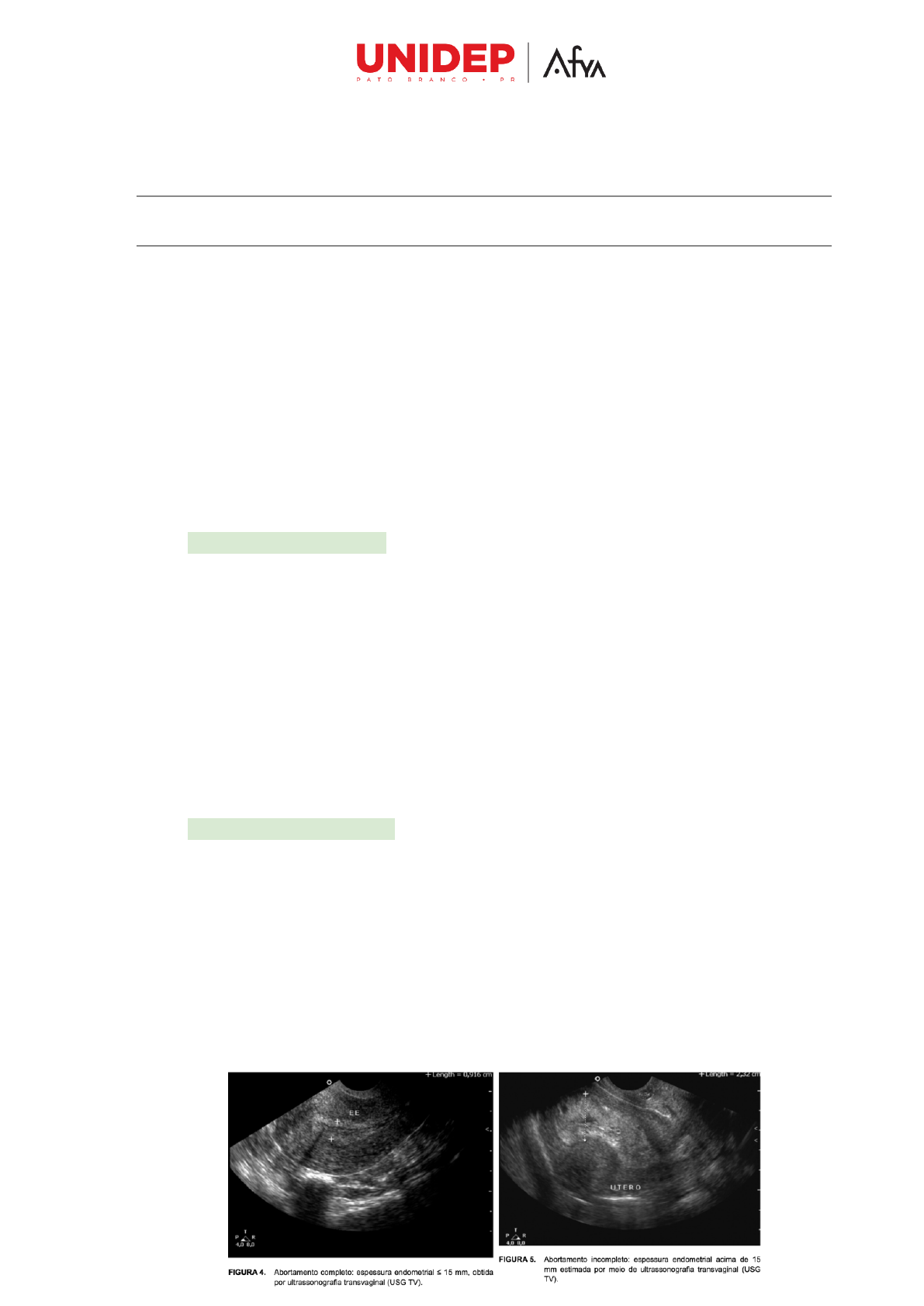 Beatricce, Rafaela e Rodrigo - 4º Período Medicina - 4º Período - UNIDEP TIC: Tipos de aborto. Problema: Quais os tipos de aborto? O aborto pode ser classificado das seguintes formas: QUANTO À INTENÇÃO: o abortamento pode ser espontâneo, se ocorrer sem ação deliberada de qualquer natureza, ou induzido (provocado), caso a interrupção da gestação seja resultante de interferência intencional antes de alcançadas as condições mínimas de sobrevivência extrauterina do produto conceptual. QUANTO À CRONOLOGIA: o abortamento é denominado como precoce se a perda gestacional ocorrer até 12 semanas e tardio, se ocorrer entre 13 e 20 a 22 semanas de gestação. • Além disso, pode ser classificado de acordo com suas apresentações clínicas: Abortamento completo: Expulsão completa do embrião ou feto. É comum quando o aborto ocorre no 1o trimestre da gravidez, principalmente nas 10 semanas iniciais. ● Rapidamente, o útero se contrai e o sangramento e as cólicas diminuem de intensidade. ● O orifício interno do colo uterino tende a fechar-se em poucas horas. ● Pode não haver conteúdo uterino no USG, mas, algumas vezes, observa-se pequena quantidade de conteúdo heterogêneo e líquido. ● A medida da espessura endometrial de até 15 mm ao corte longitudinal mediano do útero à USG transvaginal tem sido considerada iniciativa de aborto completo. Abortamento incompleto: ocorre eliminação parcial do feto ou embrião. É mais frequente após 10 semanas de gravidez. ● O sangramento vaginal persiste e, por vezes, torna-se intermitente. ● O volume uterino é menor que o esperado para a idade gestacional. ● No exame de toque: o orifício interno do colo uterino geralmente encontra-se pérvio, podendo, entretanto, algumas vezes apresentar-se fechado. ● USG: mostra a presença de conteúdo intrauterino de aspecto amorfo (forma indefinida) e heterogênea, com presença ou não de líquido. ● A espessura endometrial acima de 15 mm tem sido considerada indicativa de aborto incompleto. Beatricce, Rafaela e Rodrigo - 4º Período Aborto retido: morte embrionária ou fetal antes de 20 semanas de gravidez, associada à retenção do produto conceptual por período prolongado de tempo, por vezes dias ou semanas. ● Geralmente, as mulheres relatam cessação dos sintomas associados à gravidez (náuseas, vômitos, ingurgitamento mamário) ● Pode ocorrer sangramento vaginal, geralmente em pequena quantidade, semelhante ao observado nos casos de ameaça de abortamento. ● O volume uterino é menor que o esperado para a idade gestacional. ● Colo uterino fechado ao toque. ● Por meio da USG transvaginal denomina-se morte embrião a ausência de atividade cardíaca em embriões com comprimento cabeça-nádegas maior ou igual a 7mm. Gestação anembrionada: quando ocorre a reabsorção do embrião antes da confirmação ultrassonográfica ou o desenvolvimento deste não chega a ocorrer. Os principais critérios, por meio de ultrassonografia transvaginal, são: não visualização de embrião com diâmetro interno médio do saco gestacional ≥ 25 mm. Outros sinais de gestação inicial não evolutiva à USG transvaginal são: a ausência de embrião com atividade cardíaca após 2 semanas de USG transvaginal que evidenciou saco gestacional sem vesícula vitelínica ou, ainda, ausência de embrião com atividade cardíaca após 11 dias de USG transvaginal que visualizou saco gestacional com vesícula vitelínica. Muitas vezes, para confirmação diagnóstica, tanto nos casos de aborto retido quanto naqueles de gestação anembrionada, torna-se necessária a repetição do exame ultrassonográfico no prazo de uma semana. Aborto habitual/recorrente: definido como a ocorrência consecutiva de três ou mais abortamentos espontâneos em gestações clinicamente reconhecidas, em que há comprovação histológica ou ultrassonográfica do produto conceptual, excluindo gestações molares e ectópicas. Incide em cerca de 1 a 3% das mulheres. Abortamento infectado: muitas vezes encontra-se intimamente ligado à ilegalidade. A infecção que se inicia no útero (endomiometrite) pode se propagar para os anexos (anexite), peritônio pélvico (pelviperitonite), cavidade peritoneal (peritonite generalizada) e, ainda, disseminar-se por via hematogênica (sepse). Beatricce, Rafaela e Rodrigo - 4º Período O quadro clínico depende do grau de comprometimento da paciente. Endomiometrite: hipertermia, sangramento vaginal discreto, dores abdominais em cólica e útero doloroso à palpação. No toque vaginal, o colo uterino apresenta-se geralmente pérvio e doloroso à mobilização. No exame especular, observa-se saída de material purulento proveniente do canal cervical e podem estar presentes lacerações cervicais denunciadoras de abortamento provocado de forma clandestina. Nos casos mais graves, a paciente pode apresentar peritonite generalizada, sepse, insuficiência renal e coagulopatia. Referências Bibliográficas: ZUBAIB, M. Zugaib - Obstetrícia. 5. ed. Barueri: Manole, 2023. PORTO, Celmo C.; PORTO, Arnaldo L. Clínica Médica na Prática Diária . Grupo GEN, 2022.