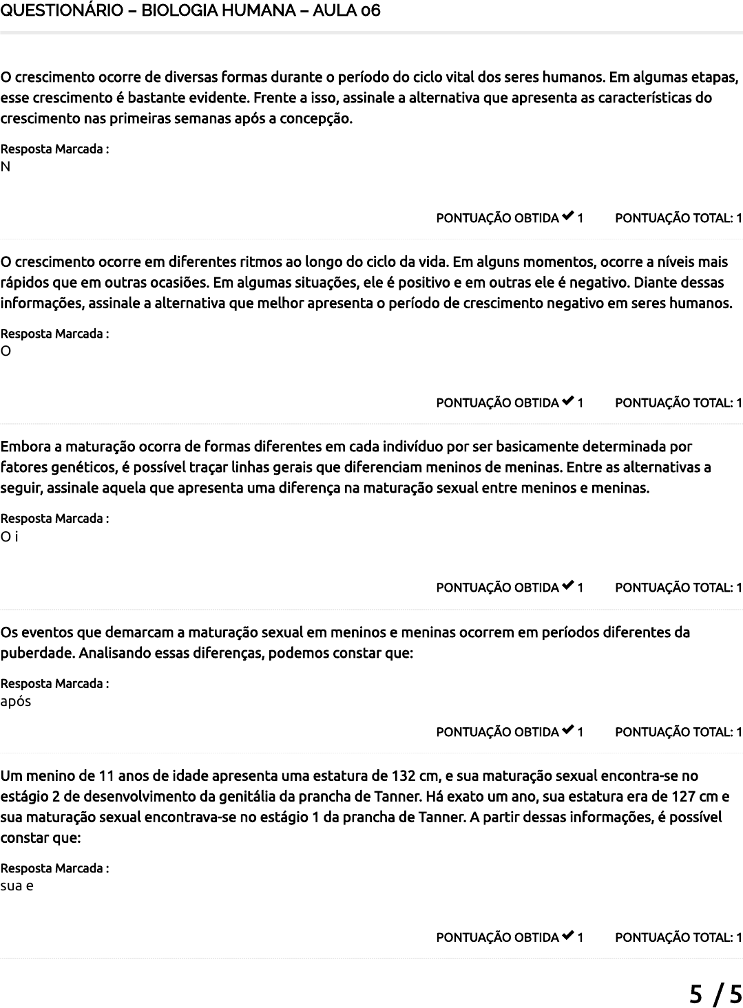 17/01/24, 13:20 Course Status – AVA Saúde Unifaveni https://ava.saude.unifaveni.com.br/course-status/ 1/1 5 / 5 QUESTIONÁRIO – BIOLOGIA HUMANA – AULA 06 PONTUAÇÃO TOTAL: 1PONTUAÇÃO OBTIDA 1 O crescimento ocorre de diversas formas durante o período do ciclo vital dos seres humanos. Em algumas etapas, esse crescimento é bastante evidente. Frente a isso, assinale a alternativa que apresenta as características do crescimento nas primeiras semanas após a concepção. Resposta Marcada : No início da vida intrauterina, há uma excepcional divisão celular, permitindo que o zigoto, após 8 semanas, apresente cerca 2 cm. PONTUAÇÃO TOTAL: 1PONTUAÇÃO OBTIDA 1 O crescimento ocorre em diferentes ritmos ao longo do ciclo da vida. Em alguns momentos, ocorre a níveis mais rápidos que em outras ocasiões. Em algumas situações, ele é positivo e em outras ele é negativo. Diante dessas informações, assinale a alternativa que melhor apresenta o período de crescimento negativo em seres humanos. Resposta Marcada : O crescimento negativo geralmente ocorre na velhice, motivado pela rigidez e pouca absorção de água dos discos intervertebrais e enfraquecimento da musculatura que mantém a coluna vertebral. PONTUAÇÃO TOTAL: 1PONTUAÇÃO OBTIDA 1 Embora a maturação ocorra de formas diferentes em cada indivíduo por ser basicamente determinada por fatores genéticos, é possível traçar linhas gerais que diferenciam meninos de meninas. Entre as alternativas a seguir, assinale aquela que apresenta uma diferença na maturação sexual entre meninos e meninas. Resposta Marcada : O início da maturidade sexual geralmente se apresenta mais cedo em meninas do que em meninos, tendo em vista que elas podem apresentar o desenvolvimento mamário a partir dos 6 anos de idade. PONTUAÇÃO TOTAL: 1PONTUAÇÃO OBTIDA 1 Os eventos que demarcam a maturação sexual em meninos e meninas ocorrem em períodos diferentes da puberdade. Analisando essas diferenças, podemos constar que: Resposta Marcada : após a menarca, as meninas geralmente apresentarão índices de crescimento em estatura anual em declínio. PONTUAÇÃO TOTAL: 1PONTUAÇÃO OBTIDA 1 Um menino de 11 anos de idade apresenta uma estatura de 132 cm, e sua maturação sexual encontra-se no estágio 2 de desenvolvimento da genitália da prancha de Tanner. Há exato um ano, sua estatura era de 127 cm e sua maturação sexual encontrava-se no estágio 1 da prancha de Tanner. A partir dessas informações, é possível constar que: Resposta Marcada : sua estatura está abaixo da média para sua idade, e ele, provavelmente, ainda não iniciou o estirão do crescimento. Total de Pontos