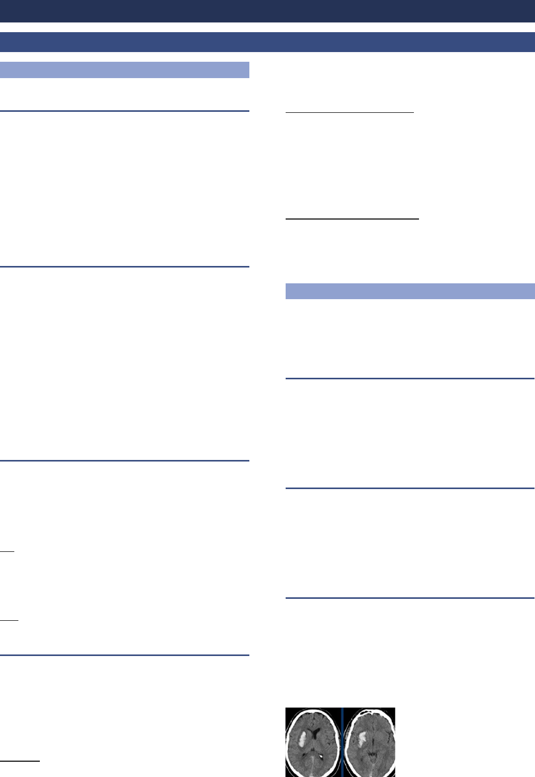 Polyana Túrmina Torres OSCE V – HAM NEURO AVCi e AVCh AVC ISQUÊMICO Oclusão arterial aguda. FATORES DE RISCO · Hipertensão arterial; · DM; · Obesidade; · Tabagismo; · Etilismo; · Sexo masculino; · Idade > 50 anos; · Raça negra. SINAIS E SINTOMAS Ramos carotídeos · Hemiparesia/hemiplegia; · Afasia (incapacidade da fala); · Paralisia facial; · Alterações de consciência. Ramos vertebrais · Alterações visuais; · Alteração de equilíbrio; · Alteração de nível de consciência. DIAGNÓSTICO · História clínica; · Exame físico (força, pares cranianos, babinski). · TC e RM. TC Não exclui AVC isquêmico. Isquemia fica preta e o sangre branco. RM Isquemia fica branca e sangue preto. TRATAMENTO · Controlar fatores de risco – preventivo. · Tratamento clinico; · Trombólise endovenosa; · Trombectomia mecânica. CLÍNICO · AAS 100 – 325 mg; · Estatina 40 mg. TROMBÓLISE ENDOVENOSA · Injeção endovenosa de trombolítico (alteplase); · 4h30 min após o início dos sintomas; · “Quebrar” o trombo e reestabelecer o fluxo sanguíneo. TROMBECTOMIA MECÂNICA · Remove o trombo com uso de aspiração ou stent – inserido pela artéria femoral; · Até 24 horas do início dos sintomas. AVC HEMORRÁGICO · Ruptura de um vaso: · Hemorragia intraparenquimatosa (HIP); · Hemorragia subaracnóide (HSA). FATORES DE RISCO · Hipertensão arterial (PRINCIPAL); · Obesidade; · Dislipidemia; · Tabagismo; · Sedentarismo. SINAIS E SINTOMAS · Alterações de nível de consciência; · Hemiparesia/hemiplegia; · Paralisia facial; · Alterações na marcha; · Cefaleia subida e de forte intensidade. DIAGNÓSTICO · História clinica; · Exame físico; · TC e RM · TC tem ótimo resultado em hemorragias. SANGUE = BRANCO TRATAMENTO · Tratamento conservador; · Tratamento cirúrgico. CONSERVADOR Hematomas pequenos causados por HAS; · Controlas fatores de risco; · Suporte clinico. CIRÚRGICO Hematomas grandes, causando hipertensão intracraniana. · Drenagem cirúrgica do hematoma; · Clipagem/embolização de aneurisma.