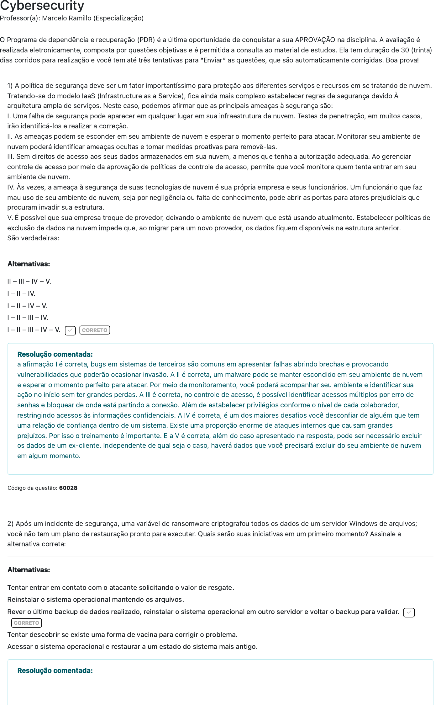 Cybersecurity Professor(a): Marcelo Ramillo (Especialização) 1) 2) O Programa de dependência e recuperação (PDR) é a última oportunidade de conquistar a sua APROVAÇÃO na disciplina. A avaliação é realizada eletronicamente, composta por questões objetivas e é permitida a consulta ao material de estudos. Ela tem duração de 30 (trinta) dias corridos para realização e você tem até três tentativas para “Enviar” as questões, que são automaticamente corrigidas. Boa prova! A política de segurança deve ser um fator importantíssimo para proteção aos diferentes serviços e recursos em se tratando de nuvem. Tratando-se do modelo IaaS (Infrastructure as a Service), fica ainda mais complexo estabelecer regras de segurança devido À arquitetura ampla de serviços. Neste caso, podemos afirmar que as principais ameaças à segurança são: I. Uma falha de segurança pode aparecer em qualquer lugar em sua infraestrutura de nuvem. Testes de penetração, em muitos casos, irão identificá-los e realizar a correção. II. As ameaças podem se esconder em seu ambiente de nuvem e esperar o momento perfeito para atacar. Monitorar seu ambiente de nuvem poderá identificar ameaças ocultas e tomar medidas proativas para removê-las. III. Sem direitos de acesso aos seus dados armazenados em sua nuvem, a menos que tenha a autorização adequada. Ao gerenciar controle de acesso por meio da aprovação de políticas de controle de acesso, permite que você monitore quem tenta entrar em seu ambiente de nuvem. IV. Às vezes, a ameaça à segurança de suas tecnologias de nuvem é sua própria empresa e seus funcionários. Um funcionário que faz mau uso de seu ambiente de nuvem, seja por negligência ou falta de conhecimento, pode abrir as portas para atores prejudiciais que procuram invadir sua estrutura. V. É possível que sua empresa troque de provedor, deixando o ambiente de nuvem que está usando atualmente. Estabelecer políticas de exclusão de dados na nuvem impede que, ao migrar para um novo provedor, os dados fiquem disponíveis na estrutura anterior. São verdadeiras: Alternativas: II – III – IV – V. I – II – IV. I – II – IV – V. I – II – III – IV. I – II – III – IV – V. CORRETO Código da questão: 60028 Após um incidente de segurança, uma variável de ransomware criptografou todos os dados de um servidor Windows de arquivos; você não tem um plano de restauração pronto para executar. Quais serão suas iniciativas em um primeiro momento? Assinale a alternativa correta: Alternativas: Tentar entrar em contato com o atacante solicitando o valor de resgate. Reinstalar o sistema operacional mantendo os arquivos. Rever o último backup de dados realizado, reinstalar o sistema operacional em outro servidor e voltar o backup para validar. CORRETO Tentar descobrir se existe uma forma de vacina para corrigir o problema. Acessar o sistema operacional e restaurar a um estado do sistema mais antigo. Resolução comentada: a afirmação I é correta, bugs em sistemas de terceiros são comuns em apresentar falhas abrindo brechas e provocando vulnerabilidades que poderão ocasionar invasão. A II é correta, um malware pode se manter escondido em seu ambiente de nuvem e esperar o momento perfeito para atacar. Por meio de monitoramento, você poderá acompanhar seu ambiente e identificar sua ação no início sem ter grandes perdas. A III é correta, no controle de acesso, é possível identificar acessos múltiplos por erro de senhas e bloquear de onde está partindo a conexão. Além de estabelecer privilégios conforme o nível de cada colaborador, restringindo acessos às informações confidenciais. A IV é correta, é um dos maiores desafios você desconfiar de alguém que tem uma relação de confiança dentro de um sistema. Existe uma proporção enorme de ataques internos que causam grandes prejuízos. Por isso o treinamento é importante. E a V é correta, além do caso apresentado na resposta, pode ser necessário excluir os dados de um ex-cliente. Independente de qual seja o caso, haverá dados que você precisará excluir do seu ambiente de nuvem em algum momento. Resolução comentada: 3) 4) 5) Código da questão: 60050 _____________é um tipo de fraude, cujo objetivo é obter acesso a dados confidenciais, como ___________ e __________. O usuário pensa que está indo para o site ___________, mas na verdade é redirecionado para um site falso. Os usuários são seduzidos por mensagens que supostamente vêm de ___________ confiáveis. Assinale a alternativa que completa adequadamente as lacunas: Alternativas: Ataque negação de serviço; número de cartão crédito; código de segurança; seguro; clientes. Phishing; número de cartão crédito; código de segurança; seguro; contatos Phishing; usuário; senha; seguro; remetentes. CORRETO Torrent; usuário; senha; seguro; acesso a dados. Injeção SQL; credencial de rede; senha; seguro; acesso a dados. Código da questão: 59996 É dever da TI compreender a importância de cada sistema, aplicativos, tráfego de dados, tipos de armazenamentos e maneiras de conexões para atender aos requisitos de segurança e não correr riscos de indisponibilidade nos serviços. A partir desta compreensão, que ações deverão ser desenvolvidas pela tecnologia da informação para evitar que ataques direcionados sejam bem-sucedidos? Assinale a alternativa correta. Alternativas: • Treinamento de conscientização de funcionários e processos de negócios. Hardware e software, treinamento de conscientização de funcionários, planos de restauração. Planos de restauração, treinamento de conscientização de funcionários e processos de negócios. Análises de riscos, treinamento de conscientização de funcionários. Hardware e software, treinamento de conscientização de funcionários e processos de negócios. CORRETO Código da questão: 60041 Sobre os métodos de arquitetura e desenvolvimento seguro