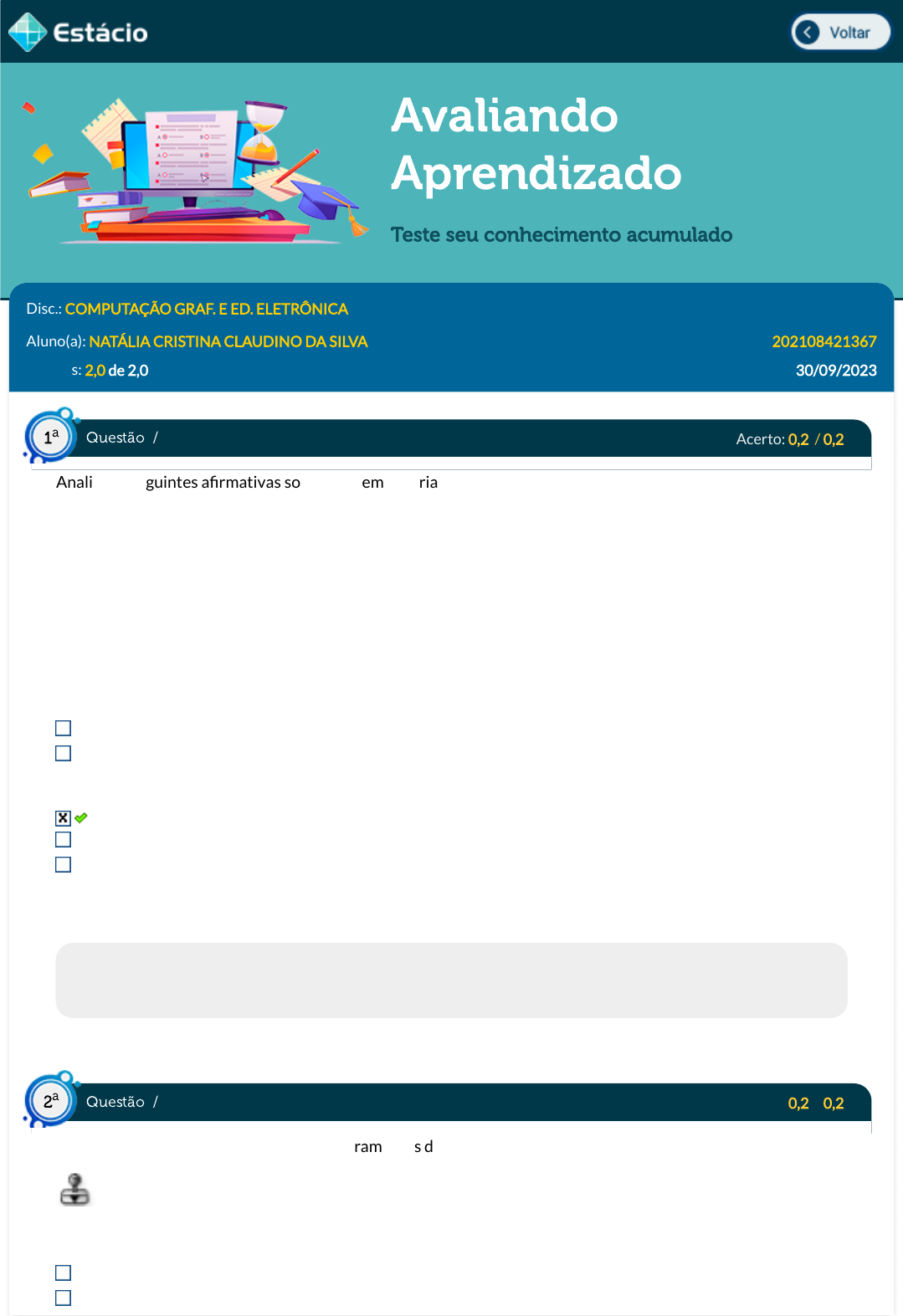 02/12/2023, 17:04 Estácio: Alunos https://simulado.estacio.br/alunos/ 1/5 Avaliando Aprendizado Teste seu conhecimento acumulado Disc.: COMPUTAÇÃO GRAF. E ED. ELETRÔNICA Aluno(a): NATÁLIA CRISTINA CLAUDINO DA SILVA 202108421367 Acertos: 2,0 de 2,0 30/09/2023 Acerto: 0,2 / 0,2 Analise as seguintes a�rmativas sobre imagem vetorial e assinale a alternativa que apresenta a sequência de letras CORRETA. I - A principal vantagem da imagem vetorial está no fato de que as propriedades da imagem não perdem qualidade ao ampliarmos a imagem. II - A desvantagem da imagem vetorial é sua limitação em não representar imagens fotográ�cas, pois não são digitalizadas e sim traçadas. III - Um vetor é menos detalhista e, geralmente, ocupa mais espaço que uma imagem bitmap simples. V - F - V F - V - V V - V - F V - V - V F - F - F Respondido em 30/09/2023 18:39:33 Explicação: Um vetor é mais detalhista e, geralmente, ocupa menos espaço que uma imagem bitmap simples. Acerto: 0,2 / 0,2 Considere o seguinte ícone da barra de ferramentas do Photoshop: O ícone representa: Ferramenta Alinhar Ferramenta Corte Questão / 1 a Questão / 2 a https://simulado.estacio.br/alunos/inicio.asp https://simulado.estacio.br/alunos/inicio.asp javascript:voltar(); javascript:voltar(); 02/12/2023, 17:04 Estácio: Alunos https://simulado.estacio.br/alunos/ 2/5 Ferramenta Carimbo Ferramenta Seleção Retangular Ferramenta Mover Respondido em 30/09/2023 18:38:07 Explicação: O ícone representa a Ferramenta Carimbo, uma espécie de pincel que copia partes selecionadas da imagem. Uma das ferramentas mais utilizadas para retoques. Acerto: 0,2 / 0,2 Um recurso importante de programas de edição de imagem bitmap, como o Photoshop, é a capacidade de trabalharmos com camadas. A imagem abaixo ilustra uma situação em que existem três camadas: background, balde e escova. Com base na janela de layers, podemos a�rmar que: somente os layers balde e escova podem trocar de posição; todos os layers podem trocar de posição; nenhum layer pode trocar de posição; as posições dos três layers podem ser trocadas livremente; somente o layer background pode trocar de posição. Respondido em 30/09/2023 18:40:32 Explicação: todos os layers podem trocar de posição; Questão / 3 a 02/12/2023, 17:04 Estácio: Alunos https://simulado.estacio.br/alunos/ 3/5 Acerto: 0,2 / 0,2 Considerando o seguinte ícone da barra de ferramentas do Photoshop, marque a opção que apresenta seu signi�cado correto: Ferramenta Borracha Ferramenta Mover Ferramenta Retângulo Ferramenta Borrar Ferramenta Formas Respondido em 30/09/2023 18:38:15 Explicação: A imagem representa a ferramenta borracha. Acerto: 0,2 / 0,2 Relacione o item da área de trabalho de Illustrator com a sua de�nição ou principal característica . 1. PAINEL DE CONTROLE ( ) Podem ser expandidas e movidas por toda a area de trabalho. 2. PALETAS ( ) Variam de acordo com a ferramenta selecionada. 3. SCRATCH AREA ( ) Reduz ou amplia a imagem. 4. MENU POP-UP ( ) Local reservado para rascunhos e estudos no Illustrator. Assinale a sequência correta: 1 2 3 4 1 2 4 3 2 4 1 3 2 1 4 3 2 1 3 4 Respondido em 30/09/2023 18:41:55 Explicação: 2 1 4 3 Acerto: 0,2 / 0,2 Para desenhar formas o recurso é mais fácil do que desenhar com Caneta e Lápis pois não necessita de muita precisão com o manuseio do mouse. Em relação ao desenho com formas podemos considerar correta a sentença: Para fazer o retângulo arredondado é necessário puxar a alça interna do retângulo. Questão / 4 a Questão / 5 a Questão / 6 a 02/12/2023, 17:04 Estácio: Alunos https://simulado.estacio.br/alunos/ 4/5 O processo mais usual para fazer formas é utilizando o mouse. Para fazer o círculo e o quadrado é necessário usar as teclas Ctrl ou Shift. A ferramenta Estrela faz estrelas de 6, 5, 4 e 3 pontas. Todas as ferramentas fazem exclusivamente as formas básicas. Respondido em 30/09/2023 18:43:13 Explicação: O processo mais usual para fazer formas é utilizando o mouse. Para fazer o círculo e o quadrado é necessário usar as teclas Alt ou Shift. Acerto: 0,2 / 0,2 Toda vez que você criar um documento deverá informar o modelo de cor que você vai trabalhar. O Illustrator possui por padrão os modelos: RGB, HSB, CMYK, Web Safe RGB e Grayscale. O modo RGB deve ser escolhido para qual tipo de trabalho ou momento do processo? Assinale a resposta correta. É aconselhável escolher este modo para impressos de pequeno formato. É aconselhável escolher este modo quando se trabalha com multimídia. É permitido usar este modo em projetos de edição de livros com imagens vinculadas. É obrigatório escolher este modo quando se faz transporte entre computadores. É obrigatório usar este modo em peças impressas em grá�cas rápidas. Respondido em 30/09/2023 18:45:04 Explicação: RGB e RGB Web Safe - Você pode escolher esses modos quando for trabalhar com multimídia. O modo RGB (Red, Green, Blue) é a tríade da cor luz e está presente em todos os dispositivos que possuem luz, incluindo TV e cinema. Acerto: 0,2 / 0,2 Sobre as Camadas do InDesign podemos a�rmar que: O programa InDesign trabalha com camadas apenas na página mestre e os elementos contidos nelas podem ser utilizadas nas páginas do projeto. O programa InDesign trabalha com camadas com os mesmos objetivos e da mesma maneira que o Photoshop e o Illustrator. O programa InDesign não trabalha obrigatoriamente com camadas pois utiliza o sistema de A-Master. As camadas do InDesign são utilizadas para texto enquanto o Link guarda e trata as imagens. O programa InDesign possui Camadas que vão de 1 a 1.000 unidades. Respondido em 30/09/2023 18:46:20 Explicação: Da mesma forma que o Photoshop e o Illustrator, o programa InDesign também trabalha com camada com os mesmos objetivos e da mesma maneira. Questão / 7 a Questão / 8 a 02/12/2023, 17:04 Estácio: Alunos https://simulado.estacio.br/alunos/ 5/5 Acerto: 0,2 / 0,2 Você apre