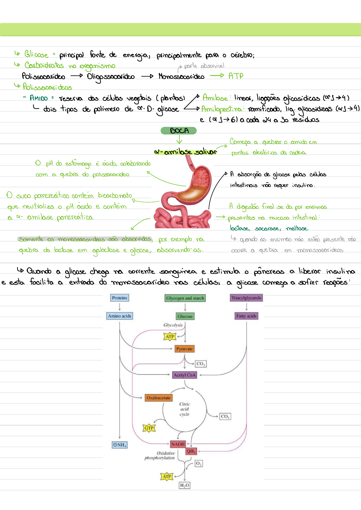 Glicemia ↳ Glicose = principal fonte de energia , principalmente para o cérebro ; ↳ Carboidratos no organismo - parte absorvivel Polissacarídeo Oligossacarídeo Monossacarídeo ATP ↳ Polissacarídeos - Amido = reserva das células vegetais (plantas Amilose : linear, ligações glicosídicas (94) ~ dois tipos de polímero de 9-D-glicose Amilopectiva : ramificado, lig. glicosidiens (44) e 191 61 a cada d4 a 50 residuos BOCA Começa a quebrar o amido em & - amilase salivar pontos aleatórios da cadeia O pH do estômago é ácido, colaborando com a quebra do polissacarídeo A absorção de glicose pelas células intestinais não requer insulina. O suco pancreático contem bicarbonato que neutraliza o pl ácido e contém A digestão final se da por enzimas a 4-amilase pancreática . presentes na mucosa intestinal : Lactase , sacarase , maltase . Somente os monossacarídeos são absorvidos, por exemplo na ↳ quando as enzimas não estão presente não quebra da lactose em galactose e glicose, absorvendo-as. Ocorre a quebra em monossacarídeos ↳ Quando a glicose chega na corrente sanguínea e estimula o pâncreas a liberar insulina e esta facilita a entrada do monossacarídeo nas células, a glicose começa a sofrer reações : Células dependentes de insulina = GLUT4 Células independentes de insulina : GLUT2 Célula dependente GLUT4 de insulina para receber glicose Estimulado por Estimulado por br ·alta glicose no baixa glicose no Sangue sangue. a ·Reduz a glicose Aumenta a glicose Insulina : além de ser um hormônio Fedo Glicogênio hipoglicemiante, também sinaliza a síntese de macromoléculas (proteina, Quando acaba a glicose ha a carboidratos , lipídeos e ácidos nucleicos). retirada de carbono de outras Lipídeo fontes, sendo o glicogênio, os doadiposo lipídeos e as proteinas. Proteina -Tecido muscular Pós-pradial Jejum -Oxidação de glicose gueagon INSULINA GLUCAGON insulina ~Glicogenálise ↑ Síntese de glicogênio ↑ Gliconeogenese ↓ Sintese de lipídeos · - ↓ Cetogenesee e↑ Síntese de proteina e · JEJUM 12h : depleção do glicogênio hepático e muscular ; · 94h : queda nos niveis de glicose sanguínea insulina lagong &Mobilização dos triacilglicerás (TAG) como fonte de energia : Ldegradação de proteinas não essenciais (gliconeogéneses : · Teste de O'Sullivan - Empregado para detectar o diabetes gestacional , sendo realizado entre 240 e a 28°sem-i -Paciente em jejum sendo administrada Jog de glicose em solução aquesa a 25 %- por via oral; anidra - Sangue edhido após uma horei - Resultados (a 140mg/dl indicam necessidade de um teste completo ; · Teste oral de Tolerância a Glicose -Medidas em Série da glicose plasmática ; - Tempos : O, 30 , 60 , 90 e 120min, - Administração de 75 y de glicose anidra oral.↓ M
