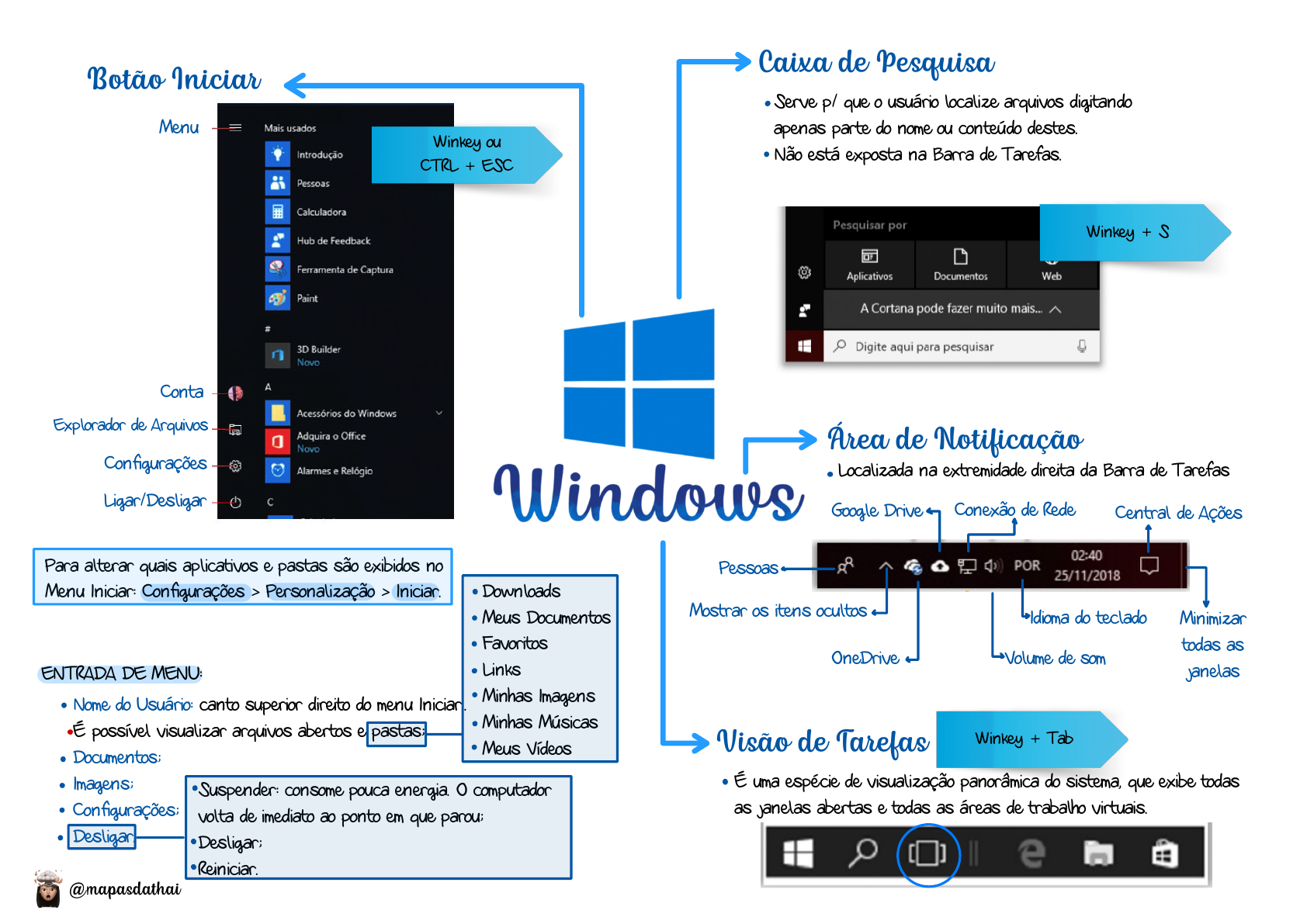 Menu Conta Explorador de Arquivos Configurações Ligar/Desligar Winkey ou CTRL + ESC Para alterar quais aplicativos e pastas são exibidos no Menu Iniciar: Configurações > Personalização > Iniciar. ENTRADA DE MENU: Nome do Usuário: canto superior direito do menu Iniciar.. É possível visualizar arquivos abertos e pastas; Documentos; Imagens; Configurações; Desligar. Downloads Meus Documentos Favoritos Links Minhas Imagens Minhas Músicas Meus Vídeos Suspender: consome pouca energia. O computador volta de imediato ao ponto em que parou; Desligar; Reiniciar. Visão de Tarefas Botão Iniciar Caixa de Pesquisa Serve p/ que o usuário localize arquivos digitando apenas parte do nome ou conteúdo destes. Não está exposta na Barra de Tarefas. Área de Notificação Localizada na extremidade direita da Barra de Tarefas Pessoas Mostrar os itens ocultos OneDrive Google Drive Conexão de Rede Volume de som Idioma do teclado Central de Ações Minimizar todas as janelas Winkey + S É uma espécie de visualização panorâmica do sistema, que exibe todas as janelas abertas e todas as áreas de trabalho virtuais. Winkey + Tab 7 ! " Janelas Barra de Títulos Geralmente lista o nome do programa e o arquivo que está sendo executado. É possível mover a janela mantendo o botão do mouse pressionado na barra de títulos. Duplo clique maximiza/restaura ao tamanho original. Faixa de opções Conjunto de funcionalidades agrupadas por temas. Formada por GUIAS > GRUPOS > COMANDOS. Cada guia representa uma área e contém comandos reunidos por grupos de funcionalidades em comum. Barra de Endereços Exibe o endereço da sua atual pasta (sua localização dentro do seu computador). Permite também digitar o endereço: de um recurso; de um servidor FTP; ou de uma página WEB. BOTÕES DE NAVEGAÇÃO Voltar Avançar Acima Direciona à pasta de nível anterior ao da pasta atual. Caixa de Pesquisa Permite realizar uma busca rápida por programas ou arquivos no computador. Painel de Navegação Acesso Rápido OneDrive Este Computador Rede Aparecerá somente em computadores conectados a uma rede. Painel de Visualização Permite visualizar o conteúdo do arquivo sem a necessidade de abri-lo. Painel de Detalhes Fica localizado na mesma posição do Painel de Visualização. Exibe detalhes ou metadados sobre um arquivo. Alternância entre Janelas ALT + TAB ALT + ESC Com caixa de diálogo Diretamente, sem caixa de diálogo. Snap É um método de redimensionar as janelas abertas, simplesmente arrastando-as p/ as bordas da tela. Winkey + setas Painel de Controle Sistema e Segurança Rede e Internet Hardware e Sons Programas Contas de Usuário Aparência e PersonalizaçãoRelógio e Região Facilidade de Acesso Segurança e Manutenção Windows Defender Firewall Sistema Opções de Energia Histórico de Arquivos Backup e Restauração (Windows 7) Espaços de Armazenamento Pastas de Trabalho Ferramentas Administrativas; Flash Player Central de Rede e Compartilhamento Opções da Internet Infravermelho Dispositivos e Impressoras Reprodução Automática Som Opções de energia Infravermelho Painel de Controle da NVIDIA Programas e Recursos Programas Padrão Java Item que deve ser acessado para desinstalar ou alterar um programa. Contas de Usuário Gerenciador de Credenciais Mail (Microsoft Outlook) Item que deve ser acessado para alterar o nome de usuário e o tipo de conta. Barra de Tarefas e Navegação Central de Facilidade de Acesso Opções do Explorador de Arquivos Fontes Painel de controle da NVIDIA Data e Hora Região Item que deve ser acessado para alterar o idioma, o teclado e outros métodos de entrada. Central de Facilidade de Acesso Reconhecimento de Fala± : o Lo Gerenciamento de Arquivos e Pastas Arquivos Pastas e Diretórios Caracteres Inválidos Manipulação de Arquivos por Comandos Explorador de Arquivos Seleção de Arquivos Lixeira Arquivo = coletânea de dados gravados em uma mídia p/ restauração posterior. São representados por nome + extensão. Ex: aula01.pdf Não é obrigatória, mas é recomendável, pois vincula o arquivo ao programa apto a abri-lo. Pasta = local para guardar arquivos. As pastas são dispostas em uma hierarquia organizada como uma árvore (árvore de diretórios). É possível localizar um arquivo por meio do seu caminho (Path Name), que deve ser especificado a partir do diretório raiz (topo da hierarquia). O diretório raiz é sempre representado por uma letra e corresponde à unidade de disco. O tamanho do caminho é limitado a 260 bytes Aspas (“) Dois-pontos (:) Asterisco (*) Menor que (<) Pipe (|) Maior que (>) Barra (/) Barra invertida (\) Interrogação (?) Através do Prompt de Comandos. Necessário conhecimento acerca dos comandos do MS-DOS. Winkey + R e digitar “cmd" Ferramenta que permite gerenciar arquivos, pastas, conexões de rede e realizar pesquisas. Winkey + E IMPORTANTE! MODOS DE EXIBIÇÃO: É possível selecionar um arquivo ou pasta com um clique do mouse ou usando as setas do teclado. SELEÇÃO DE MÚLTIPLOS ARQUIVOS/PASTAS: SHIFT: p/ intervalo de arquivos adjacentes; CTRL: p/ arquivos aleatórios, não adjacentes. Lixeira = pasta que armazena temporariamente os últimos arquivos excluídos do disco rígido. Os arquivos que estão nela podem ser recu- perados ou apagados definitivamente. Ao enviar um item p/ a lixeira, não se libera espaço em disco enquanto você não a esvaziar ou apagar o arquivo definitivamente. Para exclusão direta do arquivo basta utilizar o atalho SHIFT + DEL. iii. Gerenciamento de Arquivos e Pastas Copiar/Colar Mover/Recortar Cópias de arquivos CriarRenomear p/ outros dispositivos Excluir Localizar Selecione o arquivo e: 1. Início > Copiar (Grupo Area de Transferência) > Colar (Grupo Area de Transferência); 2. Botão direito do mouse > Copiar > botão direito do mouse > Colar; 3. Clicar no arquivo e arrastar até o destino pressionando a tecla CTRL (independe da unidade de disco); 4. CTRL+C (para copiar) > CTRL+V