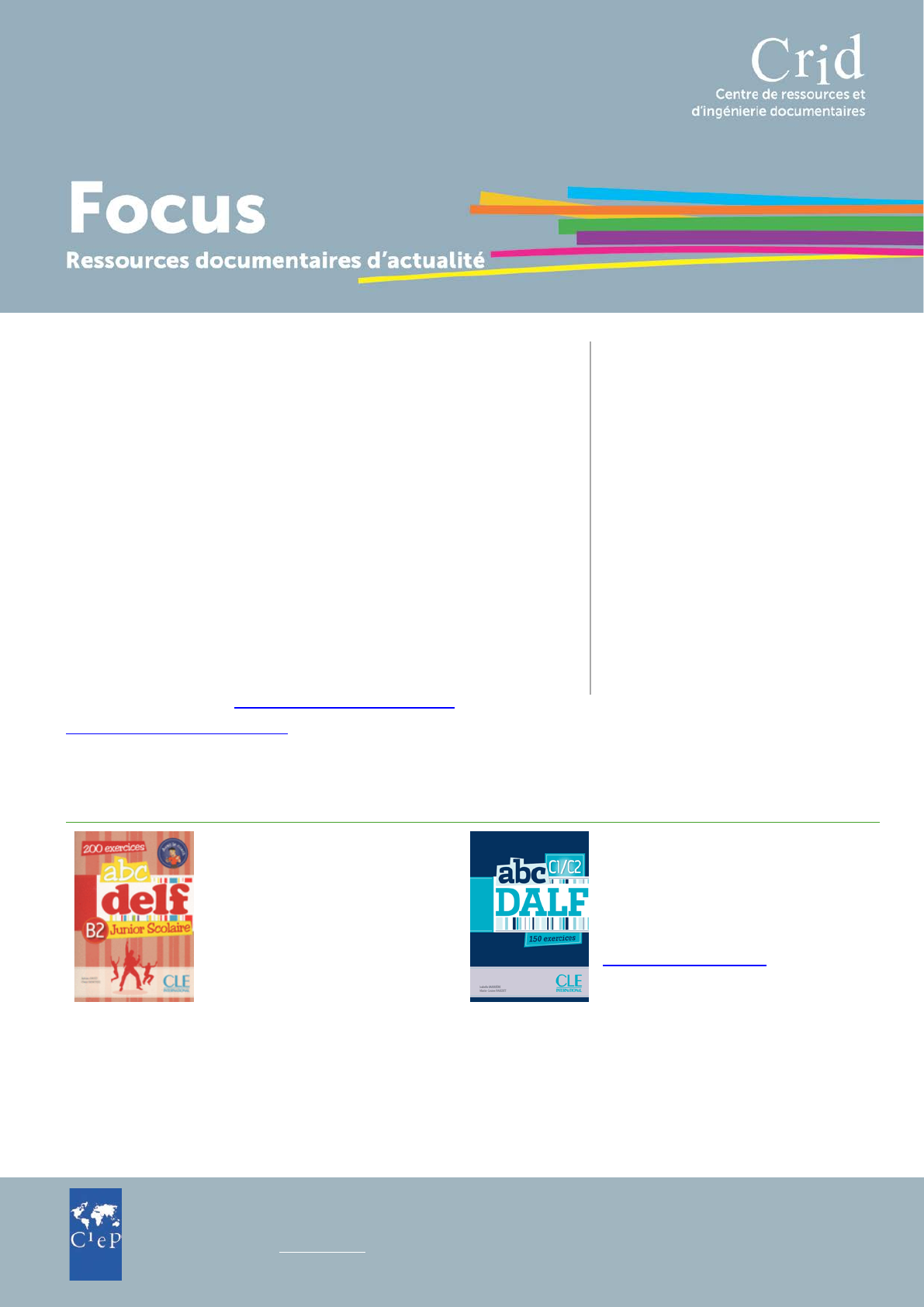 CENTRE INTERNATIONAL D’ÉTUDES PÉDAGOGIQUES Centre de ressources et d’ingénierie documentaires Rédactrice : Sol Inglada : inglada@ciep.fr - Téléphone : 33 (0)1 45 07 60 84 WWW.ciep.fr Ressources pour se préparer aux diplômes DELF – DALF Janvier 2016 Ce focus s'adresse aux candidats qui souhaitent s’entraîner pour passer les diplômes DELF-DALF, aux enseignants de FLE, aux formateurs DELF-DALF, ainsi qu’aux responsables des centres d'examen. Il recense les livres d’éditeurs français d’entraînement à ces diplômes et des sites internet qui proposent des exemples d’épreuves de production orale et écrite, des exemples de calibrage, des exemples de sujets ainsi que des sites avec des activités pour s'entraîner. Les ouvrages sont classés du plus récent au plus ancien. Ce focus est en ligne : http://www.ciep.fr/produits- documentaires/focus-publies NOUVEAUTÉS ÉDITORIALES 2015 PAYET Adrien , SANCHEZ Claire ABC DELF junior scolaire B2 CLE international, 2015, 207 p. + 47 p. + 1 DVD-rom BARRIERE Isabelle , PARIZET Marie- Louise Abc DALF C1/C2 : 150 exercices CLE international, 2015, 327 p. + 1 CD mp3 Feuilleter des extraits Sommaire Livres 2 DELF prim ........................................... 2 DELF scolaire et junior ...................... 3 DELF -dalf tout public ........................ 7 Sur internet 12 Exemples de sujets .......................... 12 Exercices pour s’entraîner ............... 12 Exemples d'épreuves de production orale et écrite .................................. 13 Exemples de calibrage d'une production orale .............................. 13 http://www.ciep.fr/produits-documentaires/focus-publies http://www.ciep.fr/produits-documentaires/focus-publies http://www.cle-inter.com/detail-9782090381795.html Focus Ressources pour se préparer aux diplômes DELF – DALF janvier 2016 2 LIVRES DELF Prim DELF Prim A1.1-A1 LAUNAY Maud, MARTY Roselyne DELF Prim A1 : livre de l'élève Hachette FLE, 2014, 96 p. Feuilleter des extraits BOLARD Claire, GILARDIN Catherine DELF Prim A1 : livre de l’élève CLE international, 2010, 127 p. + 24 p. + 1 CD audio Feuilleter des extraits DUPLEIX Dorothée, TAGLIANTE Christine Réussir le DELF Prim A1.1 - A1 Didier, 2010, 95 p. Feuilleter des extraits DUPLEIX Dorothée, TAGLIANTE Christine Réussir le DELF Prim A1.1 - A1 : guide pédagogique Didier, 2010, 47 p. + 1 CD audio http://www.hachettefle.com/ouvrages/pages/catalogue/fiche-livre/delf-prim-a1---livre-de-l-eleve---cd-audio-1559665.html http://www.cle-inter.com/detail-9782090380101.html http://www.editionsdidier.com/article/reussir-le-delf-prim-a1-a1-1-livre-2010/ Focus Ressources pour se préparer aux diplômes DELF – DALF janvier 2016 3 DELF scolaire et junior DELF scolaire et junior A1 CHAPIRO Lucile, PAYET Adrien Abc DELF junior scolaire : A1 CLE international, 2013, 176 p. + 1 DVD-ROM Feuilleter des extraits LIRIA Philippe, SIGE Jean-Paul En route vers... le DELF A1 scolaire et junior Editions Maison des Langues, 2011, 127 p. + 1 CD audio Feuilleter des extraits GODARD Emmanuel, LIRIA Philippe, SIGE Jean-Paul En route vers... le DELF A1 scolaire et junior : guide du professeur Editions Maison des Langues, 2010, 47 p. + 1 CD rom DUPUY Marjolaine, HOUSSA Catherine Réussir le DELF scolaire et junior A1 Didier, 2009, 128 p. + 1 CD audio Feuilleter des extraits DUPUY Marjolaine, HOUSSA Catherine Réussir le DELF scolaire et junior A1 : guide pédagogique Didier, 2009, 48 p. JAMET Marie-Christine DELF scolaire et junior A1 Hachette FLE, 2006, 128 p. + 1 CD audio https://www.cle-inter.com/detail-9782090381764.html http://www.emdl.fr/fle/collection/examens/0/en-route-vers-le-delf-scolaire-et-junior/reference/en-route-vers-le-delf-a1-scolaire-et-junior-livre-de-leleve/ http://www.editionsdidier.com/article/reussir-le-delf-scolaire-et-junior-a1-2009-livre-cd/ Focus Ressources pour se préparer aux diplômes DELF – DALF janvier 2016 4 DELF scolaire et junior A2 CHAPIRO Lucile, PAYET Adrien, SALLES Virginie Abc DELF junior scolaire A2 CLE international, 2012, 160 p. + 1 DVD-rom + 1 livret (32 p.) Feuilleter des extraits GODARD Emmanuel, LIRIA Philippe, SIGE Jean-Paul En route vers... le DELF A2 scolaire et junior Editions Maison des Langues, 2010, 127 p. + 1 CD audio Feuilleter des extraits GODARD Emmanuel, LIRIA Philippe, SIGE Jean-Paul En route vers... le DELF A2 scolaire et junior : guide du professeur Editions Maison des Langues, 2010, 48 p. + 1 CD audio Feuilleter des extraits MEGRE Bruno, MONIER Mélanie Réussir le DELF scolaire et junior A2 Didier, 2009, 126 p. + 1 CD audio Feuilleter des extraits MEGRE Bruno, MONIER Mélanie Réussir le DELF scolaire et junior A2 : guide pédagogique Didier, 2009, 48 p. JAMET Marie-Christine, CHANTELAUVE Odile DELF scolaire et junior A2 Hachette FLE, 2006, 127 p. + 1 livret (corrigés) + 1 CD audio http://www.cle-inter.com/detail-9782090381771.html http://www.emdl.fr/fle/collection/examens/0/en-route-vers-le-delf-scolaire-et-junior/reference/en-route-vers-le-delf-a2-scolaire-et-junior-livre-de-leleve/ http://www.emdl.fr/fle/collection/examens/0/en-route-vers-le-delf-scolaire-et-junior/reference/en-route-vers-le-delf-a2-scolaire-et-junior-guide-du-professeur/ http://www.editionsdidier.com/article/reussir-le-delf-scolaire-et-junior-a2-2009-livre-cd/ Focus Ressources pour se préparer aux diplômes DELF – DALF janvier 2016 5 DELF scolaire et junior B1 PAYET Adrien, SALLES Virginie Abc DELF junior scolaire B1 CLE international, 2012, + 1 DVD rom Feuilleter des extraits GODARD Emmanuel, LIRIA Philippe, SIGE Jean-Paul, et al. En route vers... le DELF B1 scolaire et junior Editions Maison des Langues, 2011, 141 p. + 1 CD audio Feuilleter des extraits GODARD Emmanuel, LIRIA Philippe, SIGE Jean-Paul En route vers... le DELF B1 scolaire et junior : guide du professeur Editions Maison des Langues, 2011, 56 p. + 1 CD audio LEPAGE Sylvie, MARTY Roseline Réussir le DELF scolaire et junior B1 Didier, 2009, 128 p. + 1 CD a