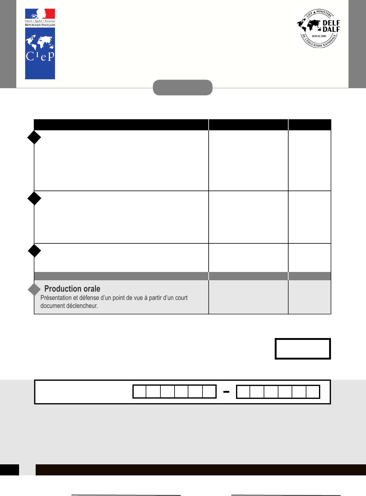 Nom : Prénom : CODE CANDIDAT : Seuil de réussite pour obtenir le diplôme : Note minimale requise par épreuve : Durée totale des épreuves collectives : 50/100 5/25 2 heures 30 minutes NOTE TOTALE : /100 S uj et _ d ém o _ B 2 TP Vole t à raba t t re pour p réserver l ’ anonymat du cand ida t 9 /25 /25 /25 30 minutes environ 1 heure Compréhension de l’oral Compréhension des écrits Production écrite Réponse à des questionnaires de compréhension portant sur deux documents enregistrés : • exposé, conférence, discours, documentaire, émission de radio ou télévisée (2 écoutes) ; • interview, bulletin d’informations, etc. (une seule écoute). Durée maximale des documents : 8 minutes Réponse à des questionnaires de compréhension portant sur deux documents écrits : • texte à caractère informatif concernant la France ou l’espace francophone ; • texte argumentatif. Prise de position personnelle argumentée (contribution à un débat, lettre formelle, article critique…). Production orale Présentation et défense d’un point de vue à partir d’un court document déclencheur. ÉPREUVES COLLECTIVES DURÉE NOTE SUR ÉPREUVE INDIVIDUELLE DURÉE NOTE SUR 1 2 3 /2520 minutes Préparation : 30 minutes 1 heure 4 DIPLÔME D’ÉTUDES EN LANGUE FRANÇAISE Niveau B2 du Cadre européen commun de référence pour les langues DELF B2 DELF B2 D O C U M E N T R É S E R V É A U C A N D I D A T - É P R E U V E S C O L L E C T I V E S 11 Compréhension de l’oral 25 points1 Page 1 sur 12 S uj et _ d ém o _ B 2 TP EXERCICE 1 18 points Vous allez entendre deux fois un enregistrement sonore de 5 minutes environ. Vous aurez tout d’abord 1 minute pour lire les questions. Puis vous écouterez une première fois l’enregistrement. Vous aurez ensuite 3 minutes pour commencer à répondre aux questions. Vous écouterez une seconde fois l’enregistrement. Vous aurez encore 5 minutes pour compléter vos réponses. Lisez les questions, écoutez le document puis répondez. Répondez aux questions en cochant ( ) la bonne réponse ou en écrivant l’information demandée.X 1 Qu’enseigne le professeur Michel Drancourt ? …………………………………………………………………………………………………. 1 point 2 Michel Drancourt… propose de conduire une étude... confirme les résultats d’une étude.... … sur les téléphones portables. conteste la méthodologie d’une étude... 1,5 point A B C 4 Pour quelle raison aucune étude sur les téléphones portables n’a été faite ? Ils n’avaient soulevé aucun soupçon. Ils étaient indispensables pour les médecins. Ils n’étaient pas fréquents dans les hôpitaux. 1 point A B C 3 D’après Michel Drancourt, quel problème pose le téléphone portable à l’hôpital ? …………………………………………………………………………………………………. 1,5 point 5 Citez deux autres objets qui ont servi pour le même type de recherche. a)………………………………………………………………………………………………… b)………………………………………………………………………………………….......... 1 point 6 Qu’est-ce qui surprend la journaliste ? …………………………………………………………………………………………………. …………………………………………………………………………………………………. 2 points DELF B2 D O C U M E N T R É S E R V É A U C A N D I D A T - É P R E U V E S C O L L E C T I V E S DELF B2 D O C U M E N T R É S E R V É A U C A N D I D A T - É P R E U V E S C O L L E C T I V E S Page 2 sur 12 S uj et _ d ém o _ B 2 TP 11 Que suggère la journaliste aux patients ? ................………………………………………………………………………………………. 2 points confirme les résultats d’une étude.... … sur les téléphones portables. 12 Michel Drancourt propose… d’interdire totalement l’utilisation du portable dans les hôpitaux. d’autoriser l’utilisation du portable pour les médecins uniquement. de réduire l’utilisation du portable par les médecins et les patients. 1 point A B C 10 Quel est, selon le professeur Drancourt, le rôle des médias dans le renforcement de l’hygiène ? ................……………………………………………………………………………………….. 1,5 point 7 Michel Drancourt considère qu’il est indispensable de… se laver systématiquement les mains à l’eau et au savon. se désinfecter les mains avec une solution hydro-alcoolique. se laver et, en plus, se désinfecter avec une solution hydro-alcoolique. 1 point A B C 8 Selon Michel Drancourt… la majorité des patients ne se désinfecte pas les mains. la totalité des hôpitaux dispose de solutions hydro-alcooliques. la majorité des médecins se désinfecte régulièrement les mains. 1 point A B C 9 Sur quoi portent les critiques du professeur Drancourt ? …………………………………………………………………………………………………. 1,5 point 13 Quelle est la conclusion de Michel Drancourt ? ................………………………………………………………………………………………. 2 points DELF B2 D O C U M E N T R É S E R V É A U C A N D I D A T - É P R E U V E S C O L L E C T I V E S Page 3 sur 12 S uj et _ d ém o _ B 2 TP EXERCICE 2 7 points Vous allez entendre une seule fois un enregistrement sonore de 1 minute 30 à 2 minutes. Vous aurez tout d’abord 1 minute pour lire les questions. Après l’enregistrement vous aurez 3 minutes pour répondre aux questions. Lisez maintenant les questions. 6 Mentionnez une branche de la médecine pour laquelle le don de sang est important. ................………………………………………………………………………
