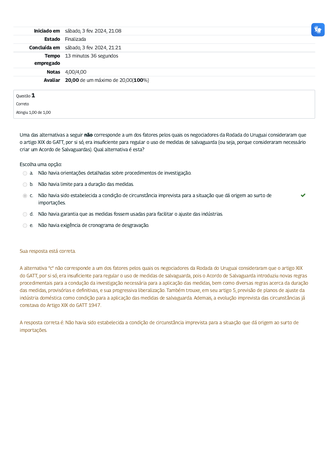 03/02/2024, 21:21 Exercício avaliativo - Módulo 4: Revisão da tentativa https://mooc41.escolavirtual.gov.br/mod/quiz/review.php?attempt=1747483&cmid=44593 1/4 Iniciado em sábado, 3 fev. 2024, 21:08 Estado Finalizada Concluída em sábado, 3 fev. 2024, 21:21 Tempo empregado 13 minutos 36 segundos Notas 4,00/4,00 Avaliar 20,00 de um máximo de 20,00(100%) Questão 1 Correto Atingiu 1,00 de 1,00 Uma das alternativas a seguir não corresponde a um dos fatores pelos quais os negociadores da Rodada do Uruguai consideraram que o artigo XIX do GATT, por si só, era insu�ciente para regular o uso de medidas de salvaguarda (ou seja, porque consideraram necessário criar um Acordo de Salvaguardas). Qual alternativa é esta? Escolha uma opção: a. Não havia orientações detalhadas sobre procedimentos de investigação. b. Não havia limite para a duração das medidas. c. Não havia sido estabelecida a condição de circunstância imprevista para a situação que dá origem ao surto de importações. d. Não havia garantia que as medidas fossem usadas para facilitar o ajuste das indústrias. e. Não havia exigência de cronograma de desgravação. Sua resposta está correta. A alternativa “c” não corresponde a um dos fatores pelos quais os negociadores da Rodada do Uruguai consideraram que o artigo XIX do GATT, por si só, era insu�ciente para regular o uso de medidas de salvaguarda, pois o Acordo de Salvaguarda introduziu novas regras procedimentais para a condução da investigação necessária para a aplicação das medidas, bem como diversas regras acerca da duração das medidas, provisórias e de�nitivas, e sua progressiva liberalização. Também trouxe, em seu artigo 5, previsão de planos de ajuste da indústria doméstica como condição para a aplicação das medidas de salvaguarda. Ademais, a evolução imprevista das circunstâncias já constava do Artigo XIX do GATT 1947. A resposta correta é: Não havia sido estabelecida a condição de circunstância imprevista para a situação que dá origem ao surto de importações. 03/02/2024, 21:21 Exercício avaliativo - Módulo 4: Revisão da tentativa https://mooc41.escolavirtual.gov.br/mod/quiz/review.php?attempt=1747483&cmid=44593 2/4 Questão 2 Correto Atingiu 1,00 de 1,00 A respeito de salvaguardas globais, quais os requisitos para aplicação? Escolha uma opção: a. Dumping, dano e nexo causal. b. Subsídios, dano e nexo causal. c. Evolução não prevista das circunstâncias, aumento signi�cativo das importações, prejuízo grave ou ameaça de sua ocorrência e causalidade. d. Evolução não prevista das circunstâncias, aumento signi�cativo das importações, dano e causalidade. e. Dumping, prejuízo grave ou ameaça de sua ocorrência e causalidade. Sua resposta está correta. A alternativa correta é a letra “c”. Uma vez que a aplicação de medidas de salvaguardas não pressupõe uma prática desleal de comércio, não há prática de dumping ou de concessão de subsídios que deva ser investigada como requisito para sua aplicação. No entanto é necessário demonstrar que, como resultado de acontecimentos imprevistos e do efeito de obrigações contraídas por meio do GATT, incluindo concessões tarifárias, houve aumento signi�cativo das importações, sob condições tais que causem ou ameacem causar prejuízos graves aos produtores nacionais de produtos similares ou diretamente concorrentes. A resposta correta é: Evolução não prevista das circunstâncias, aumento signi�cativo das importações, prejuízo grave ou ameaça de sua ocorrência e causalidade. 03/02/2024, 21:21 Exercício avaliativo - Módulo 4: Revisão da tentativa https://mooc41.escolavirtual.gov.br/mod/quiz/review.php?attempt=1747483&cmid=44593 3/4 Questão 3 Correto Atingiu 1,00 de 1,00 A respeito dos limites temporais de vigência de uma salvaguarda global e das condições para aplicação: a. A duração de uma medida de salvaguarda é de até quatro anos, prorrogáveis por, no máximo, mais quatros anos. Há exceção especí�ca para países em desenvolvimento, que podem aplicar medidas de salvaguardas por um período máximo de dez anos, considerando as prorrogações. b. Para a salvaguardas aplicadas por meio de sobretaxas, sempre que o prazo de duração for superior a um ano, deve-se ainda estipular um cronograma de liberalização progressiva. c. Para medida de salvaguarda aplicada na forma de restrição quantitativa, o Acordo estabelece que tal medida não poderá reduzir a quantidade das importações abaixo do nível médio veri�cado nos últimos dois anos representativos para o qual estão disponíveis estatísticas. d. Enquanto os demais países só podem aplicar novas medidas sobre o mesmo produto decorrido período igual àquele durante o qual se tenha aplicado anteriormente a medida, aos países em desenvolvimento é garantido o benefício de redução desse prazo à metade, desde que o período de não aplicação seja de ao menos dois anos. e. A duração da medida de salvaguarda provisória é limitada a 200 dias. Verdadeira Verdadeira Falsa Verdadeira Verdadeira Sua resposta está correta. A alternativa “c” é a única falsa. Para medida de salvaguarda aplicada na forma de restrição quantitativa, o Acordo estabelece que tal medida não poderá reduzir a quantidade das importações abaixo do nível médio veri�cado, em regra, nos últimos três anos representativos para os quais estejam disponíveis estatísticas. A resposta correta é: a. A duração de uma medida de salvaguarda é de até quatro anos, prorrogáveis por, no máximo, mais quatros anos. Há exceção especí�ca para países em desenvolvimento, que podem aplicar medidas de salvaguardas por um período máximo de dez anos, considerando as prorrogações. → Verdadeira, b. Para a salvaguardas aplicadas por meio de sobretaxas, sempre que o prazo de duração for superior a um ano, deve-se ainda estipular um cronograma de lib