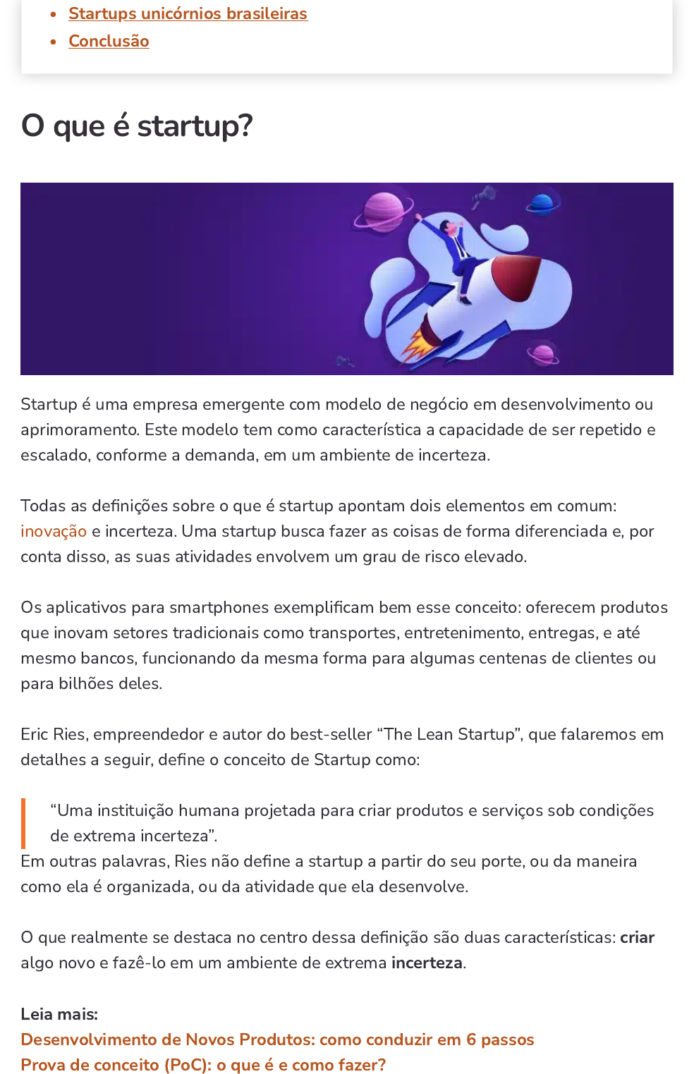 Startups unicórnios brasileiras Conclusão O que é startup? Startup é uma empresa emergente com modelo de negócio em desenvolvimento ou aprimoramento. Este modelo tem como característica a capacidade de ser repetido e escalado, conforme a demanda, em um ambiente de incerteza. Todas as de�nições sobre o que é startup apontam dois elementos em comum: inovação e incerteza. Uma startup busca fazer as coisas de forma diferenciada e, por conta disso, as suas atividades envolvem um grau de risco elevado. Os aplicativos para smartphones exempli�cam bem esse conceito: oferecem produtos que inovam setores tradicionais como transportes, entretenimento, entregas, e até mesmo bancos, funcionando da mesma forma para algumas centenas de clientes ou para bilhões deles. Eric Ries, empreendedor e autor do best-seller “The Lean Startup”, que falaremos em detalhes a seguir, de�ne o conceito de Startup como: “Uma instituição humana projetada para criar produtos e serviços sob condições de extrema incerteza”. Em outras palavras, Ries não de�ne a startup a partir do seu porte, ou da maneira como ela é organizada, ou da atividade que ela desenvolve. O que realmente se destaca no centro dessa de�nição são duas características: criar algo novo e fazê-lo em um ambiente de extrema incerteza. Leia mais: Desenvolvimento de Novos Produtos: como conduzir em 6 passos Prova de conceito (PoC): o que é e como fazer? https://blog.aevo.com.br/inovacao/ https://blog.aevo.com.br/desenvolvimento-de-novos-produtos/ https://blog.aevo.com.br/prova-de-conceito/ Características de uma startup Algumas características especí�cas nos ajudam a entender melhor o que é startup, e aproveitar as oportunidades que esse modelo de negócios oferece. Incerteza A primeira diferença entre uma empresa que opera com modelo tradicional e o de uma startup, de fato, está na incerteza enfrentada pelo segundo grupo. A Uber, por exemplo, que atualmente é uma das maiores empresas de mobilidade do mundo chegou ao mercado acreditando que as pessoas se sentiriam seguras ao entrar em carros normais, sem a identi�cação dos táxis. Esse comportamento é comum, hoje em dia, mas poderia ter sido rejeitado pelo mercado, levando a empresa ao fracasso. Inovação e flexibilidade Lançar um produto diferenciado é apenas o começo da inovação em uma startup. A partir daí, ela descobrirá novos problemas, e terá de enfrentá-los criando as próprias soluções, já que não existe manual de instruções de como lidar com eles. As respostas a que se chegam durante o processo, no entanto, podem se tornar inválidas em algumas semanas, e a startup deve ser �exível para se adaptar às novas realidades. Repetibilidade Para crescer com �rmeza, a startup precisa encontrar um modelo de negócios que possa ser facilmente repetido e padronizado. Se o empreendimento tiver que negociar cada venda, perderá tempo demais nesse processo. As opções de maior destaque costumam ser planos de assinatura, comissões por venda/serviço ou, no caso das redes sociais e plataformas de conteúdo, a venda de espaço publicitário e inteligência sobre o comportamento dos usuários. Escalabilidade A escalabilidade é o motivo pelo qual o uso de tecnologias digitais está intimamente ligado aos grandes destaques do setor, embora não seja o que de�na o que é uma startup. Idealmente, a startup deve aumentar rapidamente suas receitas sem que os custos acompanhem esse ritmo. Uma editora, por exemplo, tem gastos com papel, tinta, funcionários e transporte para cada unidade impressa, enquanto a Amazon pode vender o mesmo livro digital milhões de vezes com um gasto adicional muito pequeno. Qual é a relação entre startup e inovação? A relação entre inovação e startups é muito mais profunda do que a maioria das pessoas imagina. Qualquer notícia abordando uma startup de sucesso vai falar sobre uma grande ideia, levada adiante por um grupo de pessoas com determinação. Esse é apenas o começo da história: empreendedores e colaboradores precisam criar um ecossistema de inovação para que a startup seja próspera. Um espírito inovador precisa estar alinhado à execução perfeita, através da gestão de ideias realizada com ferramentas e metodologias adequadas. Um exemplo disso é o AEVO, plataforma que permite administrar todas as etapas de um projeto, da ideia à avaliação. O AEVO também conta com uma central de startups, onde organizações de maior estrutura encontram empresas inovadoras capazes de resolver questões especí�cas e podem gerenciar essa relação com e�ciência, facilitando os negócios para ambos os lados. 5 startups de sucesso para se inspirar Empresas inovadoras já tomaram conta de quase todos os mercados, e as histórias de sucesso que ajudam a explicar o que é startup vão muito além dos clássicos como Uber e Net�ix. Doghero https://blog.aevo.com.br/ecossistema-de-inovacao/ https://aevo.com.br/ https://aevo.com.br/? Um marketplace de serviços para pets, o DogHero permite contratar hospedagem, creche, cuidadores, passeios e veterinários, garantindo um portfólio com pro�ssionais quali�cados e bem avaliados para o trabalho. Após fusão com a Petlove, maior pet shop virtual no Brasil, as empresas anunciaram um ganho de R$ 100 milhões em sinergias, transformando a DogHero numa das startups mais rentáveis do país. Descomplica Considerada a 1ª grande empresa de educação digital do Brasil, a Descomplica se encaixa no grupo das EdTech, organizações que usam a tecnologia para oferecer serviços na área de ensino e treinamentos. Ao combinar educação e cultura pop, a Descomplica se tornou um fenômeno entre os estudantes, sobretudo aqueles que se preparam para o Enem, vestibulares fechados e concursos públicos. Hoje ela é uma fonte de estudos quase obrigatória para quem vai enfrentar essas provas. Boo-box Com um modelo de negócios que exibe publicidade para mais de 60 milhõ