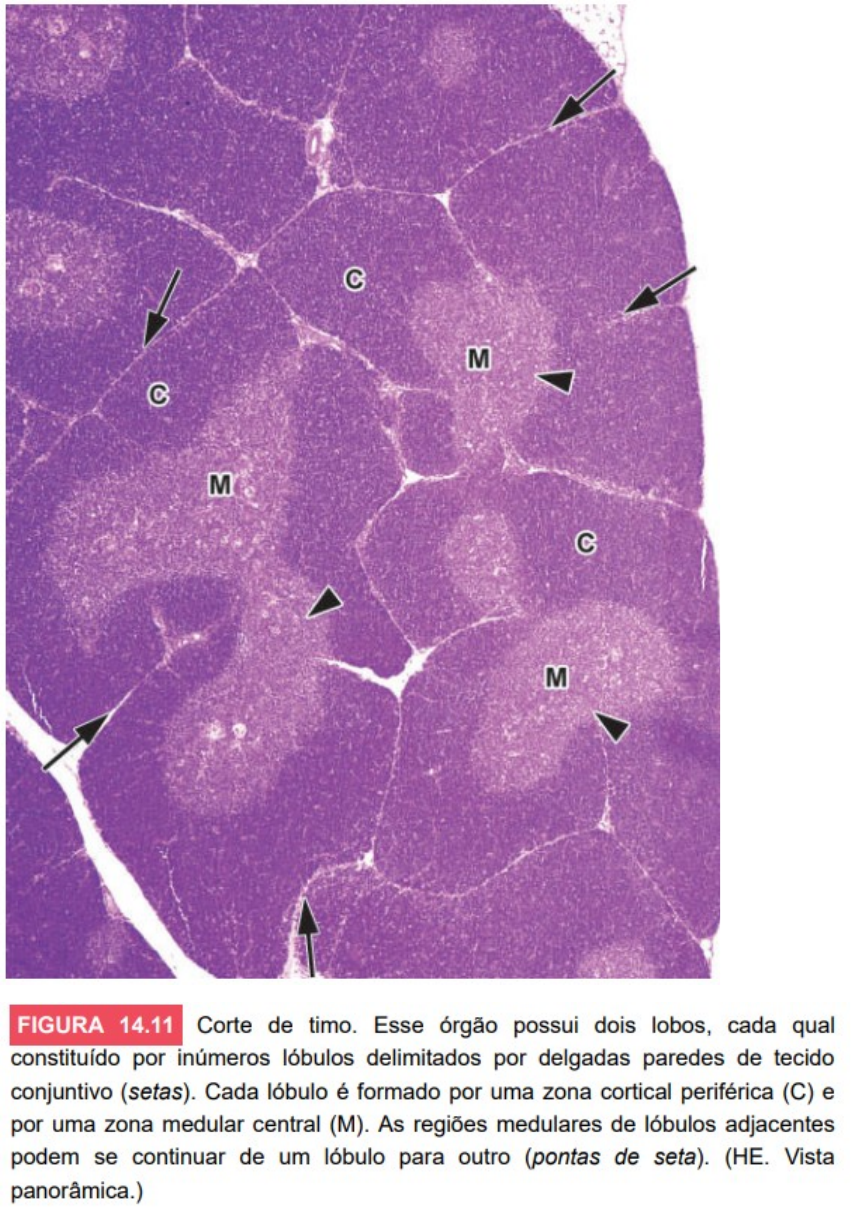 Timo ->As células mais abundantes do Timo são os Linfócitos T (Ocorre a maturação desses linfócitos T) ->O Timo apresenta 2 Lobos, que são formados por vários Lóbulos -> A região que circundam o Timo é composta por tecido conjuntivo e é chamada de Cápsula ->A Cápsula vai emitir várias invaginações que vão dividir parcialmente os Lobos em Lóbulos formadores do Timo, Essas invaginações vão ser chamadas de Septos ou Trabéculas ->Os linfócitos se concentram na parte do córtex do timo, a maioria dos linfócitos da parte cortical são imaturos e menores. Na parte medular há mais células reticulares epiteliais do que linfócitos, estes que são um pouco maiores com núcleo mais pálido. ->Corpúsculo de Hassal (Ou corpúsculo tímico)! 1- Córtex do Timo (Rico em Linfócitos T imaturos) – Mais Denso 2- Medula do Timo (Rico em células reticulares epiteliais e possuem quantidade menor de Linfócitos – agora um pouco maiores e com núcleo pálido, ou seja, mais maduros) –Menos Denso 3- Cápsula (Formado por tecido conjuntivo que envolve o Timo) 4- Séptos ou Trabéculas (Invaginações da Cápsula que dividem os Lobos em Lóbulos) 5- Corpúsculo de Hassal ou Corpúsculo Tímico (Formado por um conjunto de células reticulares que se unem e formam uma camada de queratina). IMAGEM APROXIMADA DO CORTEX DO TIMO 1-Linfócitos T imaturos (Núcleo escuro) 2- Pequenos vasos sanguíneos (trazem os linfócitos imaturos) 3-Células reticulares epiteliais (Formam um tipo de esqueleto da região cortical) 4-Macrófagos (possuem um núcleo mais claro) OBS.: Percebe-se que a região cortical do timo é mais densa do que a medular! IMAGEM AMPLIADA DA REGIÃO MEDULAR DO TIMO 1- Corpúsculo de Hassal (Ou Corpúsculo Tímico) 2- Células Reticulares Epiteliais 3- Linfócito T IMAGEM DE TRANSIÇÃO ENTRE CORTEX E MEDULA DO TIMO 1- Região Cortical do Timo (Córtex do Timo) –Muito Densa 2- Região Medular do Timo (Medula do Timo) – Pouco Densa Linfonodo ->Os linfonodos (antes chamados de gânglios linfáticos) são órgãos encapsulas constituídos por tecido linfoide, espalhados ao longo do trajetos dos vasos linfáticos. ->Os linfonodos são envolvidos por uma capsula (formada por tecido conjuntivo denso) que envia trabéculas para o seu interior, dividindo o parênquima em compartimento incompletos e interligados. As células do parênquima do órgão são sustentadas por um arcabouço de células reticulares e fibras reticulares, sintetizadas por essas células. ->A cápsula, as trabéculas e as fibras reticulares compõem o estroma dos linfonodos. ->Possui linfócitos T e B -> Na região dos nódulos linfáticos (folículos linfoides) predominam linfócitos B e na região paracortical predominam linfócitos T ->O parênquima do linfonodo apresenta uma região cortical, que se localiza abaixo da cápsula, ausente apenas na região do hilo, e uma região medular, que ocupa o centro do órgão e o seu hilo. Entre essas duas regiões, encontra-se a região cortical profunda, ou região paracortical. LINFONODO COMPLETO 1-Região Convexa do Linfonodo -Os vasos linfáticos aferentes chegam pela região convexa, trazendo a linfa que vai ser filtrada por essas células do córtex do linfonodo, chegando na região medular e saindo, por fim, pela região côncava, por meio de um vaso linfático eferente. Nessa filtração, microrganismos invasores podem ser combatidos, de modo a gerar uma reação inflamatória no linfonodo. 2-Região Côncava do Linfonodo/Hilo -Nessa região não há a presença da região cortical, apenas da medular. 3-Região Cortical do Linfonodo 4-Região Medular do Linfonodo 5-Nódulos Linfoides (Folículos Linfáticos) Região X – Região Cortical do Linfócito (Córtex do Linfócito) Região Y – Região Medular do Linfócito (Medula do Linfócito) 1- Cápsula 2- Trabéculas 3- Nódulos Linfoides (Folículos Linfáticos) – Predomínio de Linfócitos B 4- Centro Germinativo (Fica dentro de um folículo linfático) 5- ? 6-Região Paracortical/Região do Córtex profundo – Predomínio de Linfócitos T – “Região timo dependente” 7- Cordões Medulares 8- Seio Medular 1- Folículo Linfático Primário – Não possui centro germinativo e os linfócitos B estão inativos 2- Folículo Linfático Secundário – Possui centro germinativo e possui linfócitos B ativados IMAGEM AMPLIADA DA PARTE DO HILO DO LINFÓCITO 1-Células adiposas 1- Região paracortical/Região do Córtex Profundo – Predomínio de linfócitos T – provenientes do Timo 2- Região onde estão os folículos linfoides – Predomínio de linfócitos B