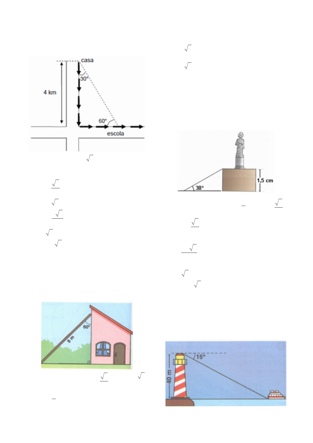 D5 – Resolver problema que envolva razões trigonométricas no triângulo retângulo (seno, cosseno, tangente). Para se deslocar de sua casa até a sua escola, Pedro percorre o trajeto representado na figura abaixo. Sabendo que 3)º60( =tg , a distância total, em km, que Pedro percorre no seu trajeto de casa para a escola é de: (A) 4 34 + (B) 34 + (C) 3 344 + (D) 34 (E) 344 + *************************************** Para consertar um telhado, o pedreiro Pedro colocou uma escada de 8 metros de comprimento numa parede, formando com ela um ângulo de 60º. Sabendo que: ( 2 3)º60( =sen , 3)º60( =tg 2 1)º60cos( = ). A altura da parede que o pedreiro apoiou a escada é: (A) 5 m. (B) 34 m (C) 8 m. (D) 38 m (E) 4 m *************************************** Para permitir o acesso a um monumento que está em um pedestal de 1,5 m de altura, será construída uma rampa com inclinação de 30º com o solo, conforme a ilustração abaixo: Sabendo que: ( 2 1)º30( =sen , 3 3)º30( =tg 2 3)º30cos( = ). A altura da parede que o pedreiro apoiou a escada é: (A) 3 35,4 m (B) 3 m. (C) 3 m (D) 35,1 + m. (E) 4 m ************************************** Do topo de um farol situado a 40 m acima do nível do mar, o ângulo de depressão de um barco (figura abaixo) é de 15º. 1 D5 – Resolver problema que envolva razões trigonométricas no triângulo retângulo (seno, cosseno, tangente). Sabendo que 32)º15( −=tg , a distância do barco ao farol é de: (A) )31(20 + m (B) )32(20 + m (C) )32(40 + m (D) )32(40 − m (E) )32(10 + m *************************************** Um caminhão sobe uma rampa inclinada 15º em relação ao plano horizontal. Sabendose que a distância HORIZONTAL que separa o início da rampa até o ponto vertical mede 24 m, a que altura, em metros, aproximadamente, estará o caminhão depois de percorrer toda a rampa? (A) 6. (B) 23. (C) 25 (D) 92 (E) 100 *************************************** Uma escada deve ser construída para unir dois pisos de um prédio. A altura do piso mais elevado em relação ao piso inferior é de 8 m. Para isso, é necessário construir uma rampa plana unindo os dois pisos. Se o ângulo da rampa com o piso inferior for 30º, o comprimento da rampa, em metros, é: (A) 4 (B) 38 (C) 8 (D) 16 (E) 316 *************************************** Duas ruas de uma cidade mineira encontramse em P formando um ângulo de 30º. Na rua Rita, existe um posto de gasolina G que dista 2 400 m de P, conforme mostra a ilustração abaixo. Sabendo que 86,0º30cos ≅ , 50,0º30 ≅sen e 68,0º30 ≅tg , a distância d, em metros, do posto G à rua Reila é aproximadamente igual a: (A) 1200 (B) 1392 (C) 0264 (D) 2790 (E) 4800 ************************************** Um triângulo ABC está inscrito numa semicircunferência de centro O. Como mostra o desenho abaixo. Sabese que a medida do segmento AB é de 12 cm. Qual é a medida do raio dessa circunferência? A) 6 cm B) 32 cm C) 12 cm D) 38 cm E) 24 cm *************************************** (Saresp 2001). O teodolito é um instrumento utilizado para medir ângulos. Um engenheiro aponta um teodolito contra o topo de um edifício, a uma distância de 100 m, e consegue obter um 2 D5 – Resolver problema que envolva razões trigonométricas no triângulo retângulo (seno, cosseno, tangente). ângulo de 55º. A altura do edifício é, em metros, aproximadamente: (A) 58 m (B) 83 m (C) 115 m (D) 144 m (E) 175 m ******************************************** (Saresp 2007). Os triângulos ABC e DEF, representados abaixo, são retângulos e semelhantes. Sabendo que o seno do ângulo α é igual a 4 3 . Qual é a medida da hipotenusa do triângulo DEF? (A) 18 (B) 28 (C) 30 (D) 32 (E) 40 ********************************************************* (Saresp 2007). Suponha que um avião decole sob um ângulo constante de 18º. Após percorrer 2 000 metros em linha reta, a altura H atingida pelo avião, em metros, é (A) 1 900 (B) 640 (C) 620 (D) 600 (E) 1000 m ****************************************************** (Saresp 2007). Nos triângulos retângulos representados na figura, qual é a medida da tangente do ângulo β? (A) 5 3 (B) 2 3 (C) 3 4 (D) 5 4 (E) 4 5 ******************************************************** (Saresp 2007). Para medir a distância que o separava de uma grande árvore, Beto caminhou 200 metros em uma direção perpendicular à linha imaginária que o unia à árvore. Em seguida, mediu o ângulo entre a direção em que andou e a linha imaginária que, agora, o unia à árvore, encontrando 60º. Nessas condições, a distância inicial entre Beto e a árvore era de aproximadamente 3 D5 – Resolver problema que envolva razões trigonométricas no triângulo retângulo (seno, cosseno, tangente). (A) 346 m (B) 172 m (C) 114 m (D) 100 m (E) 200 m 4