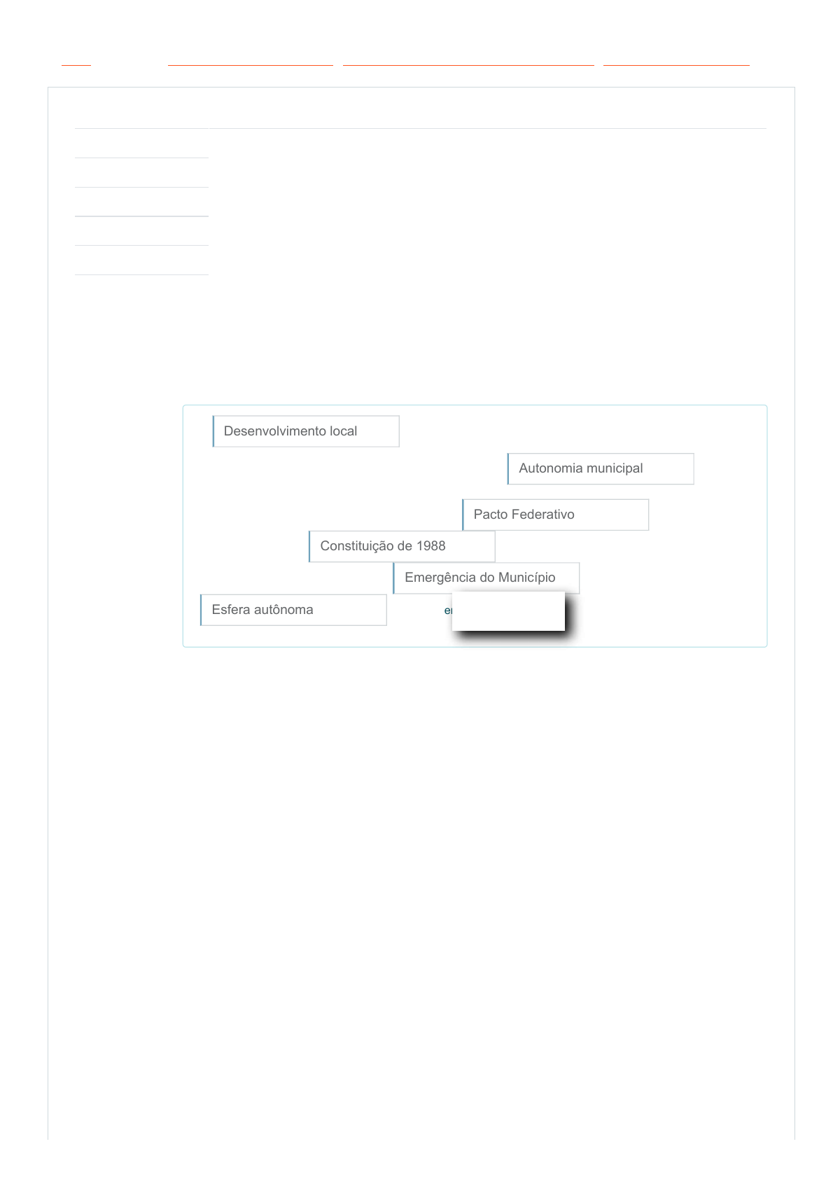 25/02/2022 09:42 Exercício Avaliativo - Módulo 3: Revisão da tentativa https://mooc38.escolavirtual.gov.br/mod/quiz/review.php?attempt=4015088&cmid=80945 1/7 Painel Meus cursos Políticas Públicas e Governo Local Módulo 3: Desenvolvimento Local e Sustentabilidade Exercício Avaliativo - Módulo 3 Iniciado em sexta, 25 fev 2022, 09:02 Estado Finalizada Concluída em sexta, 25 fev 2022, 09:42 Tempo empregado 39 minutos 55 segundos Notas 8,00/10,00 Avaliar 20,00 de um máximo de 25,00(80%) Questão 1 Correto Atingiu 1,00 de 1,00 O é um conceito que aponta primeiramente para a questão da , do protagonismo dos atores envolvidos e da capitalização dos resultados no próprio Município. A dimensão local ganhou mais atenção, ou espaço, com o novo institucionalizado na . O papel ou atribuição de cada um dos entes federados ficou mais claro, a partir da como uma de governo. Desenvolvimento local Autonomia municipal Pacto Federativo Constituição de 1988 Emergência do Município Esfera autônoma Correto Atingiu 1,00 de 1,00 https://mooc38.escolavirtual.gov.br/my/ https://mooc38.escolavirtual.gov.br/course/view.php?id=4259 https://mooc38.escolavirtual.gov.br/course/view.php?id=4259#section-3 https://mooc38.escolavirtual.gov.br/mod/quiz/view.php?id=80945 25/02/2022 09:42 Exercício Avaliativo - Módulo 3: Revisão da tentativa https://mooc38.escolavirtual.gov.br/mod/quiz/review.php?attempt=4015088&cmid=80945 2/7 Questão 2 Correto Atingiu 1,00 de 1,00 O desenvolvimento econômico costuma estar associado à variação, ao longo do tempo, da renda per capita em um dado sistema econômico. Algumas políticas ou linhas de ação que podem ser usadas na abordagem, e a identificação de oportunidades de ação que promovam o desenvolvimento econômico local são: A Legislação Municipal — tributária, de obras, de posturas etc. — deve tornar mais simples e fácil a vida dessas empresas. O governo municipal pode instituir ou aprimorar — caso já exista — a feira livre e os mercados públicos, nos quais produtos locais são comercializados. A promoção de exposições, feiras, congressos e outros eventos de caráter comercial fortalece atividades econômicas locais, divulga seus produtos, constrói intercâmbio e contribui para aumentar a oferta de emprego e renda. Os municípios brasileiros vêm desenvolvendo iniciativas no campo das microfinanças, com oferta de crédito para empreendedores que não têm acesso ao sistema financeiro tradicional. Tratamento diferenciado para micro e pequenas empresas Apoio à comercialização Acesso a serviços financeiros 25/02/2022 09:42 Exercício Avaliativo - Módulo 3: Revisão da tentativa https://mooc38.escolavirtual.gov.br/mod/quiz/review.php?attempt=4015088&cmid=80945 3/7 Essa ação se dá por meio da inclusão, na grade curricular das escolas municipais, de modo que estudantes obtenham informações sobre o mercado de trabalho e desenvolvam capacidade de iniciar e gerir negócios. Trata-se de prestigiar os fornecedores locais, posto que o Município é, em muitas localidades, o principal comprador. A compra de alimentos, uniformes e outros bens para as escolas e para os programas sociais no comércio local resulta maior movimento econômico, além das consequências positivas que isso acarreta. Acesso à capacitação de recursos humanos e ao empreendedorismo Compras locais Sua resposta está correta. 25/02/2022 09:42 Exercício Avaliativo - Módulo 3: Revisão da tentativa https://mooc38.escolavirtual.gov.br/mod/quiz/review.php?attempt=4015088&cmid=80945 4/7 Questão 3 Correto Atingiu 1,00 de 1,00 Questão 4 Correto Atingiu 1,00 de 1,00 É o resultado que se espera alcançar no processo de desenvolvimento de uma sociedade, uma vez que permitirá à população ter mais acesso a bens e serviços. Quando uma sociedade avança no sentido do seu desenvolvimento, é esperado, do ponto de vista da qualidade de vida das pessoas, que haja um aprimoramento, natural resultante do trabalho coletivo do conjunto da sociedade. Esse texto caracteriza que tipo de desenvolvimento? Escolha uma opção: a. Econômico b. Sustentável c. Urbano d. Social O Desenvolvimento Social é o resultado que se espera alcançar no processo de desenvolvimento de uma sociedade, uma vez que permitirá à população ter mais acesso a bens e serviços. Quando uma sociedade avança no sentido do seu desenvolvimento, é esperado, do ponto de vista da qualidade de vida das pessoas, que haja um aprimoramento, natural resultante do trabalho coletivo do conjunto da sociedade. e. Interpessoal Sua resposta está correta. Em relação ao financiamento da saúde no Município existe uma questão-chave quanto aquilo que pode ou não ser considerado no cálculo do percentual, apesar da Legislação apontar para as definições sobre as ações e serviços de promoção, proteção e recuperação da saúde. Assinale a alternativa que informa corretamente o valor percentual aplicado e a legislação correlata: Escolha uma opção: a. 10% da arrecadação de impostos/ Lei nº 141/2012 b. 15% da arrecadação de impostos/ Lei nº 141/2012 Vale ainda lembrar que o financiamento da saúde no Município exige a aplicação de 15% da arrecadação de impostos, segundo a Lei nº 141/2012. Contudo, há uma questão-chave aqui, pois sempre podem haver divergências em relação aquilo que pode ou não ser considerado nesse cálculo, apesar da Lei nº 8.080/1990 apontar para tais definições sobre as ações e serviços de promoção, proteção e recuperação da saúde. c. 20% da arrecadação de impostos/ Lei nº 8.080/1990 d. 10% da arrecadação de impostos/ Lei nº 8.080/1990 e. 10% da arrecadação de impostos/ Lei nº 8.212/1991 Sua resposta está correta. 25/02/2022 09:42 Exercício Avaliativo - Módulo 3: Revisão da tentativa https://mooc38.escolavirtual.gov.br/mod/quiz/review.php?attempt=4015088&cmid=80945 5/7 Questão 5 Incorreto Atingiu 0,00 de 1,00 Questão 6 Correto Atingiu 