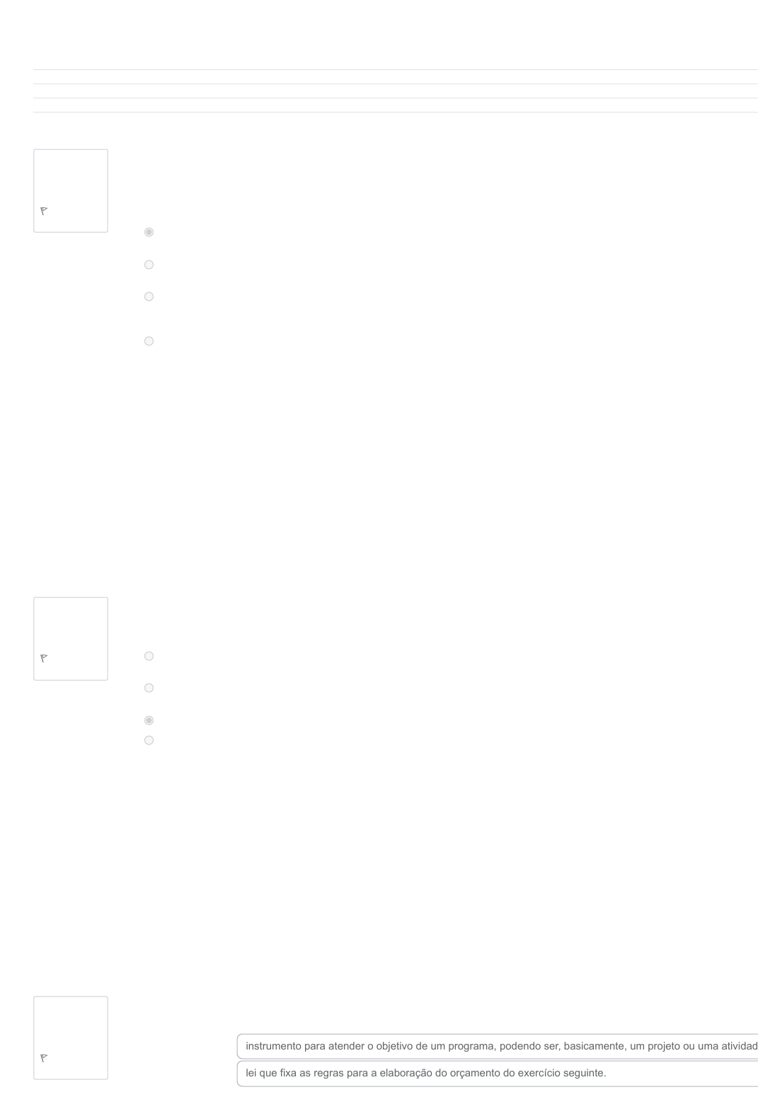 29/01/2024, 11:18 Exercícios de fixação - Módulo 2: aula 1: Revisão da tentativa https://mooc41.escolavirtual.gov.br/mod/quiz/review.php?attempt=1625529&cmid=38769 1/2 Questão 1 Completo Não avaliada Marcar questão Questão 2 Completo Não avaliada Marcar questão Questão 3 Completo Não avaliada Marcar questão Iniciado em segunda-feira, 29 jan. 2024, 11:17 Estado Finalizada Concluída em segunda-feira, 29 jan. 2024, 11:18 Tempo empregado 1 minuto 5 segundos QUESTIONÁRIO Exercícios de fixação - Módulo 2: aula 1 O prefeito do seu município ficou sabendo que a prefeitura do município vizinho estaria recebendo recursos da União por meio de convênio. Assinale a alternativa que NÃO representa as atividades preliminares para o prefeito do seu município formular proposta para a celebração de transferência voluntária: Escolha uma opção: a. Identificar todos os programas federais que descentralizam recursos para os entes federados e, a partir daí, elaborar projetos e propostas para a celebração de convênios e contratos de repasse; b. identificar as necessidades locais, definir uma escala de prioridades dentre as necessidades identificadas e pesquisar os programas federais que poderiam repassar os recursos necessários para os projetos desejados; c. fazer um levantamento dos principais problemas locais, com identificação de causas e efeitos, reunindo evidências com o objetivo de desenhar alternativas para escolher a mais vantajosa para tratar o problema e gerar valor público (solução efetiva, viável e desejada pela comunidade beneficiada); d. ouvir a comunidade por meio de audiências públicas durante a elaboração e aprovação do orçamento municipal para identificar prioridades de investimento e tomar decisões sobre as ações que dependeriam de ajuda do estado e da União. Sua resposta está correta. a única alternativa errada é a “Identificar todos os programas federais que descentralizam recursos para os entes federados e, a partir daí, elaborar projetos e propostas para a celebração de convênios e contratos de repasse;”, já que a captação dos recursos não deve condicionar a proposição de TVU. As demais alternativas representam atividades importantes que o gestor deve fazer antes de buscar recursos junto à União: inventário das principais necessidades e priorização da demanda local, evitando escolher projetos a partir da oferta de recursos dos programas federais; construir a agenda local a partir das evidências dos problemas, escolhendo alternativas que eliminem ou reduzam as suas causas e efeitos, ou seja, soluções efetivas e sustentáveis; e tomar decisões ouvindo a comunidade a fim de garantir transparência e participação social na construção de soluções que agregam valor para os beneficiários. A resposta correta é: Identificar todos os programas federais que descentralizam recursos para os entes federados e, a partir daí, elaborar projetos e propostas para a celebração de convênios e contratos de repasse; Marque a única alternativa ERRADA: Escolha uma opção: a. conhecer os programas federais é fundamental para subsidiar o planejamento de projetos para propor convênios e contratos de repasse com a União; b. é possível saber como acessar os recursos dos programas federais por meio da Plataforma +Brasil e de informações publicadas pelos gestores dos programas nas suas respectivas páginas na internet; c. todos os programas federais possuem recursos que podem ser pleiteados pelos estados e municípios; d. na elaboração dos programas federais são feitos diagnósticos dos problemas a serem tratados, com indicadores que podem ser usados para sustentar as evidências e formas possíveis de tratamento. Sua resposta está correta. a única alternativa errada é a “todos os programas federais possuem recursos que podem ser pleiteados pelos estados e municípios;”, já que nem todos os programas federais operam transferências voluntárias, apenas aqueles que estão indicados na Plataforma +Brasil. As demais afirmativas estão corretas, conforme estudamos nesta aula: conhecer os programas federais após a priorização das necessidades locais ajuda na decisão de quais ações e projetos poderiam ser apoiados com recursos da União; as fontes mais indicadas para conhecer os programas que transferem recursos, bem como as suas exigências e condições, são a Plataforma +Brasil e as páginas da internet dos respectivos programas federais; e conhecer o desenho dos programas federais pode trazer subsídios ao diagnóstico dos problemas locais, pois eles devem ser desenhados a partir de diagnósticos, indicadores e dados que evidenciam os problemas e soluções. A resposta correta é: todos os programas federais possuem recursos que podem ser pleiteados pelos estados e municípios; Relacione o conceito orçamentário indicado na primeira coluna com a definição indicada na segunda coluna: ação orçamentária LDO instrumento para atender o objetivo de um programa, podendo ser, basicamente, um projeto ou uma atividad lei que fixa as regras para a elaboração do orçamento do exercício seguinte. 29/01/2024, 11:18 Exercícios de fixação - Módulo 2: aula 1: Revisão da tentativa https://mooc41.escolavirtual.gov.br/mod/quiz/review.php?attempt=1625529&cmid=38769 2/2 Questão 4 Completo Não avaliada Marcar questão modalidade de aplicação OGU classificação de despesa que indica de que forma os recursos serão aplicados: diretamente, pela unidade de reúne todas as receitas e despesas da União, organizadas na LOA, compreendendo os orçamentos fiscal, da Sua resposta está correta. as ações orçamentárias são instrumentos usados no orçamento para indicar os bens (projetos) e serviços (atividades) que contribuem para atender ao objetivo de um programa; a Lei de Diretrizes Orçamentárias, como o próprio nome indica, estabelece as diretrizes e regras para a elaboração do orçamento público anual; 