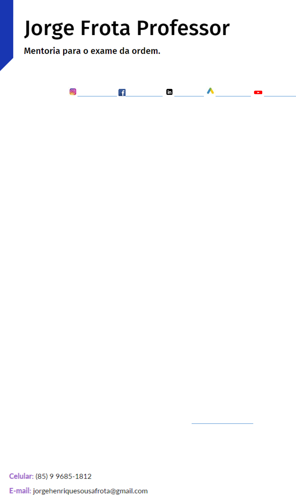 REDES SOCIAIS INSTAGRAM FACEBOOK LINKEDIN JUSBRASIL YOUTUBE. DEZ CONCEITOS DE DIREITO TRIBUTÁRIO POR JORGE HENRIQUE SOUSA FROTA – MENTORIA EXAME DA ORDEM INFORMAÇÃO 01 (HUGO DE BRITO MACHADO) 01 Definiu Direito Tributário como “ramo do Direito que se ocupa das relações entre o fisco e as pessoas sujeitas a imposições tributárias de qualquer espécie, limitando o poder de tributar e protegendo o cidadão contra os abusos deste poder”. INFORMAÇÃO 02 (PAULO DE BARROS CARVALHO) 02 “O Direito Tributário é o ramo didaticamente autônomo do Direito, integrado pelo conjunto de proposições jurídico-normativas, que correspondam, direta ou indiretamente, à instituição, arrecadação e fiscalização de tributos”. INFORMAÇÃO 03 (LUCIANO AMARO) 03 O Direito Tributário “é a disciplina jurídica dos tributos, com o que se abrange todo o conjunto de princípios e normas reguladores da criação, fiscalização e arrecadação das prestações de natureza tributária”. INFORMAÇÃO 04 (EDUARDO SABBAG) 04 “O Direito Tributário é a representação positivada da ciência jurídica que abarca o conjunto de normas e princípios jurídicos, reguladores das relações intersubjetivas na obrigação tributária, cujos elementos são as partes, a prestação e o vínculo jurídico”. INFORMAÇÃO 05 (ZELMO DENARI) 05 O Direito Tributário é o “ramo do direito público que regula as normas relativas à imposição, fiscalização e arrecadação de tributos e disciplina a relação entre fisco e contribuinte". INFORMAÇÃO 06 (JORGE HENRIQUE SOUSA FROTA) 06 Direito tributário pode ser conceituado como ramo jurídico de direito público que se caracteriza por ser predominantemente obrigacional, e que objetiva, ou seja, possui como finalidade regular o instituto jurídico nominado de tributo, que é toda prestação pecuniária compulsória, em moeda ou cujo valor nela se possa exprimir, que não constitua sanção de ato ilícito, instituída em lei e cobrada mediante atividade administrativa plenamente vinculada, bem como os sujeitos da relação jurídica tributária (contribuinte, responsável legal e os “fiscos” federal, estaduais, distrital e municipais). A regulação acima indicada se dá de forma ampla, contemplando a instituição, arrecadação e fiscalização de todas as espécies tributárias (impostos, taxas, contribuição de melhoria, empréstimos compulsórios e contribuições especiais) e possui como fundamento “mor” a Constituição Federal que estabelece a competência tributária dos entes federativos e assegura inúmeras garantias aos contribuintes, nominadas de limitações constitucionais ao poder de tributar, a saber: 1. Legalidade; 2. Isonomia; 3. Irretroatividade; 4. Anterioridade de exercício; 5. Anterioridade nonagesimal; 6. Proibição do confisco; 7. Liberdade de tráfego; 8. https://www.instagram.com/professorjorgefrota/ https://www.facebook.com/profile.php?id=61550228615991 https://www.linkedin.com/in/jorge-henrique-sousa-frota-954999252/ https://jhfrota.jusbrasil.com.br/ https://www.youtube.com/channel/UCpZ72emKhlY52R55PhFE1OA https://www.jusbrasil.com.br/legislacao/129432/constituicao-da-republica-federativa-do-brasil-1988 https://www.youtube.com/channel/UCpZ72emKhlY52R55PhFE1OA Uniformidade geográfica; 9. Não diferenciação tributária; 10. Imunidades tributárias, além de outras limitações. INFORMAÇÃO 07 (PAULO CALIENDO) 07 “O direito tributário é ramo didaticamente autônomo do direito público que estuda validade e eficácia das normas jurídico-tributárias, que impõe o dever constitucional de pagar tributos”. INFORMAÇÃO 08 (RUY BARBOSA NOGUEIRA) 08 O Direito Tributário “é a disciplina da relação entre Fisco e Contribuinte, resultante da imposição, arrecadação e fiscalização dos impostos, taxas e contribuições”. INFORMAÇÃO 09 (PEDRO NUNES APUD ROBERTO DE PAULA) 09 Direito Tributário é o “Ramo do direito público que compreende um conjunto de normas coercitivas que estabelecem relações jurídicas entre os contribuintes e o Estado, direitos e deveres de ambos e dos agentes fazendários; regula o sistema tributário e disciplina o lançamento, a arrecadação, fiscalização e aplicação dos impostos em geral, taxas e contribuições”. INFORMAÇÃO 10 (CLÁUDIO BORBA) 10 “O Direito Tributário é um ramo do Direito Público com objeto, princípios e institutos próprios, mas que tem uma relação de dependência com os demais ramos, dada a unicidade do Direito”. REFERÊNCIAS 01. MACHADO, Hugo de Brito. Curso de Direito Tributário. 33ª ed. São Paulo: Malheiros, p. 51. 02. CARVALHO, Paulo de Barros. Curso de Direito Tributário. 13ª ed. São Paulo: Saraiva, 2000, p. 15. 03. AMARO, Luciano. Direito Tributário Brasileiro. 20º. ed. São Paulo: Saraiva, 2014, p.24. 04. SABBAG, Eduardo. Manual de direito tributário. 6º ed. São Paulo: Saraiva, 2014, p. 35. 05. DENARI, Zelmo. Curso de Direito Tributário. 4º ed. Rio de Janeiro: Forense, 1994, pp. 9 -10. 06. FROTA, Jorge Henrique Sousa. Na busca ideal de um conceito para o direito tributário Conteudo Jurídico, Brasilia-DF: 24 ago 2022, 04:08. Disponivel em: https://conteudojuridico.com.br/consulta/Artigos/59062/na-busca-ideal-de-um- conceito-paraodireito-tributrio. Acesso em: 04 dez 2023. 07. CALIENDO, Paulo. Curso de Direito Tributário. 2º edição. São Paulo: Saraiva, 2019, p. 16. 08. NOGUEIRA, Ruy Barbosa. Curso de direito tributário. 11ª ed. São Paulo: Saraiva, 1989. 09. DE PAULA, Roberto Oliveira. Conceito de Direito Tributário. 2014. Disponível em link. Acesso em 18 de setembro de 2021. https://conteudojuridico.com.br/consulta/Artigos/59062/na-busca-ideal-de-um-conceito-para-o-direito-tributrio https://conteudojuridico.com.br/consulta/Artigos/59062/na-busca-ideal-de-um-conceito-para-o-direito-tributrio https://jus.com.br/artigos/34132/conceito-de-direito-tributario 10. BORBA, Cláudio. Direito Tributário. 28ª