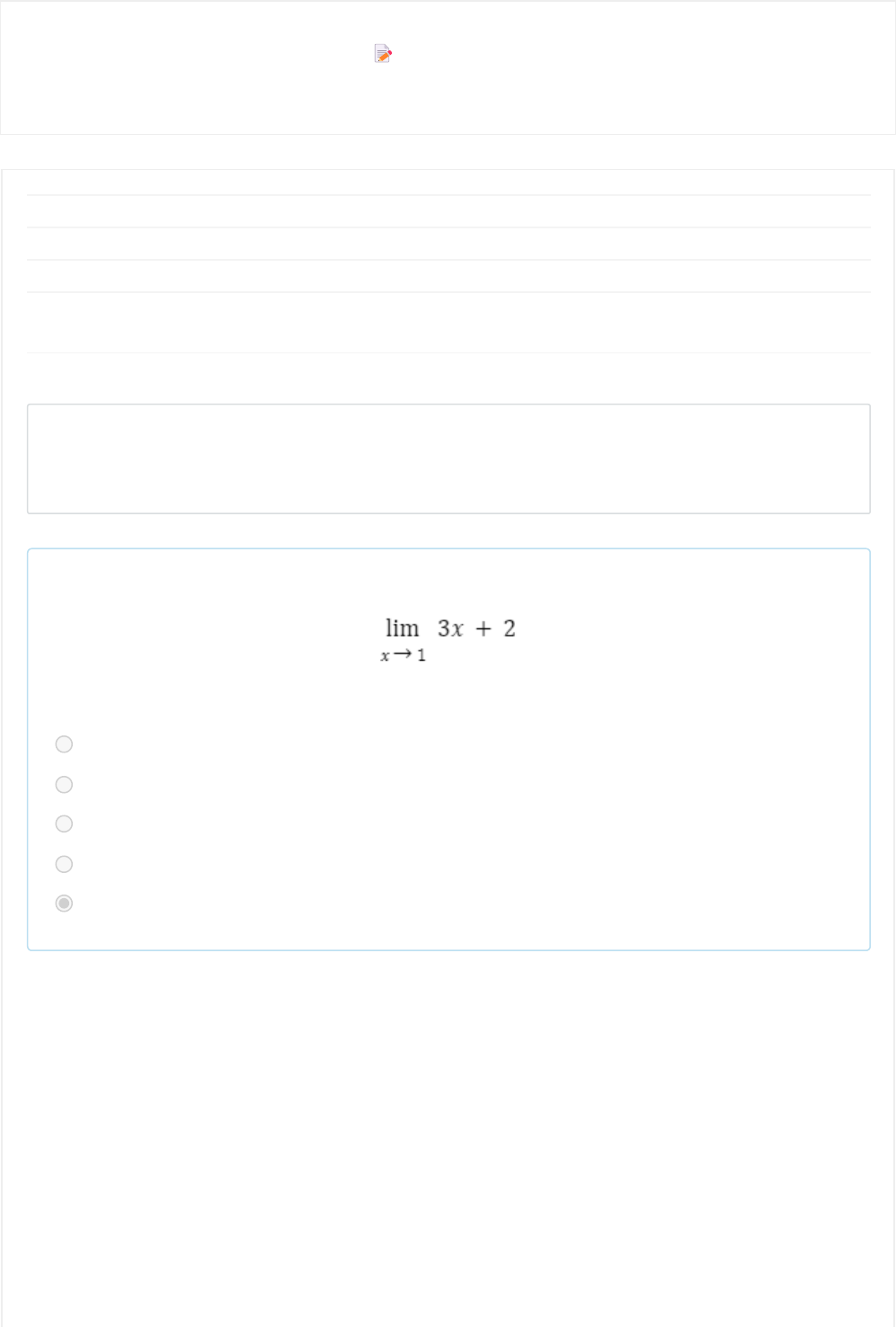 03/02/2024, 15:12 ATIVIDADE ONLINE 1 - AV12024/1 https://moodle.ead.unifcv.edu.br/mod/quiz/review.php?attempt=3414758 1/6 Painel / Meus cursos / CDIUVENGP / 📝 AVALIAÇÕES 2024/1 / ATIVIDADE ONLINE 1 - AV12024/1 Iniciado em sábado, 3 fev 2024, 14:12 Estado Finalizada Concluída em sábado, 3 fev 2024, 15:12 Tempo empregado 1 hora Avaliar 1,00 de um máximo de 2,00(50%) Questão 1 Incorreto Atingiu 0,00 de 0,20 Assinale a alternativa que contém a resposta do limite a seguir: Escolha uma opção: a. 5 b. 4 c. 1 d. 2 e. 3 https://moodle.ead.unifcv.edu.br/my/ https://moodle.ead.unifcv.edu.br/my/ https://moodle.ead.unifcv.edu.br/course/view.php?id=1537 https://moodle.ead.unifcv.edu.br/course/view.php?id=1537#section-5 https://moodle.ead.unifcv.edu.br/mod/quiz/view.php?id=160719 03/02/2024, 15:12 ATIVIDADE ONLINE 1 - AV12024/1 https://moodle.ead.unifcv.edu.br/mod/quiz/review.php?attempt=3414758 2/6 Questão 2 Incorreto Atingiu 0,00 de 0,20 Dado e . Calcule: Assinale a alternativa que apresenta a resposta correta. Escolha uma opção: a. 55 b. 56 c. 57 d. 53 e. 54 Questão 3 Correto Atingiu 0,20 de 0,20 Calcule Assinale a alternativa que apresenta a resposta correta. Escolha uma opção: a. 8,0 b. 7,0 c. 7,5 d. 8,5 e. 9 f(x) = −x3 x2 g(x) = x 03/02/2024, 15:12 ATIVIDADE ONLINE 1 - AV12024/1 https://moodle.ead.unifcv.edu.br/mod/quiz/review.php?attempt=3414758 3/6 Questão 4 Correto Atingiu 0,20 de 0,20 Dado , calcule o Assinale a alternativa que apresenta a resposta correta. Escolha uma opção: a. 1 b. 0 c. 2 d. e. 9 Questão 5 Correto Atingiu 0,20 de 0,20 Dado , calcule o Assinale a alternativa que apresenta a resposta correta. Escolha uma opção: a. b. 6 c. 0 d. 7 e. +∞ −∞ +∞ 03/02/2024, 15:12 ATIVIDADE ONLINE 1 - AV12024/1 https://moodle.ead.unifcv.edu.br/mod/quiz/review.php?attempt=3414758 4/6 Questão 6 Incorreto Atingiu 0,00 de 0,20 Dado , calcule Assinale a alternativa que apresenta a resposta correta. Escolha uma opção: a. b. 7 c. d. 7,5 e. 9 Questão 7 Incorreto Atingiu 0,00 de 0,20 Dado , calcule Assinale a alternativa que apresenta a resposta correta. Escolha uma opção: a. 9 b. c. d. 7,0 e. 7,5 −∞ +∞ −∞ +∞ 03/02/2024, 15:12 ATIVIDADE ONLINE 1 - AV12024/1 https://moodle.ead.unifcv.edu.br/mod/quiz/review.php?attempt=3414758 5/6 Questão 8 Correto Atingiu 0,20 de 0,20 Ache o intervalo que é solução da seguinte sentença . Assinale a alternativa que apresenta a resposta correta. Escolha uma opção: a. b. c. d. e. Questão 9 Incorreto Atingiu 0,00 de 0,20 Encontre o domínio da seguinte equação , dentro do conjunto dos números reais. Escolha uma opção: a. [-9,+∞) b. [9,+∞) c. [10,+∞) d. [3,+∞) e. [-3,+∞) 4x + 2 > 2x + 5 x > 3 x > 5 x > 1, 5 x < 1, 5 x < 3 f(x) = x − 9 − −−−− √ 03/02/2024, 15:12 ATIVIDADE ONLINE 1 - AV12024/1 https://moodle.ead.unifcv.edu.br/mod/quiz/review.php?attempt=3414758 6/6 Questão 10 Correto Atingiu 0,20 de 0,20 Dada a seguinte função assinale a alternativa correta Escolha uma opção: a. f(1) = 4 b. f(3) = 4 c. Não ha imagem negativa para a função acima. d. f(2) = 8 e. f(2) = 4 f(x) = +x4 x2
