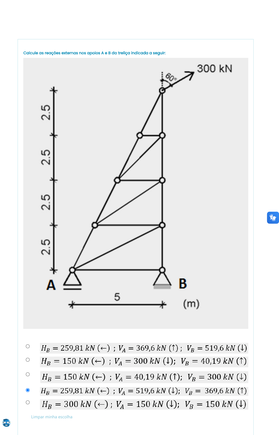 Questão 1 Ainda não respondida Vale 1,0 ponto(s). Calcule as reações externas nos apoios A e B da treliça indicada a seguir: a. b. c. d. e. Limpar minha escolha http://publica.sagah.com.br/publicador/objects/layout/434928168/2019-10-18-10-58-28-exercicio5questao.jpg?v=1531756280 http://publica.sagah.com.br/publicador/objects/layout/434928168/2019-10-18-10-58-28-exercicio5questao.jpg?v=1531756280 Questão 2 Ainda não respondida Vale 1,0 ponto(s). Calcule as reações externas nos apoios A e B da viga indicada a seguir: a. b. c. d. e. Limpar minha escolha http://publica.sagah.com.br/publicador/objects/layout/67083578/2019-10-18-10-58-24-exercicio3questao.jpg?v=1349496127 http://publica.sagah.com.br/publicador/objects/layout/67083578/2019-10-18-10-58-24-exercicio3questao.jpg?v=1349496127 Questão 3 Ainda não respondida Vale 1,0 ponto(s). A estrutura abaixo é considerada hipostática, isostática ou hiperestática? E quanto vale o GH? Escolha uma: a. GH = 2 →HIPERESTÁTICA b. GH = 0 →ISOSTÁTICA c. GH = -1 →HIPOSTÁTICA d. GH = 1 →HIPERESTÁTICA e. GH = 0 →HIPERESTÁTICA Limpar minha escolha Questão 4 Ainda não respondida Vale 1,0 ponto(s). Calcule as reações externas no apoio A na viga engastada-livre representada a seguir: Escolha uma: a. HA = 0 ; VA = 25kN (↑); MA = 135kN.m (anti-horário). b. HA = 0 ; VA=35kN (↑); MA = 135kN.m (anti-horário). c. HA = 0 ; VA=35kN (↑); MA = 135kN.m (anti-horário). d. HA = 0 ; VA = 35kN (↑); MA = 85kN.m (anti-horário). e. HA = 0 ; VA = 25kN (↑); MA = 85kN.m (horário). Limpar minha escolha http://publica.sagah.com.br/publicador/objects/layout/1894191787/2019-10-18-10-58-24-exercicio2questao.jpg?v=1702106914 http://publica.sagah.com.br/publicador/objects/layout/1894191787/2019-10-18-10-58-24-exercicio2questao.jpg?v=1702106914 Questão 5 Ainda não respondida Vale 1,0 ponto(s). De acordo com a imagem em destaque, em que uma haste com peso “P” é sustentada por uma rótula em “A” e uma corda “CG”, sabendo que a haste encosta na parede sem fricção, determine quantas reações não nulas serão encontradas se resolvermos o problema. Escolha uma: a. Uma reação de força e duas de momento. b. Três reações de força e três de momento. c. Cinco reações de força. d. Três reações de momento e duas de força. e. Duas reações de força e duas de momento. Limpar minha escolha Questão 6 Ainda não respondida Vale 1,0 ponto(s). Determine a equação de esforço normal, esforço cortante e momento fletor na seção S2: a. Seção S2: N2 = 0; Q2 = -10X; M2 = -5X². b. Seção S2: N2 = 0; Q2 = -10X; M2 = -10X². c. Seção S2: N2 = 0; Q2 = -10X+16,67; M2 = -10X²+16,67X. d. Seção S2: N2 = 0; Q2 = -10X+16,67; M2 = -5X²+16,67X. e. Seção S2: N2 = 0; Q2 = -10X+16,67; M2 = -5X². Limpar minha escolha Questão 7 Ainda não respondida Vale 1,0 ponto(s). Qual são os valores das reações nos apoios A e B da viga biapoiada com balanços na extremidade indicada a seguir? Escolha uma: a. VA = 201,7kN; VB = 108,3kN; HB = 0. b. VA = 63,3kN; VB = 111,7kN; HB = 0. c. VA = 108,3kN; VB = 201,7kN; HB = 0. d. VA = 111,7kN; VB = 63,3kN; HB = 0. e. VA = 153,3kN; VB = 156,7kN; HB = 0. Limpar minha escolha Questão 8 Ainda não respondida Vale 1,0 ponto(s). Quando uma peça ou estrutura é submetida a esforços de torsão, ela tende a girar em torno de seu próprio eixo, gerando torques internos que precisam ser levados em consideração no projeto. Calcule os torques transmitidos pelas seções transversais nos pontos A, B e C do eixo da figura. Considere o sentido anti-horário como positivo. a. MtA = –100kN.m; MtB = –50kN.m; MtC = +250kN.m. b. MtA = –100kN.m; MtB = +50kN.m; MtC = +300kN.m. c. MtA = +100kN.m; MtB = –50kN.m; MtC = +250kN.m. d. MtA = +100kN.m; MtB = –150kN.m; MtC = + 300kN.m. e. MtA = +100kN.m; MtB = –50kN.m; MtC = +300kN.m. Limpar minha escolha Questão 9 Ainda não respondida Vale 1,0 ponto(s). Uma viga suspensa é um elemento estrutural que é sustentado em suas extremidades por tirantes ou cabos em vez de apoios fixos. Essa configuração permite que a viga tenha um comprimento maior do que seria possível em uma viga simplesmente apoiada e é comumente utilizada em pontes, passarelas, guindastes e outras estruturas. Na figura a seguir, a viga AB é suspensa, em suas extremidades, por tirantes de aço. A viga tem um peso G de 2.000kgf e suporta uma carga P de 10.000kgf, conforme indicado na figura. Os tirantes A e B estão sofrendo tração ou compressão? Qual é o valor dessas solicitações? a. Tirante A: tração de 8.000kgf; tirante N: tração de 4.000kgf. b. Tirante A: tração de 4.000kgf; tirante N: tração de 8.000kgf. c. Tirante A: compressão de 4.000kgf; tirante N: compressão de 8.000kgf. d. Tirante A: tração de 6.000kgf; tirante N: tração de 6.000kgf. e. Tirante A: compressão de 8.000kgf; tirante N: compressão de 4.000kgf. Limpar minha escolha http://publica.sagah.com.br/publicador/objects/layout/1884996756/2019-10-18-10-58-53-exercicio4.jpg?v=432300337 http://publica.sagah.com.br/publicador/objects/layout/1884996756/2019-10-18-10-58-53-exercicio4.jpg?v=432300337 Questão 10 Ainda não respondida Vale 1,0 ponto(s). Considerando uma viga biapoiada em concreto armado com uma carga distribuída de forma uniforme, qual deve ser a posição correta da armadura longitudinal? Escolha uma: a. A armadura longitudinal deve estar ao longo de todo o comprimento da viga na parte central. b. A armadura longitudinal deve estar no meio do vão e na parte inferior. c. A armadura longitudinal deve estar nas extremidades e na parte superior. d. A armadura longitudinal deve estar no meio do vão e na parte superior. e. A armadura longitudinal deve estar nas extremidades e na parte inferior. Limpar minha escolha