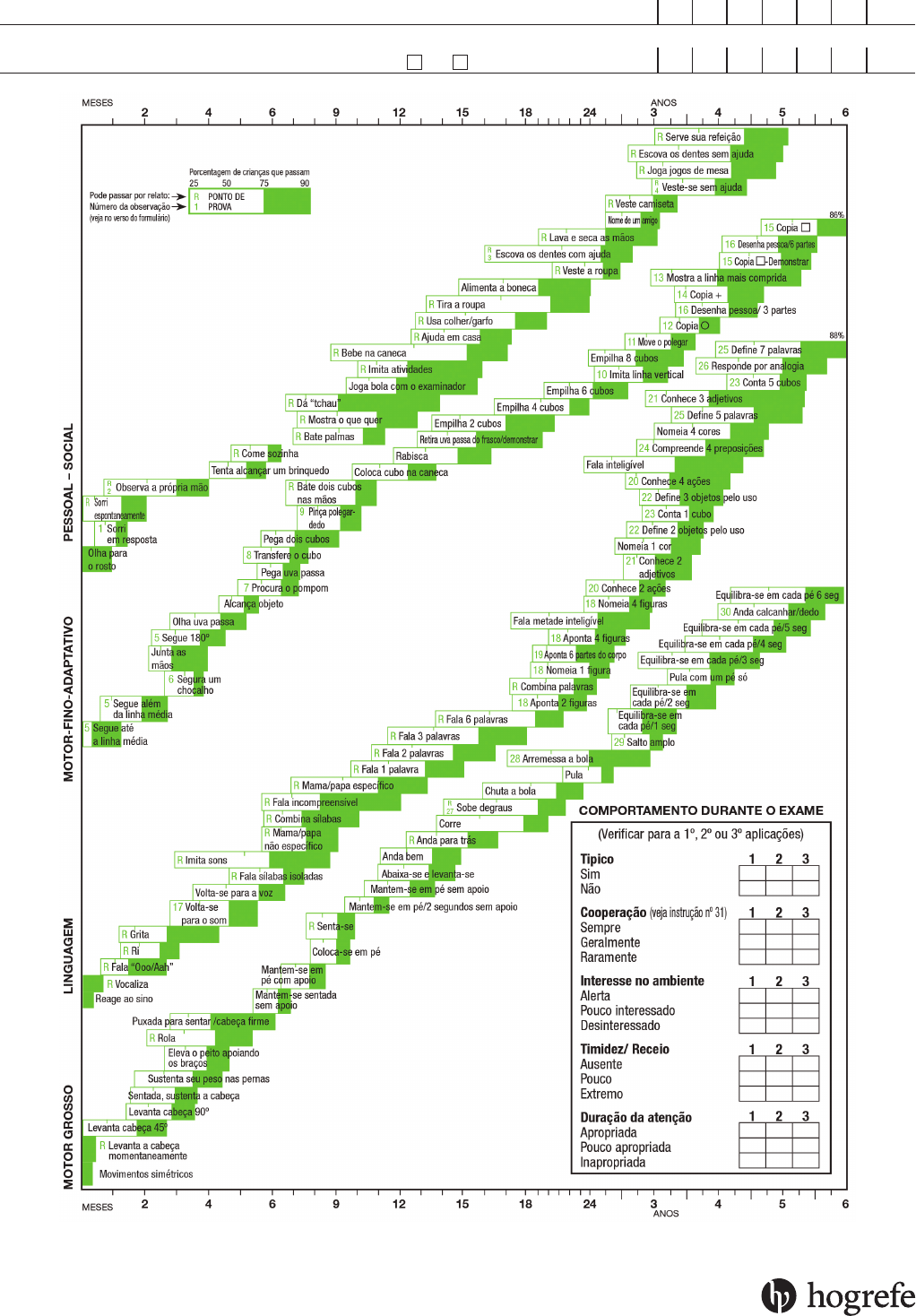 DENVER IIFolha de respostas Dados Pessoais: Nome: Data de nascimento: Número de Identificação : Sexo: M F Data da avaliação: Dia Mês Ano Dia Mês Ano Versão original: Denver II Developmental Screening Test by William K. Frankenburg et al © 1969, 1989, 1990 W.K. Frankenburg and J.B. Dodds © 1978 W.K. Frankenburg © 2009 Wilhelmine R. Frankenburg Versão brasileira: ©2017 Editora Hogrefe CETEPP Autores da versão original: W. K. Frankenburg e J. B. Dodds Adaptadora da versão brasileira: Ana Llonch Sabatés; Colaboradoras: Dionísia Aparecida Cusin Lamônica, Greyce Kelly; Jacy Perissinoto; José Roberto da Silva Brêtas, Maria das Graças Barreto da Silva, Magda Andrade Rezende, Rosa Resegue Ferreira da Silva, Selma Mie Isotami. Rua Comendador Norberto Jorge, 30 - Brooklin 04602020 São Paulo – SP Fone: 11 5543-4592 www.hogrefe.com.br 1. Tente fazer a criança sorrir, sorrindo para ela, conversando ou acenando. Não a toque. 2. A criança deve olhar fixamente para a mão por vários segundos. 3. Um dos pais pode ajudar a direcionar a escova de dentes e colocar pasta dental na escova. 4. A criança não precisa ser capaz de amarrar os sapatos, nem de abotoar a roupa ou fechar o zíper na parte de trás. 5. Mova o pompom lentamente, de um lado para o outro, em um arco, a 20 cm acima do rosto da criança. 6. Aprove se a criança pegar o chocalho quando este tocar o dorso dos dedos da mão. 7. Aprove se a criança tentar ver para onde foi o pompom. O pompom deve ser tirado rapidamente de seu campo de visão. O avaliador deverá soltá-lo sem movimentar o braço. 8. A criança precisa transferir o cubo de uma mão para a outra sem a ajuda do corpo, da boca ou da mesa. 9. Aprove se a criança pegar uma uva com qualquer parte do polegar e o dedo indicador, ou qualquer outro dedo. 10. A linha pode variar no máximo 30 graus a partir da linha de quem realiza o teste. 11. Faça um sinal de positivo com o polegar e movimente apenas o polegar. Aprove se a criança imitar e não mover outros dedos além do polegar. Ao dar os itens 12, 14 e 15, não dê nome às formas. Não demonstre 12 e 14. 16. Pontue cada par (2 braços, 2 pernas, etc.) como uma parte. 17. Coloque um cubo na caneca e agite suavemente perto da orelha da criança, mas fora do seu campo de visão. Repita na outra orelha. 18. Aponte para uma figura e peça para nomeá-la. (Não dê créditos para sons emitidos, exemplo: au au, miau e outros.) Se ao menos 4 figuras forem nomeadas corretamente, peça para a criança apontar a figura enquanto o examinador diz o nome. 19. Usando uma boneca, diga à criança: mostre para mim o nariz, os olhos, as orelhas, a boca, as mãos, os pés, a barriga, o cabelo. Aprove se a criança acertar 6 de 8. 20. Usando figuras, pergunte à criança: qual deles voa?...faz miau?...fala?...late?...galopa? (Aprove se a criança acertar 2 de 5, 4 de 5). 21. Pergunte à criança: o que você faz quando está com frio?...cansado(a)?...com fome? (Aprove se a criança acertar 2 de 3, 3 de 3). 22. Pergunte à criança: para que serve o copo?; para que serve a cadeira?; para que serve o lápis? As respostas devem incluir palavras de ação. 23. Aprove se a criança apontar e falar corretamente quantos cubos há no papel. (1, 5). 24. Diga à criança: coloque o cubo sobre a mesa; embaixo da mesa; na minha frente; atrás de mim. Aprove se a criança acertar 4 de 4. (Não ajude a criança apontando, movendo a cabeça ou os olhos). 25. Pergunte à criança: o que é uma bola?...rio?...mesa?...casa?...banana?...janela?...muro?...teto? Aprove se forem definidos em termos de uso, forma, do que é feito ou de categoria geral (como banana ser fruta, não apenas amarela). Aprove se a criança acertar 5 de 8, 7 de 8. 26. Pergunte à criança: Se o cavalo é grande, o rato é __? Se o fogo é quente, o gelo é __? Se o sol brilha durante o dia, a lua brilha durante a __? Aprove se a criança acertar 2 de 3. 27. A criança só pode usar a parede ou o corrimão, não a pessoa. Não pode engatinhar. 28. A criança deve arremessar a bola com o braço levantado acima da cabeça, a uma distância de aproximadamente 90 cm do avaliador. 29. A criança deve pular em pé na largura da folha de teste (21 cm). 30. Peça à criança para andar para a frente, encostando a ponta de um pé no calcanhar do outro. O avaliador do teste deve demonstrar. A criança deve caminhar quatro passos consecutivos, com o calcanhar a no máximo 2,5 cm da ponta do outro pé. 31. No segundo ano, metade das crianças normais não colabora. OBSERVAÇÕES: É proibida a reprodução total ou parcial desta publicação para qualquer finalidade, sem autorização expressa dos editores. Instruções para Administração do Denver II 12. Aprove qualquer forma fechada. Falhou movimentos redondos contínuos. 13. Qual linha é mais comprida? (Não maior.) Vire o papel de cabeça para baixo e repita. (Aprove se a cri- ança acertar 3 de 3 ou 5 de 6) 14. Aprove qualquer movimento de linhas cruzadas perto do centro. 15. Deixe a criança copiar primeiro. Se não conseguir, demonstre.