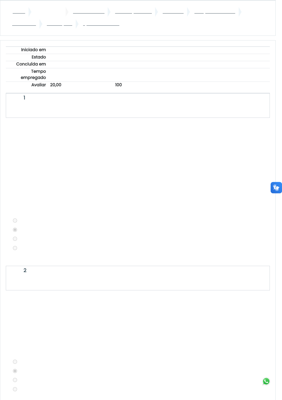 Painel Meus cursos CURSOS FUNEC Graduação - EAD Aluno EAD JUNÇÕES DE TURMA Fruticultura AVALIAÇÕES QUESTIONÁRIO 02 Iniciado em Tuesday, 13 Feb 2024, 21:10 Estado Finalizada Concluída em Tuesday, 13 Feb 2024, 21:16 Tempo empregado 5 minutos 30 segundos Avaliar 20,00 de um máximo de 20,00(100%) Questão 1 Completo Atingiu 2,00 de 2,00 Questão 2 Completo Atingiu 2,00 de 2,00 Tradicionalmente, a região Sul do Brasil apresenta forte expressividade na produção de citros, competindo em qualidade com o estado de São Paulo, maior produtor nacional de laranja. Referente à cultura dos citros, analise as assertivas a seguir: I. Nos citros pode ocorrer polinização cruzada ou autopolinização, sendo que, na maior parte dos citros, a polinização é entomófila. II. O fruto é dividido em epicarpo, pericarpo, mesocarpo e endocarpo. III. A definição do espaçamento em pomares dependerá das condições de fertilidade da área, da disponibilidade hídrica, do tipo de cultivar copa e do porta-enxerto e da topografia. IV. Há necessidade de raleio, podendo ser ele químico, por meio de subdoses de Ergosterol, ou manual. Quais estão INCORRETAS? Escolha uma opção: a. Apenas III e IV. b. Apenas I e III. c. Apenas II. d. Apenas II, III e IV. O crescimento dos citros e a produção de frutos é resultante da assimilação de CO2 (que depende de luz, temperatura, água, nutrientes, área foliar etc.) e da partição do C, fixado para formação e manutenção dos seus vários órgãos. A ausência ou deficiência dos nutrientes minerais, absorvidos, principalmente pelas raízes resulta em injúria, desenvolvimento anormal ou morte da planta, embora esses representem apenas cerca de 5% da matéria seca da biomassa das plantas. Assim, o desenvolvimento adequado e, consequentemente, a alta produtividade dos citros depende da diagnose correta da disponibilidade dos nutrientes no solo e do fornecimento em quantidades suficientes e nos períodos de maior demanda. Quais são os macronutrientes mais absorvidos pelos citros? Escolha uma opção: a. Fósforo, potássio e magnésio. b. Cálcio, nitrogênio e potássio. c. Fósforo, potássio e cálcio. d. Cálcio, manganês e fósforo. https://ava.funec.br/my/ https://ava.funec.br/course/index.php?categoryid=10 https://ava.funec.br/course/index.php?categoryid=17 https://ava.funec.br/course/index.php?categoryid=19 https://ava.funec.br/course/index.php?categoryid=77 https://ava.funec.br/course/view.php?id=1405 https://ava.funec.br/course/view.php?id=1405#section-5 https://ava.funec.br/mod/quiz/view.php?id=17952 Questão 3 Completo Atingiu 2,00 de 2,00 Questão 4 Completo Atingiu 2,00 de 2,00 Questão 5 Completo Atingiu 2,00 de 2,00 Um citricultor plantou 200 hectares de laranjeira da variedade pera, utilizando mudas enxertadas de boa qualidade fisiológica e sanitária. No plantio, para que as mudas não tombassem, elas foram plantadas com o colo enterrado 5 cm no solo. Cerca de dois anos após o plantio, 20% das plantas apresentavam exsudação de goma em lesões de tronco e de colo, tendo os tecidos infectados secado completamente, o que causou a morte de algumas plantas. Nessa situação hipotética, marque a alternativa incorreta. Escolha uma opção: a. o sintoma apresentado pelas plantas é típico de antracnose adquirida em razão do plantio de mudas de laranjeira suscetíveis a essa doença. b. o produtor deveria evitar o ferimento do tronco e das raízes e fazer pulverização com fungicidas preventivos em todo o pomar, logo após o replantio das mudas que apresentavam sintomas da doença. c. o produtor deveria substituir as mudas com os sintomas descritos por mudas de laranjeira sadias, certificadas e resistentes a fungos de solo. d. o plantio das mudas com o colo enterrado 5 cm no solo é inadequado, pois o plantio de mudas cítricas deve ser feito de forma a deixar o colo da planta cerca de 5 cm acima do nível do solo, para minimizar a ocorrência de fungos de solo. A doença conhecida como huanglongbing é, atualmente, uma das mais importantes que afetam a citricultura nacional. O principal inseto vetor desta doença é o psilídeo conhecido como: Escolha uma opção: a. Aphis gossypii. b. Aleurocanthus woglumi. c. Diaphorina citri. d. Toxoptera citricida. A Instrução Normativa n° 16, de 18 de março de 2003, proíbe a saída de material propagativo de citrus produzido em viveiros telados e a céu aberto dos municípios onde for constatada a ocorrência de: Escolha uma opção: a. vírus da tristeza dos citrus. b. pinta preta. c. morte súbita dos citrus. d. cancro cítrico. Questão 6 Completo Atingiu 2,00 de 2,00 Questão 7 Completo Atingiu 2,00 de 2,00 Questão 8 Completo Atingiu 2,00 de 2,00 A poda de frutificação tem a função de retirar o excesso de ramos, visando-se ao equilíbrio entre o processo de frutificação e a quantidade de folhas e ramos, o que estabiliza a produção em relação à quantidade, à qualidade de frutos e ao período de colheita. Considerando o texto, avalie as seguintes asserções e a relação proposta entre elas. I. O conhecimento da prática da poda permite projetar as instalações para manuseio, embalagem e conservação dos frutos. PORQUE II. É possível escalonar a produção de frutos de acordo com a época de poda. A respeito dessas asserções, assinale a opção correta. Escolha uma opção: a. As asserções I e II são proposições verdadeiras, e a II é uma justificativa correta da I. b. A asserção I é uma proposição verdadeira, e a II é uma proposição falsa. c. A asserção I é uma proposição falsa, e a II é uma proposição verdadeira. E As asserções I e II são proposições falsas. d. As asserções I e II são proposições verdadeiras, mas a II não é uma justificativa correta da I. Causado pela bactéria Xanthomonas axonopodis pv. citri, o cancro cítrico ataca todas as variedades e espécies de citros e constitui-se numa das mais graves doenças da citricultur