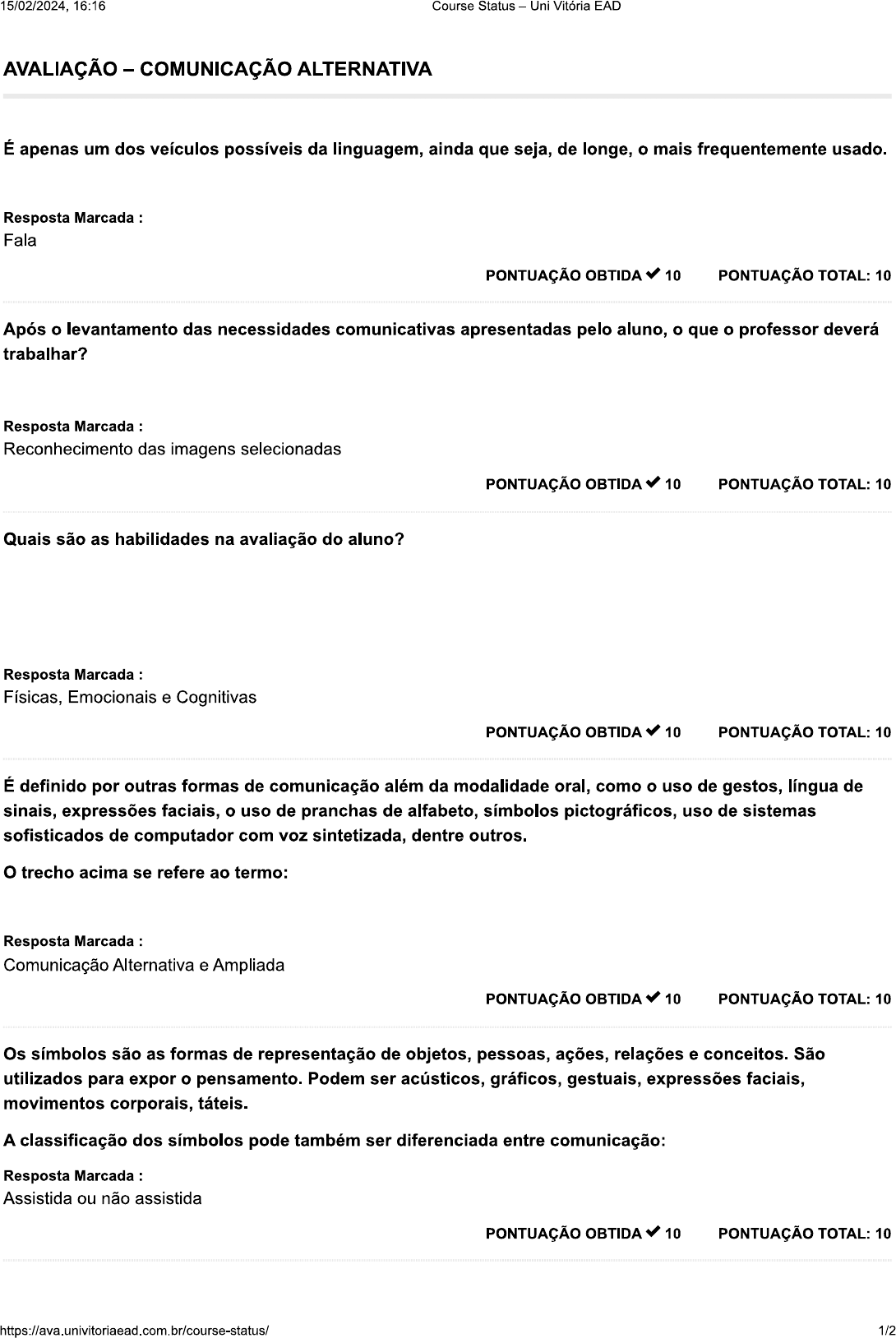 114:28 Progresso:9/10 2 HORAS AVALIAÇÃO – COMUNICAÇÃO ALTERNATIVA 1 De acordo com os estudos da primeira unidade, a Comunicação Aumentativa e Alte...