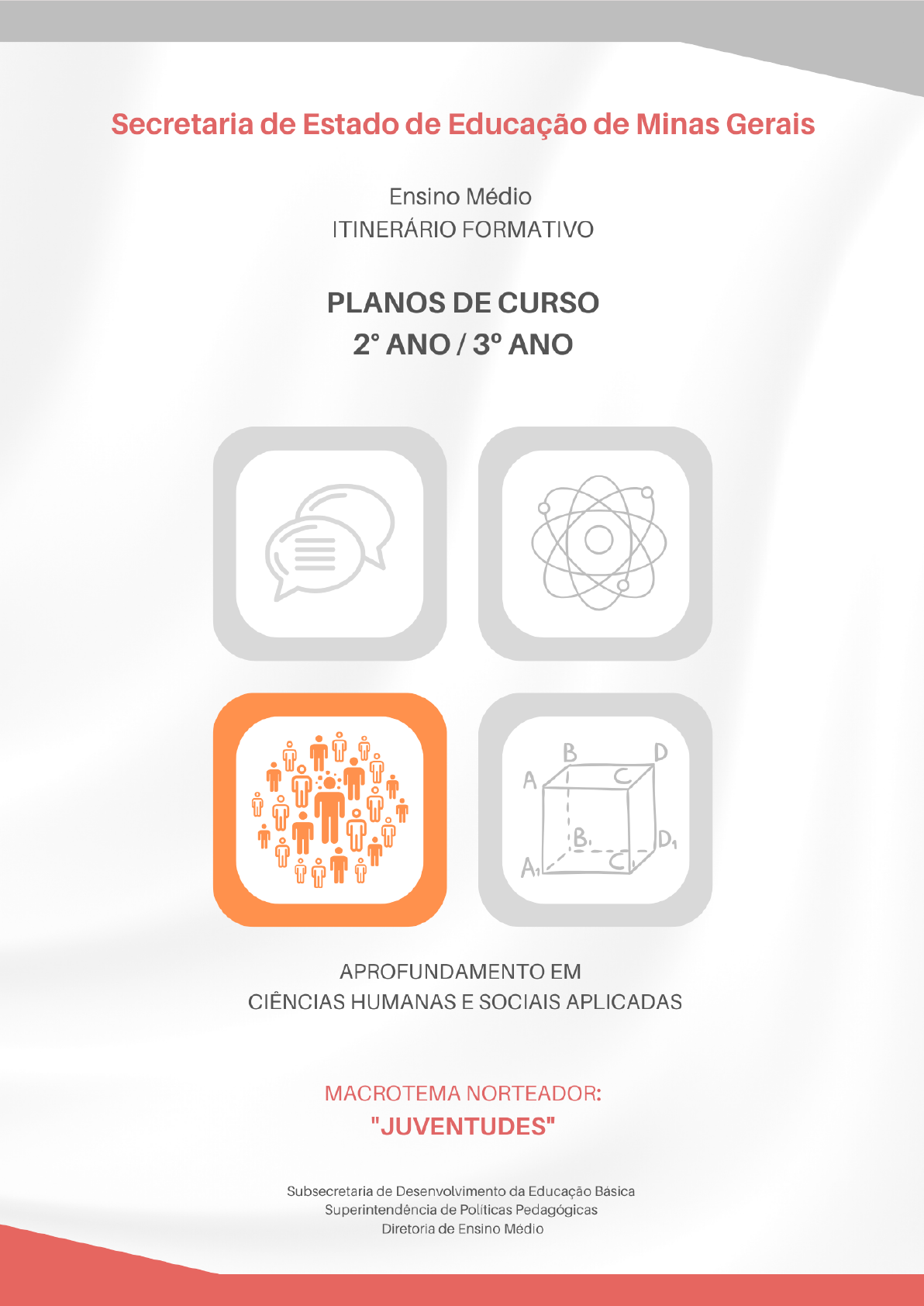 2º ano e 3º ano - Ensino Médio 1 Estado de Minas Gerais - 2024 2º ano e 3º ano - Ensino Médio Governador do Estado de Minas Gerais Romeu Zema Neto Vice-governador do Estado de Minas Gerais Mateus Simões de Almeida Secretaria de Estado de Educação Igor de Alvarenga Oliveira Icassatti Rojas Secretaria Adjunta Geniana Guimarães Faria Subsecretaria de Desenvolvimento da Educação Básica Kellen Silva Senra Superintendência de Políticas Pedagógicas Graziela Santos Trindade Diretoria de Ensino Médio Rosely Lúcia de Lima Coordenação de Ações de Aprendizagem Vanessa Nicoletti Gomes de Oliveira Construção Ademar Pinto do Carmo Alexandre Marini Anízio Viana da Silva Camila Gomes Cunha Cláudia do Rosário Silva Mendes Giselle de Oliveira Neves Kátia de Laura Borges Samira Maria Araújo Laís Francini F. Américo (estagiária) Parceria técnica INSTITUTO IUNGO LEITURA CRÍTICA Carlos Gomes de Castro Léa Camargo Sumário 2 Estado de Minas Gerais - 2024 2º ano e 3º ano - Ensino Médio APRESENTAÇÃO 4 Introdução 5 Ementa 5 Abordagem pedagógica 5 Objetivos de aprendizagem 6 PLANEJAMENTO 8 IDENTIDADES E JUVENTUDES 10 1º Bimestre - A diversidade das juventudes 10 2º Bimestre - Jovens e a política 14 3º Bimestre - Um mundo de influências 18 4º Bimestre - Um mundo de desafios 21 JOVENS E O MUNDO DIGITAL 25 1º Bimestre - As novas relações sociais 25 2º Bimestre - O mercado de informações 29 3º Bimestre - O mercado de trabalho 33 4º Bimestre - Relações éticas 37 DIREITOS E DEVERES DO CIDADÃO 41 1º Bimestre - Direitos: construção e conceitos 41 2º Bimestre - A construção dos Direitos Humanos 46 3º Bimestre - DUDH: análises e problematizações 49 4º Bimestre - O estatuto da juventude 52 DESENVOLVIMENTO PESSOAL E COLETIVO 55 1º Bimestre - O Jovem Profissional 55 2º Bimestre - Introdução a Pesquisa 59 3º Bimestre - Laboratório de pesquisa 62 4º Bimestre - Metodologia da Pesquisa 65 REFERÊNCIAS 66 APRESENTAÇÃO O Itinerário Formativo é composto por Unidades Curriculares, que se organizam em 3 Estado de Minas Gerais - 2024 2º ano e 3º ano - Ensino Médio Componentes Curriculares. As Unidades Curriculares se estruturam de duas formas: aquelas que são mantidas na matriz ao longo do ensino médio, como o Projeto de Vida e a Preparação para o Mundo do Trabalho, e aquelas que permitem a escolha anual pelos estudantes, como as Eletivas e o Aprofundamento nas Áreas do Conhecimento. O Itinerário Formativo, parte diversificada do Currículo Referência de Minas Gerais, tem uma função importante na trajetória escolar dos estudantes, pois estabelece o diálogo com os contextos de vida dos jovens e com a realidade atual. Assim, um dos principais propósitos do Aprofundamento nas Áreas do Conhecimento é a promoção de abordagens práticas e contextualizadas , valorizando os saberes trazidos pelas Áreas do Conhecimento. Ao conectar os saberes da Formação Geral Básica (Geografia, História, Sociologia, Filosofia, Química, Artes, Educação Física, Matemática etc.) e o Projeto de Vida dos estudantes, o Aprofundamento nas Áreas do Conhecimento tem como objetivos: produzir conhecimentos, criar possibilidades de aprofundar e ampliar aprendizagens, intervir na realidade sociocultural, incentivar a ação de empreender, como uma atividade profissional ou ter a si mesmo como objeto desse empreender, isto é, empreender-se. Cada Unidade Curricular do Aprofundamento nas Áreas do Conhecimento é composta por 4 Componentes Curriculares. A unidade curricular Aprofundamento nas Áreas do Conhecimento para o 1º ano diurno oferta componentes curriculares de cada uma das 4 áreas para todas as turmas da rede. Para o 2º ano, em 2023, mantém-se a estrutura de oferta de 4 componentes curriculares, porém organizados de formas diversas que possibilitaram 9 arranjos distintos, assegurando que os estudantes possam, com as equipes escolares, escolher qual dos Aprofundamentos é mais compatível com seu projeto de vida. Neste documento, o professor encontrará as orientações para a implementação do Aprofundamento em Ciências Humanas e Sociais Aplicadas, contendo cada um a seguinte estrutura: ● Introdução à unidade curricular; ● Ementa do macrotema; ● Abordagem pedagógica; ● Objetivos de aprendizagem; ● Planos de curso contendo sugestões de organização de trabalho com subtemas, habilidades gerais, específicas e estratégias de ensino aprendizagem. 4 Estado de Minas Gerais - 2024 2º ano e 3º ano - Ensino Médio Introdução O aprofundamento em Ciências Humanas e Sociais Aplicadas é uma unidade curricular formada por quatro componentes curriculares orientados para o reconhecimento de questões que afetam a vida social dos estudantes e o envolvimento deles na vida pública. Objetiva a criação e ampliação de possibilidades de convivência, mediação de conflitos e propostas de soluções de problemas locais por meio de projetos de mobilização e intervenção sociocultural. Ementa Macrotema: “JUVENTUDES” Visando à apropriação dos conhecimentos das Ciências Humanas e Sociais Aplicadas como ferramenta crítica para o desenvolvimento pessoal e coletivo, o macrotema “Juventudes” propõe o aprofundamento do diálogo entre as características e potencialidades individuais e locais, perpassando por identidade e pluralidade juvenil, as juventudes e sua relação com o mundo digital e com a comunidade à sua volta. Esta unidade curricular focalizará competências e habilidades voltadas à compreensão da realidade dos estudantes, na busca da integração entre os saberes científicos e as vivências pessoais. Abordagem pedagógica “Juventudes” é o macrotema norteador do trabalho a ser desenvolvido nesta unidade curricular, sendo desdobrado em temas afins para cada um dos quatro componentes curriculares, os quais mantém diálogo constante entre si. Os professores responsáveis por esses componentes curriculares podem propo