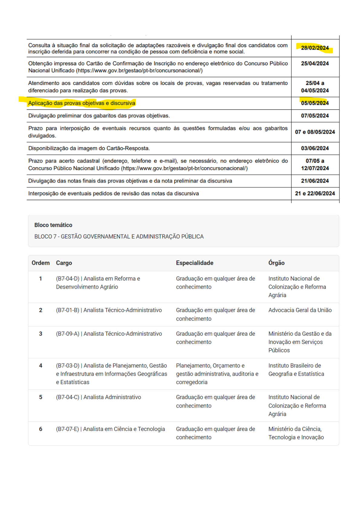 CONHECIMENTO S GERAIS 1 POLÍTICAS PÚBLICAS 1.1 Introdução às políticas públicas: conceitos e tipologias. 1.2 Ciclos de políticas públicas: agenda e formulação; processos de decisão; implementação, seus planos, projetos e programas; monitoramento e avaliação. 1.3 Institucionalização das políticas em Direitos Humanos como políticas de Estado. 1.4 Federalismo e descentralização de políticas públicas no Brasil: organização e funcionamento dos sistemas de programas nacionais. 2 DESAFIOS DO ESTADO DE DIREITO: DEMOCRACIA E CIDADANIA 2.1 Estado de direito e a Constituição Federal de 1988: consolidação da democracia, representação política e participação cidadã. 2.2 Divisão e coordenação de Poderes da República. 2.3 Presidencialismo como sistema de governo: noções gerais, capacidades governativas e especificidades do caso brasileiro. 2.4 Efetivação e reparação de Direitos Humanos: memória, autoritarismo e violência de Estado. 2.5 Programa Nacional de Direitos Humanos PNDH-3 (Decreto nº 7.037/2009). 2.6 Combate às discriminações, desigualdades e injustiças: de renda, regional, racial, etária e de gênero. 2.7 Desenvolvimento sustentável, meio ambiente e mudança climática. 3 ÉTICA e INTEGRIDADE. 3.1 Princípios e valores éticos do serviço público, seus direitos e deveres à luz do artigo 37 da Constituição Federal de 1988, e do Código de Ética Profissional do Servidor Público Civil do Poder Executivo Federal (Decreto nº 1.171/1994). 3.2 Governança pública e sistemas de governança (Decreto nº 9.203, de 22 de novembro de 2017). Gestão de riscos e medidas mitigatórias na Administração Pública. 3.3 Integridade pública (Decreto nº 11.529/2023). 3.4 Transparência e qualidade na gestão pública, cidadania e equidade social. 3.5 Governo eletrônico e seu impacto na sociedade e na Administração Pública. Lei nº 14.129/2021. 3.6 Acesso à informação. Lei nº 12.527/2011. 3.7 Transparência e imparcialidade nos usos da inteligência artificial no âmbito do serviço público. 4 DIVERSIDADE E INCLUSÃONA SOCIEDADE 4.1 Diversidade de sexo, gênero e sexualidade; diversidade étnico-racial; diversidade cultural. 4.2 Desafios sociopolíticos da inclusão de grupos em situação de vulnerabilidade: crianças e adolescentes; idosos; LGBTQIA+; pessoas com deficiências; pessoas em situação de rua, povos indígenas, comunidades quilombolas e demais minorias sociais. 5 ADMINISTRAÇÃO PÚBLICA FEDERAL 5.1 Princípios constitucionais e normas que regem a administração pública (artigos de 37 a 41 da Constituição Federal de 1988). 5.2 Estrutura organizacional da Administração Pública Federal (Decreto Lei nº 200/1967). 5.3 Agentes públicos: Regime Jurídico Único (Lei nº 8.112/1990 e suas alterações). 6 FINANÇAS PÚBLICAS 6.1 Atribuições econômicas do Estado. 6.2 Fundamentos das finanças públicas, tributação e orçamento. 6.3 Financiamento das Políticas Públicas: estrutura de receitas e despesas do Estado brasileiro. 6.4 Noções de orçamento público: Plano Plurianual (PPA), Lei de Diretrizes Orçamentárias (LDO) e Lei Orçamentária Anual (LOA). 6.5 Federalismo fiscal no Brasil; Lei de Responsabilidade Fiscal (Lei Complementar nº 101/2000) EIXO ESPECÍFICAS EIXO TEMÁTICO 1 – GESTÃO GOVERNAMENTAL E GOVERNANÇA PÚBLICA: ESTRATÉGIA, PESSOAS, PROJETOS E PROCESSOS 1 – GESTÃO GOVERNAMENTAL E GOVERNANÇA PÚBLICA 1 Planejamento e gestão estratégica: 1.1 Conceitos, princípios, etapas, níveis, métodos e ferramentas. Balanced Scorecard (BSC). Matriz SWOT. 1.2 Estabelecimento de objetivos e metas organizacionais. 1.3 Ferramentas de gestão. 1.4 Metodologias para medição de desempenho. Indicadores de desempenho: conceito, formulação e análise. Detalhamento da ferramenta de avaliação de desempenho: OKR. 2 Gestão de pessoas: 2.1 Liderança, gerenciamento de conflitos, motivação, sistemas de incentivo e responsabilização, gestão do desempenho. 2.2 Programa de Gestão do Desempenho, teletrabalho. 2.3 Indicadores de gestão de pessoas, flexibilidade organizacional. 2.4 Trabalho em equipe. 2.5 Gestão de redes organizacionais, comportamento organizacional, cultura organizacional. 3 Gestão de projetos: 3.1 Conceitos básicos. 3.2 Processos do PMBOK. 3.3 Gerenciamento da integração, do escopo, do tempo, de custos, da qualidade, de recursos humanos, de comunicações, de riscos, de aquisições, de partes interessadas. 3.4 Metodologias ágeis. 4 Gestão de processos. 4.1 Conceitos da abordagem por processos. 4.2 Técnicas demapeamento, análise e melhoria de processos. 4.3 BPM. 4.4 Desenho de serviços públicos. EIXO TEMÁTICO 2 – GESTÃO GOVERNAMENTAL E GOVERNANÇA PÚBLICA: RISCOS, INOVAÇÃO, PARTICIPAÇÃO, LOGÍSTICA e PATRIMÔNIO 1 Gestão de riscos: princípios, objetos, técnicas, modelos nacionais e internacionais, integração ao planejamento. 1.1 Processo de Gestão de Riscos: comunicação, consulta, contextualização, identificação, análise, tratamento, monitoramento e retroalimentação. 1.2 Boas práticas de gestão de Riscos. 2 Inovação na gestão pública. 3 Governo eletrônico; transparência da administração pública; controle social e cidadania; accountability. 4 Organização sistêmica da administração pública federal. 4.1 Sistemas estruturantes e estruturadores da administração pública federal. 5 Controles interno e externo. 6 Processos participativos de gestão pública: conselhos de gestão, orçamento participativo, parceria entre governo e sociedade. 7 Articulação versus a fragmentação de ações governamentais. 7.1 Dimensões da coordenação: intragovernamental, intergovernamental e governo-sociedade. 8 Administração de Recursos Materiais e Patrimoniais. 8.1 Conceituação de Material e Patrimônio. 8.2 O Patrimônio das empresas e órgãos públicos. 8.3 O Patrimônio Imobiliário. 8.4 O Patrimônio Mobiliário. 8.5 Organização e Controle Logís