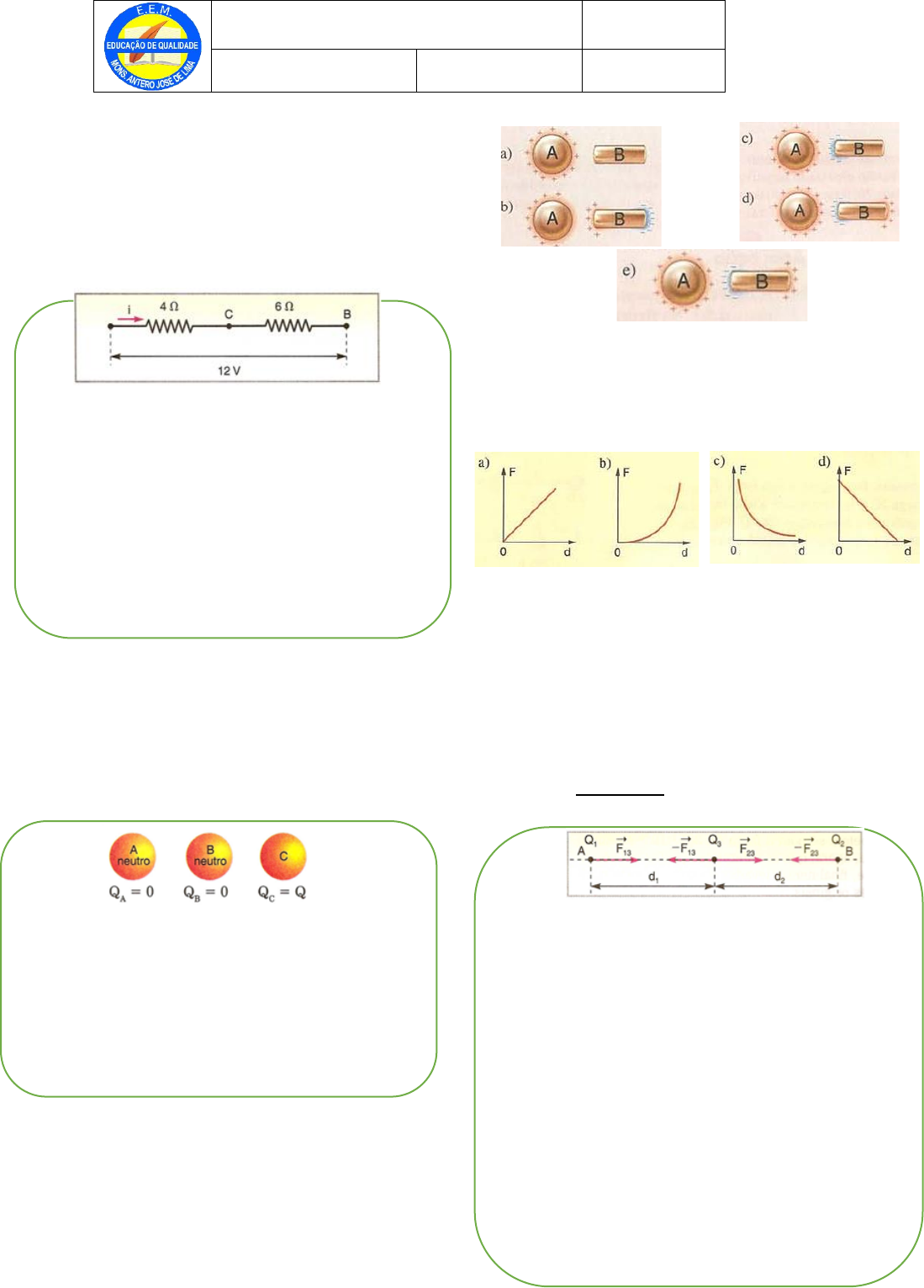 01. Dois resistores, 4Ω e 6Ω, são associados em série. Uma bateria fornece aos extremos da associação uma ddp de 12V. Use: U = R.i Determine: a) A resistência equivalente da associação b) A intensidade da corrente elétrica. 02. Dispõe-se de três esferas metálicas idênticas e isoladas umas das outras. Duas delas, A e B, estão neutras, enquanto a esfera C contém uma carga elétrica Q. Faz-se a esfera C tocar primeiro a esfera A e depois a esfera B. No final desse procedimento, qual a carga elétrica das esferas A, B e C, respectivamente? 03. Quando a esfera A, carregada com cargas positivas, é colocada próximo de um condutor B, descarregado, a distribuição de cargas que mais se aproxima da real nos dois condutores é: 04. Dois pequenos corpos eletricamente carregados são lentamente afastados um do outro. A intensidade da força de interação (F) varia com a distância (d) entre eles, segundo o gráfico: 05. Duas cargas puntiformes, Q1 e Q2, são fixadas nos pontos A e B, distantes entre si 0,4 m, no vácuo. Sendo Q1 = 2.10 -6 C, e Q2 = 8.10 -6 C e k0 = 9.109, determine a intensidade da força elétrica resultante sobre uma carga Q3 = -3.10 -6 C, colocada a 0,1 m de A, sobre a reta AB. Use: 𝐹 = 𝑘0.|𝑄||𝑄| 𝑑2 e 𝐹𝑅 = 𝐹13 − 𝐹23 Nome: Ano: Disciplina: Turno: Nota: 06. Transforme 45km/h em m/s. 07. A afirmação “todo movimento é relativo” significa que: a) todos os cálculos de velocidade são imprecisos. b) não existe movimento com velocidade constante. c) a velocidade depende sempre de uma força. d) a velocidade depende sempre de uma aceleração. e) a descrição de qualquer movimento requer um referencial. 08. De um avião que voa de leste para oeste abandona-se um projétil. Em relação a um observador fixo no solo, a trajetória do projétil será. a) um arco de circunferência. b) parabólica. c) elíptica. d) uma reta inclinada. e) uma reta vertical. 09. Uma das teorias para explicar o aparecimento do homem no continente americano propõe que ele, vindo da Ásia, entrou na América pelo Estreito de Bering e foi migrando para o sul até atingir a Patagônia, como indicado no mapa. Datações arqueológicas sugerem que foram necessários cerca de 10 000 anos para que essa migração se realizasse. O comprimento AB, mostrado ao lado do mapa, corresponde à distância de 5 000 km nesse mesmo mapa. Com base nesses dados, pode-se estimar que a velocidade escalar média de ocupação de continente americano pelo homem, ao longo da rota desenhada, foi de aproximadamente: 10. Uma pessoa, percorre 4,0 km com velocidade escalar média de 12 km/h. O tempo do percurso é de: a) 3,0 min b) 8,0 min c) 20 min d) 30 min e) 33 min 11. A temperatura média do corpo humano é de 36,5 ºC. Determine o valor dessa temperatura na escala Fahrenheit. 12. Uma barra apresenta a 10 ºC comprimento de 90m, sendo feita de um material cujo coeficiente de dilatação linear médio vale 19.10-6 ºC-1. A barra é aquecida até 20 ºC. Determine a dilatação ocorrida. 13. Você conhece a brincadeira do gato no pote, que consiste numa panela de barro pendurada por uma corda? Digamos que dentro de nossa panela havia, além do gato, bombons e pedacinhos de madeira. No instante em que ia ser quebrada a panela, a corda se desprendeu e caíram a panela, o gato, os bombons e os pedacinhos de madeira. Seria correto afirmar, com respeito às acelerações de cada elemento, que: a) são iguais; b) é maior para o elemento de maior massa; c) é menor par o de menor massa; d) dependem das massas; e) dependem dos pesos de cada elemento. 14. Um corpo de massa igual a 5 kg, inicialmente em repouso, sofre a ação de uma força resultante constante de 30 N. Qual a velocidade do corpo depois de 5 s? a) 5 m/s b) 6 m/s c) 25 m/s d) 30 m/s e) 150 m/s 15. Um corpo de massa 200 g é constituído por uma substância de calor específico 0,4 cal/g. ºC. Determine a quantidade de calor que o corpo deve receber para que sua temperatura varie de 5 ºC para 35 ºC. 16. A figura mostra um corpo de massa igual a 70 kg, sobre uma mesa horizontal, ligado por uma corda a um segundo corpo de massa igual a 50 kg. Sabendo que a massa da corda é desprezível, bem como todas as forças de atrito, indique o valor da aceleração do corpo de massa igual a 50 kg. Adote g = 10m/s2. a) 9,8 m/s2 b) 10,0 m/s2 c) 4,1 m/s2 d) 0,0 m/s2 e) 6,9 m/s2 17. Uma vela é colocada sobre o eixo principal de uma lente convergente cujos focos principais são F1 e F2, como está indicado no esquema da figura. A imagem da vela conjugada pela lente é: a) real, direita e maior que a vela b) real, invertida e menor que a vela c) virtual, direita e menor que a vela d) virtual, direita e maior que a vela e) virtual, invertida e maior que a vela. 18. Um mol de certo gás ideal exerce a pressão de 1 atm a 0 ºC (273 K). Sendo a constante universal dos gases perfeitos R = 0,082 𝑎𝑡𝑚.𝐿 𝑚𝑜𝑙.𝐾 , determine o volume ocupado por esse gás. 19. Um observador nota que um edifício projeta no solo uma sombra de 30 m de comprimento no instante em que uma haste vertical de 50 cm de altura projeta no solo uma sombra de comprimento 0,80 m. Determine a altura do edifício. 20. Na associação de resistores esquematizada abaixo, a resistência equivalente é: a) 20 b) 16 c) 12 d) 9,6 e) 6,0