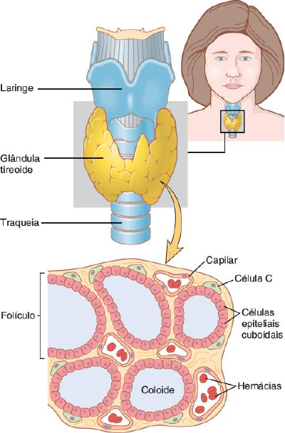 Tireoide • A tireoide secreta dois hormônios metabólicos principais, a tiroxina (t4) e a tri- iodotironina (t3). Ambos aumentam intensamente a taxa metabólica do organismo. • A secreção da tireoide é controlada principalmente pelo hormônio estimulante da tireoide (ou tireoestimulante) (TSH), que é secretado pela adeno-hipófise. SÍNTESE E SECREÇÃO DOS HORMÔNIOS METABÓLICOS DA TIREOIDE • 93% dos hormônios metabolicamente ativos secretados pela glândula tireoide consistem em tiroxina e 7% são tri-iodotironina. • Quase toda a tiroxina é eventualmente convertida em tri-iodotironina nos tecidos • A tri-iodotironina é cerca de quatro vezes mais potente do que a tiroxina, porem contem pouco no sangue. ANATOMIA E FISIOLOGIA DA GLÂNDULA TIREOIDE • A glândula tireoide é composta por um grande número de folículos tireoidianos. • São preenchidos por uma substância denominada coloide e revestidos por células epiteliais cuboides. • Essas células vão secretar seus produtos para dentro dos folículos. • O constituinte principal do coloide é a grande glicoproteína tireoglobulina, que contém os hormônios da tireoide. • Quando a secreção chega aos folículos, deve ser reabsorvida através do epitélio folicular para o sangue, a fim de realizar suas funções no organismo. • A glândula tireoide também contém células C, que secretam calcitonina, um hormônio que contribui para a regulação da concentração do íon cálcio no plasma O IODO É NECESSÁRIO PARA A FORMAÇÃO DA TIROXINA • Normalmente, a maior parte dos iodetos é rapidamente excretada pelos rins, mas cerca de um quinto é seletivamente removido da circulação sanguínea pelas células da glândula tireoide, e usado para a síntese dos hormônios tireoidianos. TIREOGLOBULINA E FORMAÇÃO DE TIROXINA E TRI-IODOTIRONINA Formação e secreção de tireoglobulina pelas células da tireoide • As células da tireoide são típicas células glandulares secretoras de proteínas • O retículo endoplasmático e o complexo de Golgi sintetizam e secretam para os folículos uma grande glicoproteína (tireoglobulina) • Cada molécula de tireoglobulina contém aminoácidos de tirosina, que são os principais substratos que se combinam com o iodo para formar os hormônios da tireoide. • Assim os hormônios tireoidianos se formam ao longo da molécula de tireoglobulina. • Os hormônios tiroxina e tri-iodotironina são formados a partir dos aminoácidos tirosina. Oxidação do íon iodeto • A primeira etapa essencial na formação dos hormônios tireoidianos é a conversão dos íons iodeto para a forma oxidada de iodo, que é, então, capaz de se combinar diretamente com o aminoácido tirosina. • Essa oxidação do iodo é promovida pela enzima tireoperoxidase • A tireoperoxidase está localizada na membrana apical da célula ou ligada a ela, e é armazenada no coloide da tireoide. Iodinação da tirosina e formação dos hormônios tireoidianos • Organificação da tireoglobulina é a ligação do iodo com a molécula de tireoglobulina. • O principal produto hormonal da reação de acoplamento é a molécula tiroxina (T4), que se forma quando duas moléculas de di-iodotirosina são unidas. • Outra possibilidade é o acoplamento de uma molécula de monoiodotirosina com uma molécula de di-iodotirosina, formando a tri-iodotironina (T3). Armazenamento de tireoglobulina • Os hormônios da tireoide são armazenados nos folículos em quantidade suficiente para suprir as necessidades normais do corpo por 2 a 3 meses. Portanto, quando a síntese de hormônios da tireoide cessa, os efeitos fisiológicos da deficiência não são observados por vários meses. LIBERAÇÃO DE TIROXINA E TRI-IODOTIRONINA PELA GLÂNDULA TIREOIDE • A maior parte da tireoglobulina não é liberada para a circulação. • a tiroxina e a tri-iodotironina são clivadas da molécula de tireoglobulina, e, em seguida, os hormônios livres são liberados. Esse processo ocorre da seguinte forma: • a superfície apical das células da tireoide emite pseudópodos, que cercam pequenas porções do coloide, formando vesículas pinocíticas que penetram pelo ápice da célula. • Em seguida, os lisossomos no citoplasma celular imediatamente se fundem com as vesículas para formar vesículas digestivas contendo enzimas digestivas dos lisossomos misturadas com o coloide. • Múltiplas proteases entre as enzimas digerem as moléculas de tireoglobulina e liberam tiroxina e tri-iodotironina em sua forma livre, que então se difundem por meio da base da célula da tireoide para os capilares adjacentes. • Assim, os hormônios tireoidianos são liberados no sangue. FUNÇÕES FISIOLÓGICAS DOS HORMÔNIOS TIREOIDIANOS OS HORMÔNIOS TIREOIDIANOS AUMENTAM A TRANSCRIÇÃO DE UM GRANDE NÚMERO DE GENES • O efeito geral dos hormônios tireoidianos consiste em ativar a transcrição nuclear de muitos genes • Efeito prolongado aproximado na taxa de metabolismo basal causado pela administração de uma dose única grande de tiroxina. • A maior parte da tiroxina secretada pela tireoide é convertida em tri- iodotironina. Os hormônios da tireoide ativam os receptores nucleares • Os receptores do hormônio tireoidiano estão ligados às fitas genéticas de DNA ou localizados nas proximidades delas. • O receptor do hormônio tireoidiano geralmente forma um heterodímero com o receptor de retinoide X (RXR) em elementos de resposta do hormônio tireoidiano no DNA. • Após se ligarem ao hormônio tireoidiano, os receptores tornam-se ativados e iniciam o processo de transcrição. OS HORMÔNIOS TIREOIDIANOS AUMENTAM A ATIVIDADE METABÓLICA CELULAR • Os hormônios tireoidianos aumentam a atividade metabólica de quase todos os tecidos do corpo. O metabolismo basal pode aumentar de 60 a 100% acima do normal quando uma grande quantidade de hormônios da tireoide é secretada. • Os hormônios da tireoide aumentam o número 