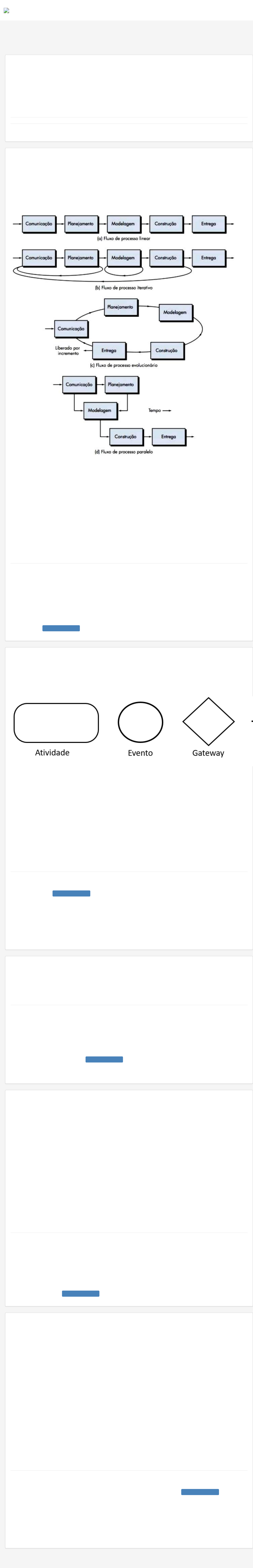 Análise e Modelagem de Sistemas Av1 - Análise e Modelagem de Sistemas Colaborar Informações Adicionais Período: 19/02/2024 00:00 à 03/06/2024 23:59 Situação: Cadastrado Tentativas: 1 / 3 Pontuação: 2500 Protocolo: 976938771 Avaliar Material 1) a) b) c) d) e) 2) a) b) c) d) e) 3) a) b) c) d) e) 4) a) b) c) d) e) 5) a) b) c) d) e) Conforme Pressman (2016) em um Processo de Software cada atividade metodológica e´ composta por um conjunto de ações de Engenharia de Software. Cada ação e´ definida por um conjunto de tarefas, o qual identifica as tarefas de trabalho a ser completadas, os artefatos de software que serão produzidos. Para tanto, o Fluxo de Processo descreve como são organizadas as estruturas metodológicas, as ações e as tarefas que ocorrem dentro de cada atividade. Observe a imagem a seguir retirada de Pressman (2016, p.33) e que demonstra quatro tipos de Fluxo de Processos: (i) Processo Linear, (ii) Processo Iterativo, (iii) Processo Evolucionário e (iv) Processo Paralelo. Tomando como referência o contexto apresentado, julgue as afirmativas a seguir em (V) Verdadeiras ou (F) Falsas: ( ) Um Fluxo de Processo Linear executa cada uma das cinco atividades metodológicas de forma sequencial, finalizando com a entrega do Software. ( ) Um Fluxo de Processo Iterativo repete uma ou mais das atividades antes de prosseguir para a próxima atividade do Processo do Software. ( ) Um Fluxo de Processo Evolucionário executa as atividade de forma serial onde cada volta produz uma versão de cada atividade do Processo do Software. ( ) Um Fluxo de Processo Paralelo executa uma ou mais atividades em paralelo com outras atividades do Processo do Software. Assinale a alternativa que apresenta a sequência CORRETA. Alternativas: V – V – F– F. V – F – F– V. V – V – V– F. F – V – V – V. V – V – F – V. Alternativa assinalada Conforme Valle e Oliveira (2013) o BPMN ou Business Process Modeling Notation é uma técnica de modelagem de fácil compreensão, pois atua com notações simples e que podem ser facilmente compreendidas, pode ser utilizado por todos envolvidos nos processos de negócio e permite modelagem de todo o tipo de processo como por exemplo: compras, vendas, empréstimos, manutenção, desenvolvimento de produtos ou serviços, entre outros. Na figura abaixo são apresentados os elementos básicos da notação BPMN e que são: conector, gateway, atividade e evento. Considerando o contexto, avalie as afirmativas a seguir: I. A atividade é o trabalho que será realizado e que não pode ser subdivido em tarefas menores, sendo necessário estabelecer cada atividade específica da modelagem. II. Os eventos são ocorrências no processo que podem influenciar outros elementos e eventos na cadeia de processos. III. Os gateways são elementos utilizados para controlar o fluxo de sequência e determinam decisões, bifurcações e uniões de caminhos e com base na resposta é tomada uma decisão. IV. Os conectores são elementos de conexão, pois tem a capacidade de conectar os elementos (atividades, eventos, gateways), servem para ligar e demonstrar um caminho. Considerando o contexto apresentado, é correto o que se afirma em: Alternativas: II, III e IV, apenas. Alternativa assinalada I, III e IV, apenas. I, II e IV, apenas. I, II e III, apenas. I, II, III e IV. Com as novas tecnologias surgindo rapidamente, o processo de negócios também foi atingido por essa velocidade, o que fez demandar maior velocidade no desenvolvimento do software. Nesse cenário surge uma nova forma de desenvolvimento, que traz um formato mais flexível e dinâmico nos processos de softwares. Este modelo procura resolver alguns problemas da Engenharia de Software, oferecendo benefícios importantes. Este modelo é conhecido por: Alternativas: modelo de processo prescritivo. modelo de processo especializado. modelo de métodos formais. modelo de desenvolvimento ágil. Alternativa assinalada modelo cascata. Um software pode ter varias funções: Jogos, cálculos, Criação de texto, edição de imagem, edição de vídeo, conversão de vídeo, reprodutor de multimídia, acesso á internet, etc. Resumindo, é tudo que pode ser executado no computador. De acordo com as informações apresentadas na tabela a seguir, faça a associação das grandes categorias de Softwares com suas respectivas definições. I. Software de Sistema 1. programas independentes que tem a finalidade de resolver um problema específico de negócio, facilitando transações comerciais, decisões administrativas, podendo ser: planilhas de cálculos, editores de textos, software exclusivo da empresa (criado e desenvolvido para a empresa). II. Software de Aplicação 2. utiliza algoritmos sofisticados para analisar e solucionar problemas complexos, incluem as seguintes áreas: robótica, reconhecimento de padrões (voz, imagens, sons), redes neurais, etc. III. Software Embarcado 3. são conjuntos de programas com finalidade específica para auxiliar outros programas, por exemplo: compiladores, drivers, etc. IV. Software de Inteligência Artificial 4. programado de forma que só funciona para determinado produto (forno micro-ondas, geladeira, módulo de carros). Assinale a alternativa que apresenta a associação correta entre as colunas: Alternativas: I - 3; II - 1; III - 2; IV - 4. I - 3; II - 4; III - 1; IV - 2. I - 1; II - 3; III - 4; IV - 2. I - 1; II - 3; III - 2; IV - 4. I - 3; II - 1; III - 4; IV - 2. Alternativa assinalada Brocke e Rosemann (2013) afirmam que o gestor e sua equipe precisam de qualificações técnicas e funcionais, porém, são necessários também condutas que contribuem para o atingimento de objetivo, alguns deles são: manter o foco nos objetivos e atividades que agregam valor ao negócio, ter flexibilidade para se adequar aos processos de mudanças necessários, gostar de contribuir com o todo e compartilhar informações, estar apto a aceitar as contribuições e apontament