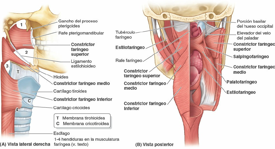 y el habla. Los músculos faríngeos están ilustrados en la figura 9-48, y sus inserciones, inervación y acciones se describen en la tabla 9-6. Los constrictores de la faringe tienen un fuerte recubrimiento fascial interno, la fascia faringobasilar (fig. 9-47 B), y un delgado recubrimiento fascial externo, la fascia bucofaríngea (v. fig. 9-42 A). Inferiormente, la fascia bucofaríngea se fusiona con la lámina pretraqueal de la fascia cervical profunda. Los constrictores de la faringe se contraen de manera involuntaria, de modo que la contracción tiene lugar secuencialmente desde el extremo superior al inferior de la faringe, impulsando el alimento hacia el interior del esófago. Los tres constrictores de la faringe están inervados por el plexo nervioso faríngeo, que está formado por ramos faríngeos de los nervios vago y glosofaríngeo y por ramos simpáticos del ganglio cervical superior (v. fig. 9-47 A; tabla 9-6). El plexo faríngeo se localiza en la pared lateral de la faringe, principalmente sobre el constrictor medio de la faringe. FIGURA 9-48. Músculos de la faringe. 1849 https://booksmedicos.org https://booksmedicos.org booksmedicos.org Push Button0: