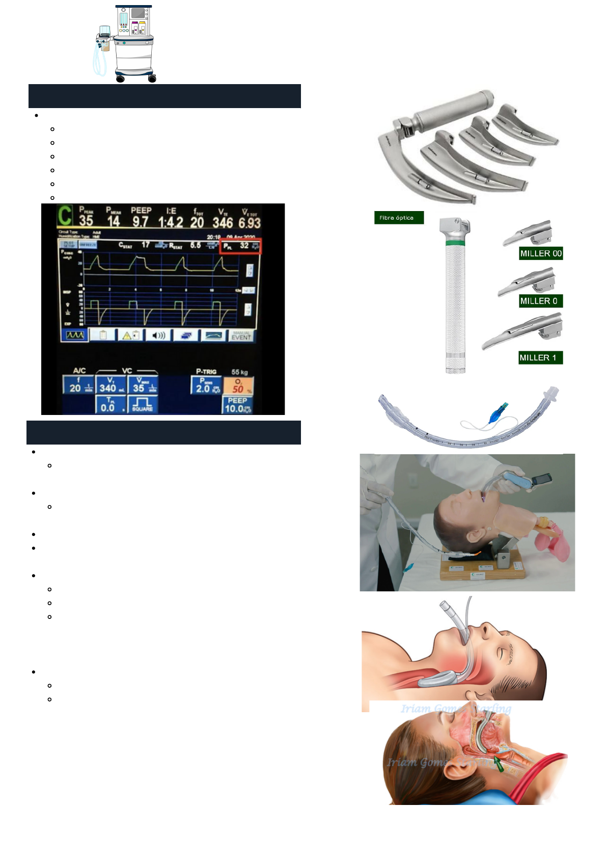 EQUIPAMENTOS MONITOR DA VENTILAÇÃO MECÂNICA Monitorizar os parâmetros da ventilação mecânica: Pressão de pico Pressão de platô Frequência respiratória Fração inspirada de oxigênio (FiO2) PEEP - pressão expiratória final positiva Fração inspiratória e expiração EQUIPAMENTOS DE VIA AÉREA Laringoscópio de Macintosh Em países desenvolvidos está em desuso, mas ainda é muito usado no Brasil Laringoscópio de Miller - mais usados em neonatos *Não existe diferença de efetividade entre o Macintosh e Miller Tubo de intubação Videolaringoscópio - é a nova recomendação; Mais fácil para intubar. Máscara laríngea Equipamento de resgate Não veda bem a via aérea superior Dá pra usar como método ventilatório quando o paciente está de jejum, pois como não veda bem se o estômago estiver cheio (cirurgias de emergência, por exemplo) pode haver broncoaspiração. Cânula de Guedel Equipamento que serve para abaixar a língua Útil para pacientes que tem SAOS (síndrome da apneia obstrutiva do sono), pois subtende-se que tenha desabamento da língua quando inconsciente, e pode dificultar a intubação. EQUIPAMENTOS CAPNÓGRAFO Dispositivo PADRÃO-OURO para certificar se o paciente foi intubado!!! Mede o CO2 expirado Aparece uma curva no monitor Se não tiver curva, o tubo está no lugar errado Pode ser Main stream ou Side stream ESTAÇÃO DE ANESTESIA Sistema de ventilação Sistema respiratório O sistema de ventilação entrega a ventilação a partir do sistema respiratório Sistema de fornecimento de gases Para anestésicos inalatórios Monitor de ventilação (anteriormente descrito) Monitor cardíaco: Eletrocardioscopia Frequência cardíaca Saturação Pulso Pressão arterial EQUIPAMENTOS TERMÔMETRO DE TEMPERATURA CENTRAL Preciso Geralmente se coloca no esôfago ou orofaringe, mas pode colocar no meato acústico externo, no reto, ou na bexiga Coloca onde for mais adequado de acordo com a situação, a depender do órgão cirurgiado. Alterações de temperatura podem levar à arritmias, discrasias sanguíneas. OXÍMETRO DE PULSO Saturação de O2 Leitura da frequência da absorção da luz Por isso, existem algumas coisas que podem atrapalhar a leitura: esmalte, pele escura, foco de luz cirúrgico, hipoperfusão periférica pode mascarar a saturação real A precisão diminui em níveis baixos de oxihemoglobina A medida em que a saturação vai baixando, vai diminuindo a precisão, por exemplo uma saturação de 40, pode ser bem mais ou bem menos: Pulse oximeter Waveform Associe a curva com a clínica do paciente! TENSIÔMETRO - ESFIGMOMANÔMETRO PNI (PRESSÃO NÃO INVASIVA) Aparelho para aferir a pressão arterial Método de avaliação é oscilométrico O manguito insufla até ocluir a artéria , depois desinsufla até sentir a pressão arterial sistólica e oscilar :) Cuidado com o paciente se mexendo ou tremendo de frio -> pode alterar a aferição!!! PRESSÃO ARTERIAL INVASIVA (PAI) Insere o cateter na artéria e no equipo, e o equipo liga no monitor. Analisa pulso a pulso (+ preciso) Mais comum puncionar a a. radial. Pode ser um cateter de Seldinger ou Jelco (o número do Jelco é inversamente proporcional ao calibre - 14 (+grosso) >24 EQUIPAMENTOS BIS - ÍNDICE BISPECTRAL Mede a atividade elétrica neuronal quando o paciente está anestesiado - hipnose Coloca-se os eletrodos na cabeça Vai de 0 a 100, mas o valor recomendável é de 40-60 Níveis muito baixos podem levar ao paciente a entrar em delírio depois de acordar da anestesia TOF- TRAIN OF FOUR Avalia o nível de profundidade do bloqueio neuromuscular. Coloca os eletrodos no nervo ulnar e no polegar Estimula o nervo ulnar e mede as contrações no polegar Quanto mais profundo o bloqueio, menos contrações você vai ter. EQUIPAMENTOS DE INFUSÃO Para infusão de noradrenalina, adrenalina, dobutamina, opioides, hipnóticos. Para um período maior de infusão BOMBAS DE VELOCIDADE CONTÍNUA Bomba de equipo Bomba de seringa BOMBA TCI - TARGET CONTROL INFUSION Infusão alvo controlada Variam a velocidade Modelos farmacológicos acoplados OUTROS Agulha de raquianestesia Agulha para peridural Cateter de punção central com 3 vias Casos + complexos Monitorizar pressão venosa central Infusão de drogas vasoativas