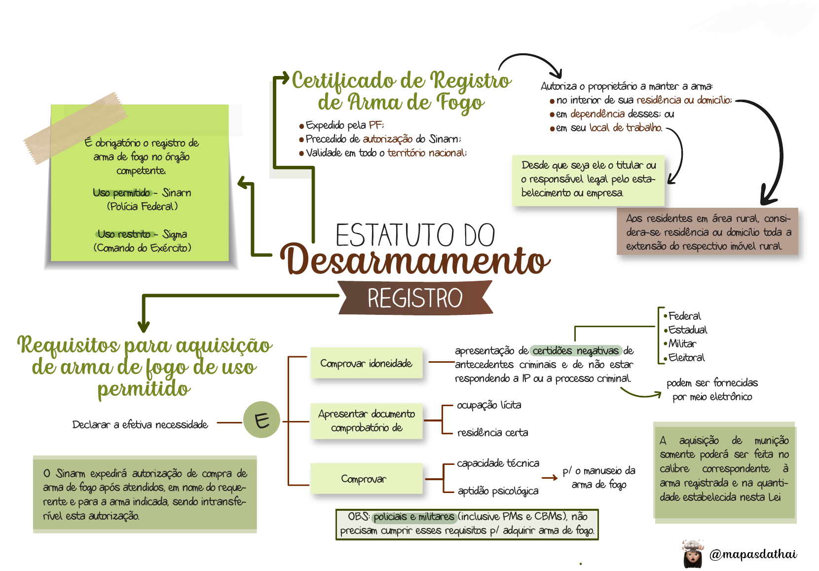 registro ESTATUTO DODesarmamento É obrigatório o registro de arma de fogo no órgão competente. Uso permitido - Sinarn (Polícia Federal) Uso restrito - Sigma (Comando do Exército) Certificado de Registro de Arma de Fogo Requisitos para aquisição de arma de fogo de uso permitido Expedido pela PF; Precedido de autorização do Sinarn; Validade em todo o território nacional; Desde que seja ele o titular ou o responsável legal pelo esta- belecimento ou empresa. Declarar a efetiva necessidade Comprovar idoneidade Apresentar documento comprobatório de Comprovar capacidade técnica aptidão psicológica p/ o manuseio da arma de fogo OBS: policiais e militares (inclusive PMs e CBMs), não precisam cumprir esses requisitos p/ adquirir arma de fogo. ocupação lícita residência certa apresentação de certidões negativas de antecedentes criminais e de não estar respondendo a IP ou a processo criminal. Federal Estadual Militar Eleitoral podem ser fornecidas por meio eletrônico E O Sinarm expedirá autorização de compra de arma de fogo após atendidos, em nome do reque- rente e para a arma indicada, sendo intransfe- rível esta autorização. A aquisição de munição somente poderá ser feita no calibre correspondente à arma registrada e na quanti- dade estabelecida nesta Lei Aos residentes em área rural, consi- dera-se residência ou domicílio toda a extensão do respectivo imóvel rural. Autoriza o proprietário a manter a arma: no interior de sua residência ou domicílio; em dependência desses; ou em seu local de trabalho. toes I I: E . Licenciado para - R A Y A N E D U A R T E - P rotegido por E duzz.com