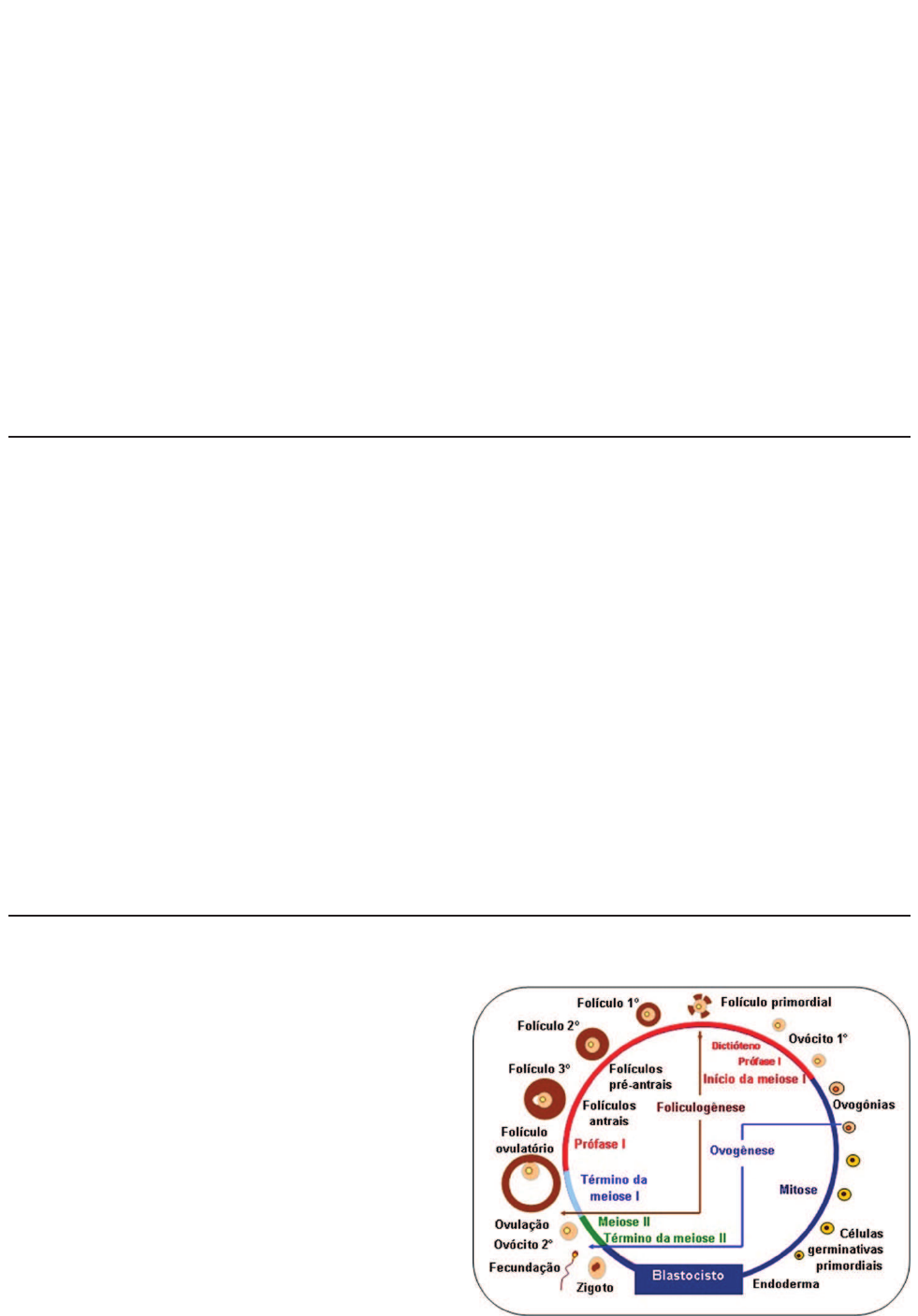 245UNOPAR Cient Ciênc Biol Saúde 2013;15(3):245-50 Adona PR, Manzani PS, Guemra S, Miranda MS, Ohashi OM Paulo Roberto Adonaab*; Paulo Sérgio Monzaniab; Samuel Guemraab; Moysés dos Santos Mirandac; Otavio Mitio Ohashic Resumo Os ovários são órgãos sexuais femininos que tem como principais funções a gametogênese e a esteroidogenese. A gametogênese caracteriza- se pela produção de células reprodutivas femininas ou óvulos e a esteroidogenese pela produção de hormônios esteróides. Em especial nos ruminantes, a formação dos gametas femininos e dos folículos ovarianos é iniciada no período pré-natal. Esta revisão destaca os principais processos morfofisiológicos envolvidos na ovogênese e na foliculogênese. A ovogênese pode ser definida como o conjunto de processos que compreende o desenvolvimento e diferenciação das células germinativas primordiais até a formação do óvulo e sua fecundação. Já a foliculogênese inclui a unidade morfofuncional do ovário que desempenha a função de produção de hormônios esteróides e a de manutenção da viabilidade do óvulo até a ovulação. Com o crescente avanço das biotécnicas de reprodução assistida, a compreensão das funções da ovogênese e foliculogênese é essencial para eficiência reprodutiva dos animais e para obtenção de descendentes viáveis a partir de ovócitos cultivados in vitro. Palavras-chave: Folículo Ovariano. Mamíferos. Ovulação. Abstract The ovaries are the female sexual organs whose main functions are the gametogenesis and steroidogenesis. Gametogenesis is characterized by the production of female reproductive cells or ova, and steroidogenesis by the production of steroid hormones. Especially in ruminants, the formation of female gametes and ovarian follicles is initiated in the prenatal period. This review highlights the main morphophysiological processes involved in oogenesis and folliculogenesis. Oogenesis can be defined as the set of processes covering the development and differentiation of primordial germ cells until the formation of the egg and its fertilization. On the other hand, folliculogenesis includes morphofunctional unit of the ovary that serves as the production of steroid hormones and maintenance of the viability of the egg until ovulation. With an increasing breakthrough of biotechnical assisted reproductive functions, understanding of oogenesis and folliculogenesis is essential for reproductive efficiency of animals and for obtaining viable offspring from oocytes cultured in vitro. Keywords: Ovarian Follicle. Mammals. Ovulation. Ovogênese e Foliculogênese em Mamíferos Oogenesis and Folliculogenesis in Mammals ªUniversidade Norte do Paraná PR, Brasil bAgropecuária Laffranchi, PR, Brasil cUniversidade Federal do Pará, PA, Brasil *E-mail: paulo_adona@yahoo.com.br Recebido: 31 de maio de 2012; Aceito: 02 de outubro de 2012 Artigos de revisão / review Article 1 Introdução A ovogênese refere-se à sequência de eventos em que as células germinativas primordiais diferenciam- se inicialmente em ovogônias, seguindo para ovócitos primários e posteriormente secundários, quando ocorre a extrusão do primeiro corpúsculo polar. O processo é finalizado com a fecundação do ovócito maturo e a liberação do segundo corpúsculo polar. O evento da foliculogênese inicia-se com a formação dos folículos primordiais, que progridem para primários, secundários, terciários, pré-ovulatórios e finaliza com a ovulação de um ovócito maturo, neste caso da espécie bovina (Figura 1). Este estudo tem por finalidade destacar os principais processos morfofisiológicos envolvidos na ovogênese e na foliculogênese. Figura 1: Diagrama simplificado da ovogênese e foliculogênese2,14. 246 UNOPAR Cient Ciênc Biol Saúde 2013;15(3):245-50 Ovogênese e Foliculogênese em Mamíferos 2 Desenvolvimento 2.1 Métodos A revisão da literatura foi baseada em pesquisa na base de dados PubMed, SciELO e Biblioteca Digital de Teses e Dissertações da Universidade de São Paulo - USP, utilizando as palavras-chave “Foliculogênese”, “ovogênese”, “folículos ovarianos”, “células germinativas primordiais” e “gametas femininos” e selecionando, entre os artigos encontrados, aqueles que correlacionavam com o artigo ovogênese e foliculogênese em mamíferos. A diferenciação das células da linhagem germinativa feminina ocorre totalmente, ou quase totalmente, na fase embrionária, dependendo da espécie1,2. As células germinativas primordiais (2n) migram para as gônadas femininas (ovário), onde iniciam o processo de diferenciação para ovogônias (2n). Estas células apresentam intensa proliferação através da divisão mitótica, mantendo-se diploides2,3. Ainda na fase embrionária, estas células iniciam o processo de diferenciação para ovócitos primários (2n), dando início ao processo meiótico com a duplicação do DNA; esse estádio da divisão celular é interrompido antes de completar a prófase da primeira das duas divisões meióticas que caracterizam o processo1,3,4. Ao nascerem, os bovinos dispõe de determinado número de ovócitos primários, cada qual com o material genético duplicado2. O processo de diferenciação dos ovócitos primários para secundários é iniciado na maturidade sexual, quando um ovócito (2n = 60 cromossomos já duplicados) conclui a primeira meiose iniciada na fase fetal; na espécie bovina, este processo ocorre em intervalos médios de 21 dias. Nesta fase, o ovócito secundário (n = 30 cromossomos duplicados) encontra-se apto para fecundação. Após a fusão com o espermatozóide, o ovócito finaliza sua segunda divisão meiótica (n = 30 cromossomos simples). O material genético do ovócito é reduzido à metade por meio de duas divisões meióticas sucessivas. A ploidia celular retorna à sua conformação original (2n) após a fecundação do ovócito com a interação (singamia) dos pronúcleos masculino e