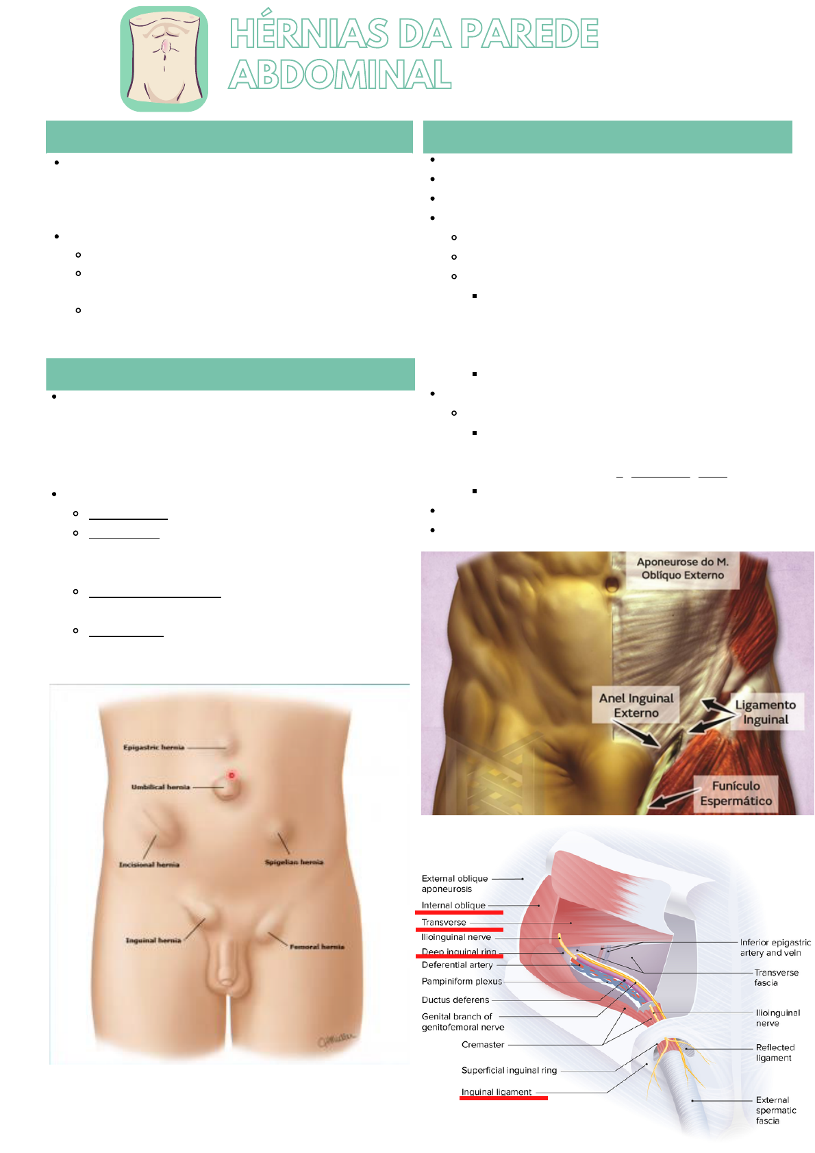 PAREDE ABDOMINAL: Estrutura musculo aponeurotica complexa que se prende a coluna vertebral posteriormente, ao gradil costal superiormente e aos ossos da pelve inferiormente FUNÇÕES DA PAREDE ABDOMINAL: PROTEGE E CONTEM VISCERAS ABDOMINAIS SUA MUSCULARUTRA ATUA INDIRETAMENTE PARA FLETIR A COLUNA VERTEBRAL A INTEGRIDADE DELA É FUNDAMENTAL PARA PREVENÇÃO DE HERNIA, SEJAM CONGÊNITAS, ADQUIRIDAS OU IARTROGÊNICAS. HÉRNIAS DA PAREDEHÉRNIAS DA PAREDE ABDOMINALABDOMINAL CONSIDERAÇÕES ANATÔMICAS INTRODUÇÃO CONCEITO: Protusão de alguma estrutura (gordura pré- peritoneal, epiplon - omento - prega peritoneal) ou víscera abdominal através de algum orifício em que se tem um defeito adquirido (hernia incisional) ou congênito (hernia inguinal indireta) TIPOS EPIGÁSTRICA: Entre o umbigo e o apêndice xinfoide INCISIONAL: Ocorre por não cicatrização da aponeurose e herniação do conteúdo abdominal para fora HERNIA DE SPIGELIAN: Abaixo da cicatriz abdominal, junto à borda do reto abdominal DA VIRILHA: Inguinal indireta, inguinal direta e femoral (por baixo do anel inguinal, enquanto as outras são por cima) ANATOMIA Vísceras Peritônio Espaço pré-peritoneal Parede posterior do espaço pré-peritoneal Músculo oblíquo interno Músculo transverso do abdome Fáscia transversalis Triângulo de Hesselbach: Limitado inferiormente pelo ligamento inguinal, medialmente pela borda do reto abdominal e lateralmente pelos vasos epigástricos - Hérnias diretas Anel inguinal interno Parede anterior Aponeurose do músculo oblíquo externo Borda espessa da aponeurose do m. o. e., que vai da espinha ilíaca superior à tuberosidade púbica - também chamado de ligamento inguinal Anel inguinal externo Gordura Pele HÉRNIAS DA PAREDEHÉRNIAS DA PAREDE ABDOMINALABDOMINAL PASSA PELO CANAL INGUINAL: LIGAMENTO REDONDO DO UTERO (até a vulva): Mulher FUNICULO ESPERMATICO: Homem Musculo cremáster Ducto, aa. e vv. Deferentes Aa. e vv. Espermáticas externas CONDUTO PERITONIOVAGINAL É por onde o testículo passa da cavidade abdominal para o escroto. Normalmente, ele se fecha, mas se não se fechar pode formar uma hérnia inguinal INDIRETA Plexo pampiniforme Ramo genital do nervo genitofemoral LIGAMENTO DE COOPER: Mais na parte inferior da fascia transversalis TRATO ILIOPÚBICO TRIÂNGULO DE HESSELBACH: Limitado inferiormente pelo ligamento inguinal, medialmente pela borda do reto abdominal e lateralmente pelos vasos epigástricos - Hérnias diretas HÉRNIAS DA PAREDEHÉRNIAS DA PAREDE ABDOMINALABDOMINAL HERNIA INGUINAL DIRETA HÉRNIA INGUINAL INDIRETA CONCEITO: Naturalmente, os testículos atravessam o anel inguinal interno > canal inguinal > anel inguinal externo para chegar na bolsa escrotal. Quando passam os testículos, teoricamente, o espaço inguinal fecha e, caso não feche, deixa espaço para formação de hernias. Logo, alças intestinais podem passar pelo canal e determinar um abaulamento nesse canal. NASCEM NO ANEL INGUINAL INTERNO! PODE SER: COMPLETO: Até a bolsa escrotal, podendo levar a alça intestinal até o escroto formando a hérnia inguinoescrotal PARCIAL: As alças caem no canal inguinal e o seu abaulamento forma a hernia inguinal indireta. CARACTERISTICAS: SÃO CONGÊNITAS MAIS COMUNS POR PERSISTENCIA DO CONDUTO PERITONIOVAGINAL LATERAL AOS VASOS EPIGÁSTRICOS INFERIORES ANTERIOR AO LIGAMENTO INGUINAL ANATOMIA DA REGIÃO INGUINAL CONCEITO: Normalmente um defeito e em idosos que tem defeito na musculatura na região da fascia transversalis especificamente no triangulo de Hesselbach. Quando tem aumento de pressão intrabdominal, pode acontecer que a víscera empurre o peritônio, empurrar a gordura periperitoneal e cai enluvada (pelo peritônio) no canal inguinal, formando a hernia inguinal direta. Desse modo, ocorre medial ao ligamento inguinal e aos vasos epigástricos inferiores Ora se o canal inguinal fica lateral aos vasos epigástrios inferiores, e como as hérnias inguinais indiretas ficam no canal, então estão laterais aos vasos. E as hérnias inguinais diretas ficam mediais aos vasos. Como visualizado na imagem a seguir: HÉRNIAS DA PAREDEHÉRNIAS DA PAREDE ABDOMINALABDOMINAL HERNIA INGUINAL DIRETA HÉRNIAS INGUINAIS INCIDENCIA: 80% INGUINAL E FEMORAL RISCO DE HERNIA INGUINAL: 8x maior no homem do que nas mulheres, além de ser mais frequente na direita NA VIRILHA: 96% são inguinais (a mais frequente é a DIRETA) e 4% femorais FATORES DESENCADEANTES: AUMENTO DA PRESSÃO INTRABDOMINAL: Hipertrofia prostática Ascite Tosse crônica Constipação crônica Tumorações abdominais volumosas DIAGNÓSTICO DAS HERNIAS INGUINAIS: EXAME CLÍNICO: Principal e único instrumento para o diagnóstico Pode usar mão de exames de imagem para o diagnóstico, quando há dúvidas e para diagnóstico diferencial: USG, TC, SENSAÇÃO DE PESO E DOR MAL DEFINIDA NA REGIÃO INGUINAL: Tem abaulamento local, podendo ou ser redutível HÉRNIA REDUTIVEL: Redutível espontaneamente ou por manobra manual como a de TAXE HERNIA ENCARCERADA: Irredutível HERNIA ESTRANGULADA: Irredutível causa dor hiperemia (+ sinais flogísticos), devido às alças isquêmicas/necrosadas, principalmente porque está ocorrendo encarceramento com comprometimento, vascular. PODE CAUSAR: Obstrução intestinal por distensão de alças intestinais, principalmente o delgado. EXAME FÍSICO: MANOBRA DE TAXE: Reduz a hernia apertando , de modo que se escute o barulho das alças intestinais EM PÉ: MANOBRA DE VALSAVA: Ao soprar o dorso da mão, tem se o abaulamento ou aparecimento das hernias HERNIA INDIRETA VOLUMOSA? Insinua se o saco herniario na bolsa escrotal, o pênis pode não ficar visível DIFERENCIANDO DIRETA E INDIRETA: Introduz o dedo no anel inguinal externo, através da bolsa escrotal> faz a manobra de valsalva PROTUSÃO AO ENCONTRO DO DEDO : Hernia inguinal indireta PROTUSÃO NA POLPA DIGITAL, A PARTIR DO ASSOALHO DO CANAL INGUINAL: Hernia inguinal direta HÉRNIAS DA PAREDEHÉRNIAS DA PAREDE ABDOMINALABDOMINAL Vam