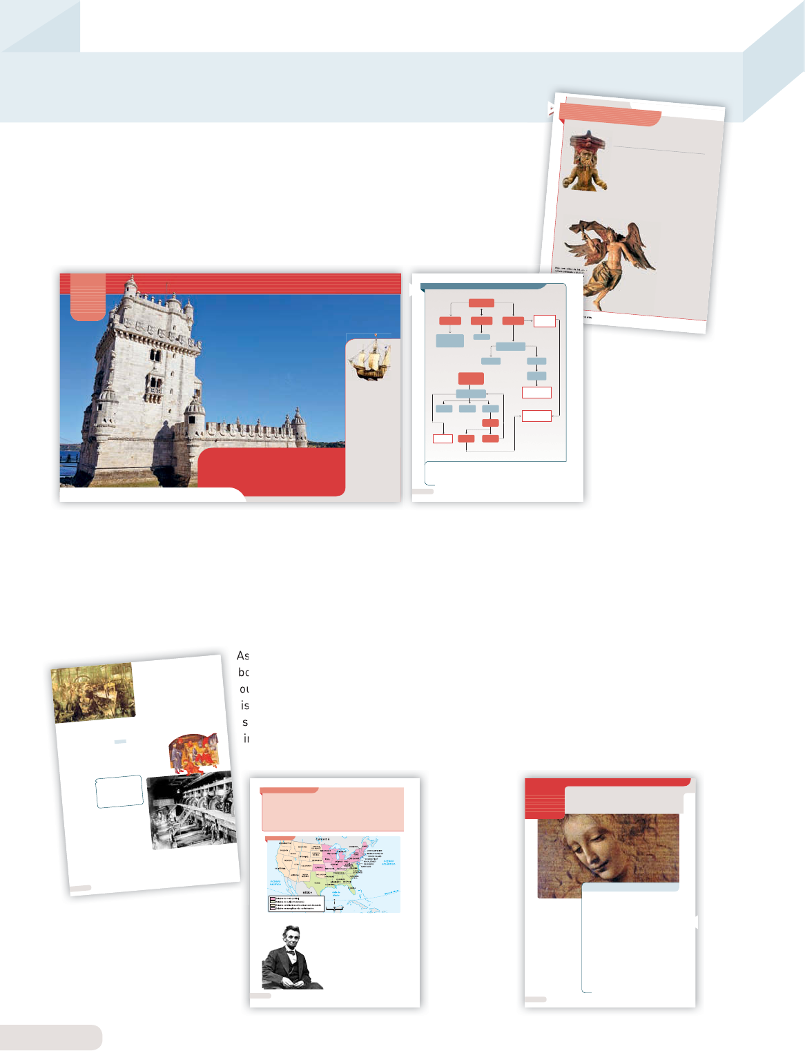 CONHEÇA SEU LIVRO P P leia sumários e resumos, que são importantes auxiliares para perceber como o texto está organizado e quais são as relações entre suas partes. Procure o objetivo da unidade e a relevância do tema na seção Discutindo a História. Examine o Sumário e o Esquema-resumo (seção Para recordar) antes de começar o estudo da unidade para ter uma ideia geral do assunto. Após a leitura, retome o Esquema-resumo e realize a atividade sugerida. P procure pistas sobre a organização do texto e o tratamento do assunto. Observar o que se destaca na página também é importante para perceber a estrutura geral do capítulo ou da unidade: títulos e subtítulos em letras coloridas, grandes ou pequenas são pistas sobre o que é considerado importante. Uma diferença de tamanho indica relação: o item menor está ligado ao item maior — ou está incluído nele ou é um exemplo dele. As imagens, mapas, esquemas e boxes ilustram aspectos importantes ou complementam informações. Por isso, também podem dar boas pistas sobre a organização do todo e a importância das informações. P pergunte! Inicie a leitura com alguma questão em mente, algo que você queira saber e que acha que o texto responderá. Olhe as imagens e mapas, pois eles podem despertar sua curiosidade e sugerir perguntas. Pense no que já sabe sobre o assunto e no que mais gostaria de conhecer. Caso nenhuma pergunta lhe venha à cabeça, comece a ler refletindo sobre aquelas propostas na seção Para pensar historicamente. Logo você estará formulando as próprias questões, que lhe servirão de guia na sua leitura. 150 PARA ENT ENDER NOSSO TEMPO: O SÉC ULO XIX Para aumentar os lucros, elev ou-se a especia liza- ção do trabal ho. Isso represe ntou a alienaçã o do traba- lhador em relaç ão a sua ativida de. Enquanto n a Antigui- dade ou na Ida de Média o art esão conhecia o processo de produção in teiro, realizand o ele mesmo to das as eta- pas, o operário moderno perd eu o controle d o conjunto da produção. P assou a ser resp onsável por ap enas uma parte do ciclo produtivo de u ma mercadoria , ignoran- do os procedim entos técnicos envolvidos. Al ém disso, recebendo um salário em troc a da atividade mecânica realizada, o ope - rário alienav a o seu trabalh o aos capitalista s, transformando - -o em merca - doria sujeita a o mercado. Novas forma s de trabalho A industrializa ção gerou sign ificativas trans for- mações em qu ase todos os s etores da vida humana. Na estrutura s ocioeconômic a, deu-se a sep aração de- finitiva entre o capital, repres entado pelos d onos dos meios de prod ução, e o traba lho, representa do pelos assalariados. N a maior parte dos casos, elim inou-se a antiga organiz ação corporati va da produçã o utilizada pelos artesãos . Os trabalhado res já não eram os donos das fer- ramentas e má quinas, passan do a viver da ú nica coisa que lhes perten cia: sua força d e trabalho, tran sformada em mercadoria e explorada ao máximo. Para enfrentar o quadro socia l da nova ordem industrial, ass ociaram- -se em organiz ações como as trade unions (s indicatos). p Laminadores de ferro, de A. V on Mozel, 1875. Esta pintura do final do século XIX retrata o pe sado trabalho n uma lamina- ção de ferro, co m o ambiente h ostil, sujo e que nte de uma siderúrgica. alienação: conc eito aplicado po r Karl Marx em seus e scritos, segundo o qual o trabalho esp ecializado que carac- terizou a indus trialização “alie nou” o operário, ou seja , separou-o do p roduto de seu trabalho . O trabalhador , desse modo, em vez d e realizar-se pe lo tra- balho, se des umanizava, exe rcendo suas tarefas me canicamente. p A atividade a rtesanal medie val e a indústri a do século XIX representam e struturas prod utivas bem dif erentes. Em cima, iluminura de 1390 mostra ndo artesãos: p equena pro- dução, trabalha dores donos do s meios de pro dução e dos frutos de seu t rabalho, habilid ade criativa e p rodutiva. Na foto inferior, de 1881, trabalho industrial nos Estados Uni- dos: operários, grande produç ão, assalariado s, sujeição à máquina e alien ação. A industrializ ação estabele ceu a suprem acia burguesa na o rdem econômi ca, isto é, toda a estrutu- ra produtiva e stava voltada p ara atender ao s interes- ses de lucro da burguesia. Ao mesmo tempo , acelerou o êxodo rural, o crescimento urbano e a for mação da classe operária – ou proletari ado. Inaugurav a-se uma nova época, na qual a política , a ideologia e a cultura gravitariam en tre dois polos: a burguesia in dustrial e o proletariado . Estavam fixad as as bases do progresso tec no- lógico e cientí fico, visando à invenção e ao aperfei- çoamento con stantes de nov os produtos e técnicas para o maior e melhor desem penho industr ial. Defi- niam-se tamb ém as condiçõ es para o imp erialismo colonialista e o confronto en tre burguesia e proleta- riado, que iria m definir as d écadas seguin tes da his- tória europeia e mundial e aju dar a formar as ba ses do mundo c on- temporâneo. R e p ro d u ç ã o /B il d a rc h iv P re u s s ic h e r K u lt u rb e s it z, B e rl im , A le m a n h a . R e p ro d u ç ã o /M u s e u B ri tâ n ic o , L o n d re s , In g la te rr a . B e tt m a n n /C o rb is /L a ti n s to ck 50 EUROPA, O CENTRO DO MUNDO Arte e tecnologia4 CAPÍTULO p Desenho de Leonardo da Vinci, de cerca de 1508. R e p ro d u ç ã o /G a le ri a N a c io n a l, P a rm a , It á li a . Cultura, arte e tecnologia Você já parou para pensar no que é arte? E tecnologia? Se usarmos um conceito amplo de cultura, tanto a arte quanto a tecnologia expressam a cultura de um povo ou de um conjunto de povos. Antes do processo de integração do mundo pelas navegações e pelo comércio mundial europeu, as sociedades mais ou menos isoladas entre si desenvolveram arte e tecnologia de forma paralela. De maneira simplificada, tecnologia é o conjunto de conhecimentos prát