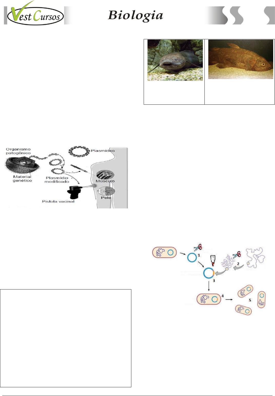 151 Simétrico Pré-Universitário – Curso de Biologia – Prof. Landim – www.simetrico.com.br 151 Em Engenharia Genética, a obtenção de fragmentos de DNA serve para criar, in vitro, novas moléculas, recortando e colando vários pedaços de informações. A quebra da molécula de DNA ocorre em pontos específicos por meio da ação de enzimas, separando o DNA em pedaços menores para facilitar a manipulação. As enzimas que “cortam os cromossomos”, com esta finalidade, são chamadas de: A) Endonucleases de restrição. B) Desoxirribonuclease. C) Polimerases. D) Ribonucleases. 14. (UESPI) Todos os anos o Ministério da Saúde do Brasil realiza campanha nacional para erradicação da Poliomielite com a administração da vacina oral Sabin, uma das vacinas mais modernas do mundo, visto que bastam algumas gotas contendo antígenos virais para imunizar a população. Contudo, a perspectiva é que as futuras vacinas sejam preparadas a partir do DNA dos microrganismos alvo. Sobre este assunto, observe a figura abaixo e assinale a alternativa correta. Scientific American (1999) A) Vacinas de DNA são constituídas por cromossomos do próprio hospedeiro enxertados com DNA microbiano. B) Vacinas de DNA induzem a produção de proteínas microbianas pelas células do hospedeiro. C) Vacinas de DNA não induzem a formação de células B de memória e anticorpos no hospedeiro. D) Vacinas de DNA não poderiam ser produzidas contra vírus que possuem material genético de RNA. E) Vacinas de DNA induziriam a produção de anticorpos somente quando o hospedeiro fosse infectado pelo microrganismo alvo da vacina. 15. (UPE) Apesar de as evidências atuais sugerirem que os peixes pulmonados com nadadeiras lobadas, a exemplo de Protopterus annectens, possam ser evolutivamente mais próximos dos tetrápodes, estudos filogenéticos envolvendo os celacantos continuam sendo fundamentais para a compreensão de como os vertebrados conseguiram migrar da água para a terra. No Brasil, Schneider e seu grupo identificaram trechos do DNA do peixe Latimeria chalumnae, espécie de celacanto, responsáveis pela ativação de genes codificadores de proteínas relacionadas ao desenvolvimento de membros. Em seguida, inseriram alguns desses genes em embriões de camundongos. Verificaram que, mesmo sendo duas espécies separadas por milhões de anos de evolução, os genes responsáveis pelo desenvolvimento de membros nos celacantos ativaram os mesmos mecanismos para o surgimento de membros nos camundongos. Disponível em: http://revistapesquisa.fapesp.br/2013/04/18/pesquisadoresidentificam-ancestral- dos-vertebrados-de-quatro-patas/. Adaptado. Protopterus annectens é uma espécie africana bastante primitiva de peixe pulmonado com nadadeiras com ossos. O genoma do peixe Latimeria chalumnae (celacanto) foi sequenciado e estudado pelos pesquisadores no Brasil. Em relação ao experimento com o uso de transgenia mencionado no texto, assinale a alternativa correta. A) Os celacantos são considerados transgênicos por possuírem bactérias que permitem a inserção de genes de desenvolvimento de membros nos camundongos. B) Os camundongos são considerados transgênicos por possuírem, naturalmente, genes de desenvolvimento do celacanto, responsáveis pela ativação de genes codificadores de proteínas relacionadas ao desenvolvimento de membros. C) Os genes de desenvolvimento de membros nos celacantos ativaram os mesmos mecanismos para o surgimento de membros nos camundongos transgênicos, evidenciando sua ancestralidade comum. D) Os genes inativos relacionados ao desenvolvimento de membros do celacanto são responsáveis pela ativação de genes inativos codificadores de membros nos embriões de camundongos transgênicos. E) Os genes do celacanto receberam e incorporaram os nucleotídeos dos genes do camundongo, permitindo o acesso ao genoma do mamífero, que, nesse caso, é um organismo transgênico. 16. (UPE) Observe a figura a seguir: Disponível em: https://sites.google.com/site/geneticaemmovimentoo/musicas (Adaptado) Assinale a alternativa que indica corretamente o método da genética molecular ilustrado com suas respectivas etapas. A) Na clonagem molecular do RNA, após o corte do vetor viral (1) e do gene de interesse (2) pela mesma enzima de restrição, ocorre a formação do RNA recombinante (3) pela ação da helicase que une o RNA do fago lambda ao RNA exógeno. A partir da bactéria hospedeira transformada (4), obtêm-se bilhões de bactérias, cada uma possuindo uma ou mais cópias do RNA recombinante (5). B) Na clonagem molecular do DNA, após o corte do vetor (1) e do gene de interesse (2) pela mesma enzima de restrição, ocorre a 152 Simétrico Pré-Universitário – Curso de Biologia – Prof. Landim – www.simetrico.com.br 152 formação do DNA recombinante (3) pela ação da ligase, que une o DNA do plasmídeo ao DNA exógeno. A partir da bactéria hospedeira transformada (4), obtêm-se bilhões de bactérias, cada uma possuindo uma ou mais cópias do DNA recombinante (5). C) Na cultura de tecidos vegetais, após o corte do vetor (1) e do gene de interesse (2) por diferentes enzimas de restrição, ocorre a formação do DNA recombinante (3) pela ação da DNA polimerase, que une o DNA do plasmídeo vegetal ao DNA exógeno. A partir dos fragmentos de tecido de uma única planta transformada (4), obtêm-se centenas de plantas similares, cada uma possuindo uma ou mais cópias do DNA recombinante (5). D) Na transgenia animal, após o corte do gene de interesse (1) e do vetor (2) e pela mesma enzima de restrição, ocorre a formação do gene recombinante (3) pela ação da topoisomerase que une os dois RNAs. A partir da fecundação in vitro (4), ocorre a implantação dos espermatozoides recombinantes nos óvulos de uma fêmea de camundongo (5). E) Na transgenia entre animais e vegetais, após o corte do gene de interesse (1) e do vetor (2) por diferentes enzimas de restrição, ocorre a formaç