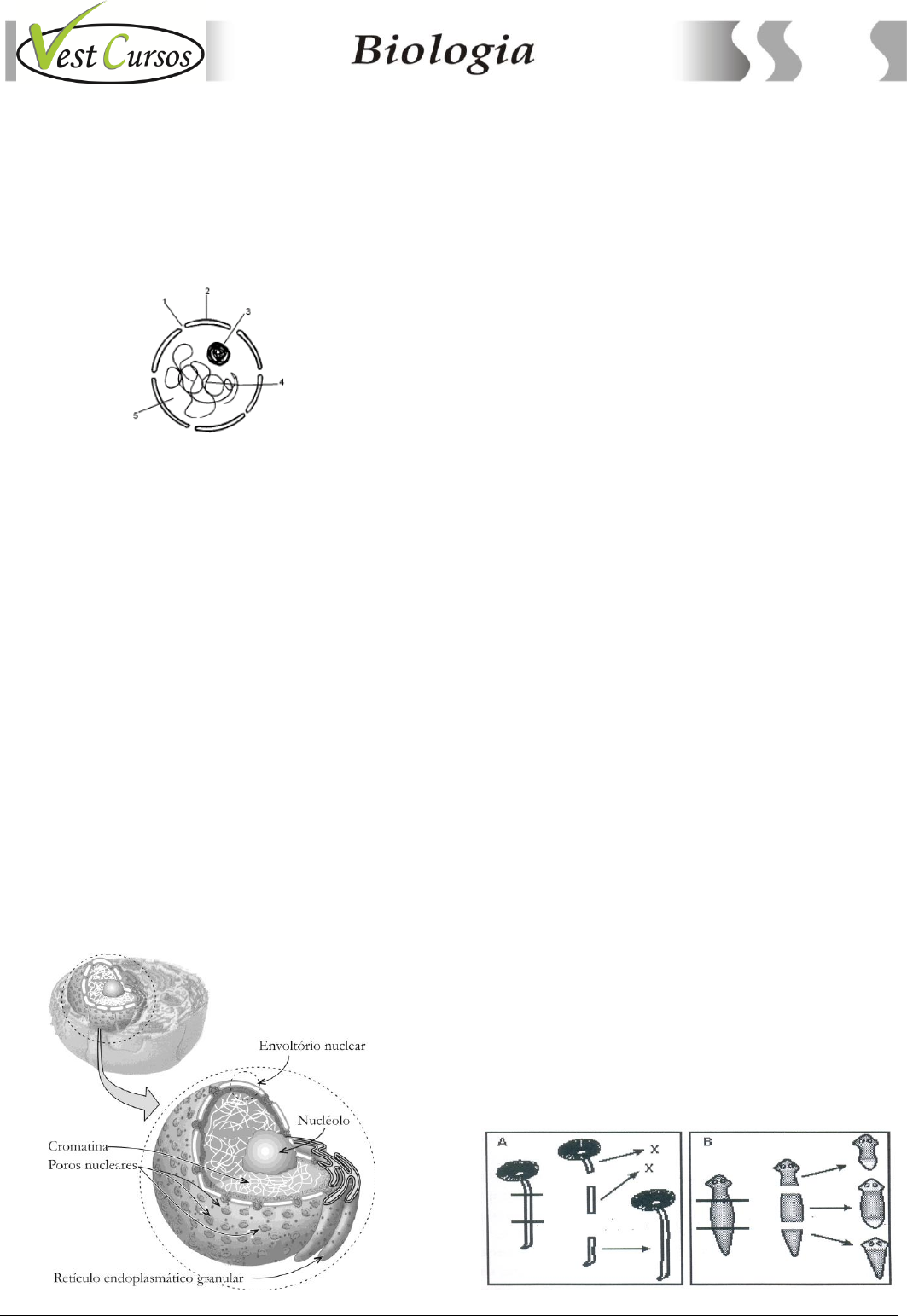 286 Simétrico Pré-Universitário – Curso de Biologia – Prof. Landim – www.simetrico.com.br 286 D) 1-microssomos; 2-tradução; 3-endonucleases; 4-mesossomo. E) 1-nucleossomos; 2-transcrição; 3-não histônicas; 4-fio de cromossomo plasmidial. 26. (UFPI) Analisando o desenho esquemático que representa o núcleo de uma célula animal qualquer, podemos identificar que o componente responsável pela síntese de RNA que forma o ribossomo é assinalado pelo número: A) 1. B) 2. C) 3. D) 4. E) 5. 27. (UFRN) Uma das diferenças entre homem e mulher é o número de cópias dos genes dos cromossomos X, pois a mulher tem duas cópias de cada gene e o homem, apenas uma. Considerando-se a quantidade de proteína que é produzida a partir desse cromossomo, pode-se afirmar: A) O homem produz mais proteína que a mulher, devido à estimulação induzida pela testosterona. B) A mulher produz duas vezes mais proteína que o homem, pois ela apresenta dois cromossomos X. C) O homem produz menos proteína que a mulher, pois, nele, um corpúsculo de Barr está inativado. D) A mulher produz a mesma quantidade de proteína que o homem, pois, nela, um dos cromossomos X está inativado. 28. (UNIRIO) Em muitas bactérias, o genoma consiste de uma molécula de DNA circular; portanto, esse DNA não tem: A) telômeros. B) códons da replicação. C) promotores. D) códons de iniciação. E) exons. Questões estilo V ou F 29. (UFPB) A figura, a seguir, representa uma célula eucariótica com detalhe para o núcleo e seus constituintes. De acordo com as funções desempenhadas pelos constituintes indicados na figura, identifique as afirmativas corretas: (_) O envoltório nuclear comunica-se com o retículo endoplasmático granular. (_) A síntese de proteínas será afetada, se o nucléolo for experimentalmente removido ou impedido de funcionar. (_) Os poros permitem a passagem da cromatina para o citosol, fenômeno indispensável para que ocorra a síntese de proteínas. (_) A cromatina é constituída pelas moléculas de DNA associadas a proteínas. (_) Os poros permitem a entrada das subunidades dos ribossomos para o núcleo. Questões discursivas 30. (UNICHRISTUS) Células somáticas de fêmeas de mamíferos apresentam corpúsculo de Barr ou cromatina sexual enquanto nas células somáticas de machos, essa estrutura se mostra ausente. Baseando-se no texto que se refere a organismos que apresentam cariótipos normais, responda: A) A que corresponde a cromatina sexual? B) Em que época da vida de uma mulher se forma a cromatina sexual? C) Qual o significado da cromatina sexual nas fêmeas? Justifique resumidamente. D) Tratando-se de cariótipos anormais, justifique por que mulheres com síndrome de Turner e homens com síndrome de Klinefelter não apresentam fenótipos normais? 31. (FUVEST) Em vez de seqüenciar as bases nitrogenadas de todos os cromossomos de uma planta com um genoma muito grande, pesquisadores selecionaram partes desse genoma para seqüenciar. Somente as seqüências de DNA que correspondem ao conjunto dos RNA mensageiros transcritos no fruto serão estudadas. O DNA a ser sequenciado foi sintetizado em laboratório, tendo como molde as moléculas de RNA extraídas dos frutos. A) Se os cientistas fossem seqüenciar todo o genoma dessa planta, haveria diferença se o material genético viesse do fruto ou da folha da planta? Justifique. B) No estudo das sequências que tiveram como molde RNA mensageiro, faria diferença se esse RNA mensageiro fosse extraído das folhas ou dos frutos? Justifique. 32. (UNICAMP) O processo de regeneração pode ocorrer tanto em organismos unicelulares como pluricelulares, conforme já demonstrado em vários experimentos. O resultado de um desses experimentos pode ser observado na figura A, que mostra a regeneração de apenas um fragmento da alga unicelular Acetabularia. A figura B mostra a regeneração de todos os fragmentos de uma planária (platelminto). 287 Simétrico Pré-Universitário – Curso de Biologia – Prof. Landim – www.simetrico.com.br 287 A) Por que no experimento com Acetabularia não houve regeneração de todos os segmentos? B) Explique por que o processo de regeneração das planárias difere daquele que ocorre na Acetabularia. 33. (UNICAMP) Em rãs, um espermatozoide apresenta de zero a três complexos de poro por µm2 de envoltório nuclear (carioteca) e ausência de nucléolo, enquanto um oócito apresenta ao redor de 60 complexos de poro por µm2 de envoltório e um grande nucléolo? A que se deve a diferença entre os dois tipos celulares? Explique. 34. (UFV) O esquema abaixo representa diferentes níveis de organização do material genético, embora nem todas as estratégias biológicas de armazenamento desse material sejam realizadas dessa forma. Observe o esquema com os números indicativos e cite: A) dois exemplos em que seus genomas não apresentam este tipo de organização. B) o nome da unidade estrutural e o de seu principal componente protéico, representado no nível indicado por II. C) o número que representa o nível mais básico de organização da cromatina, e o nome específico da fase na qual se encontra VI. 35. (UFPR) O complexo de poro nuclear é a estrutura que regula o trânsito de grandes moléculas (como RNA e proteínas) entre o núcleo celular e o citoplasma. O número de complexos de poro encontrados no envoltório nuclear pode variar entre diversos tipos celulares. A) Coloque em ordem crescente de número de complexos de poro por núcleo os seguintes tipos celulares: neurônio, espermatozoide, adipócito. B) Justifique a ordem escolhida, com base nos conhecimentos de biologia e fisiologia celular. 36. (UFC) Um animal comum na caatinga nordestina é o lagarto Tropidurus hispidus, comumente conhecido como calango. Seu cariótipo, determinado por geneticistas do Departamento de Biologia da UFC, evidencia 18 pares de cromossomos, com cada cromossomo contendo um centrômero. O conhecimento do cariótipo é u