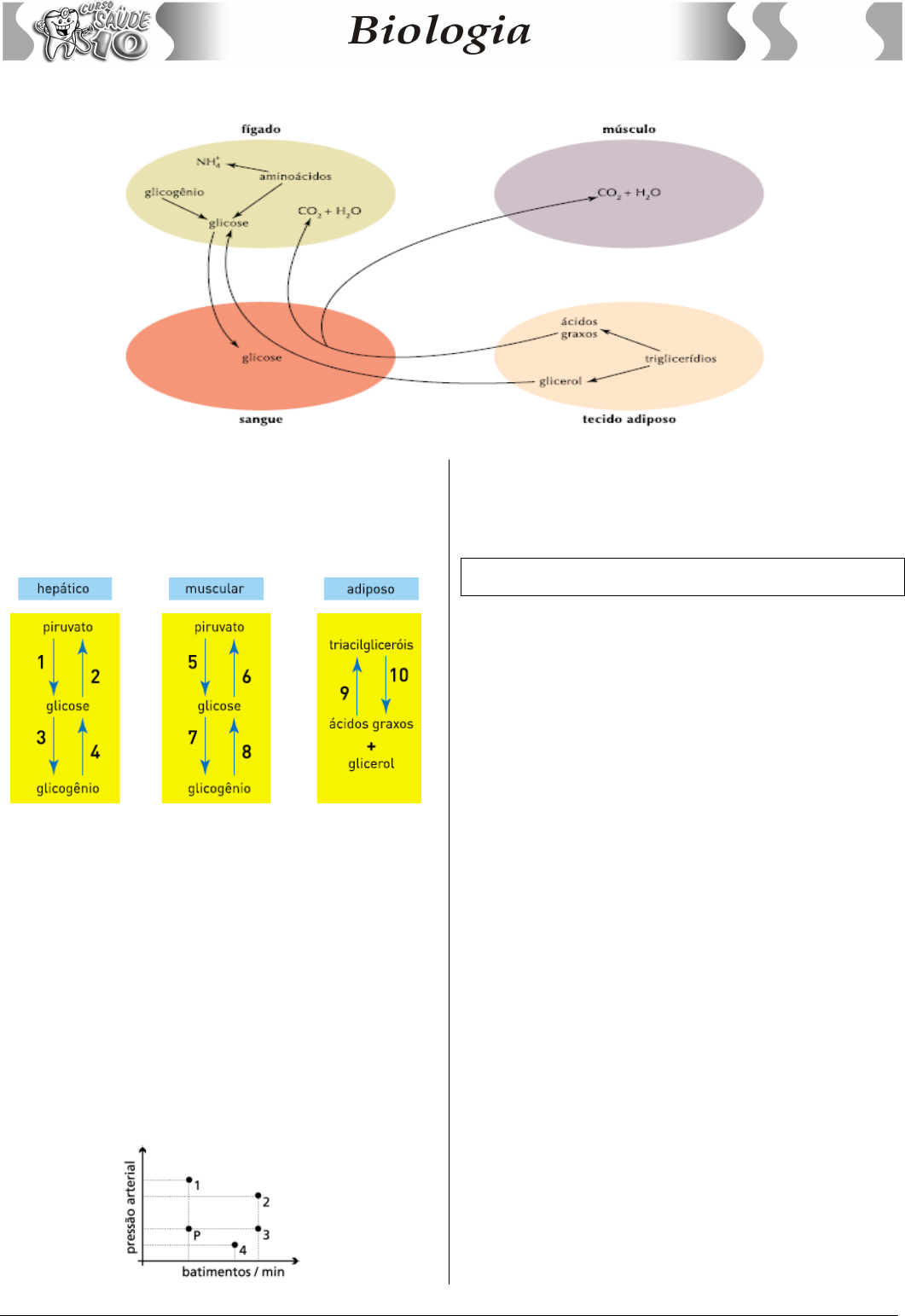 Simétrico Pré-Universitário – Curso de Biologia – Prof. Landim – www.simetrico.com.br 56 A condição representada pelo esquema é: A) repouso. B) diabetes melito. C) hiperinsulinismo. D) dieta hiperglicídica. 31. (UERJ) O esquema abaixo destaca três tipos de tecidos e algumas de suas respectivas etapas metabólicas. A epinefrina é um hormônio liberado em situações de tensão, com a finalidade de melhorar o desempenho de animais em reações de luta ou de fuga. Além de agir sobre o coração e os vasos sangüíneos, facilita o consumo de reservas orgânicas de combustível pelos músculos. Para cumprir essa função metabólica, estimula a glicogenólise hepática e muscular, a gliconeogênese hepática, a glicólise muscular e a lipólise no tecido adiposo. No esquema, as etapas ativadas pela epinefrina correspondem às representadas pelos números: A) 1 – 3 – 5 – 8 – 10. B) 1 – 4 – 6 – 8 – 10. C) 2 – 3 – 6 – 7 – 9. D) 2 – 4 – 5 – 7 – 9. 32. (UERJ) Em um animal, antes de injetar-se um extrato de porção medular de glândula supra-renal, foram medidos sua pressão arterial e o número de batimentos cardíacos por minuto, representados pelo ponto P no gráfico abaixo; alguns minutos após a injeção, foram repetidas essas mesmas medidas. O único ponto do gráfico que pode representar as medidas feitas após a injeção é o de número: A) 1. B) 2. C) 3. D) 4. 33. (UFV) “Suíços produzem confiança engarrafada.” Folha de S. Paulo, 02 jun. 2005, título de reportagem. Nos experimentos, os pesquisadores suíços mostraram que numa transação financeira, usando um spray nasal com oxitocina em um grupo de investidores, estes passaram a confiar mais nos gerentes, ao contrário daqueles que receberam uma substância inócua. Este hormônio está ligado à criação de elos sociais e à regulação da atividade cerebral, dentre outros, mas ninguém sabia que ele participava de forma tão ativa num processo como a confiança. Em relação à oxitocina, é incorreto afirmar que ela: A) acelera as contrações uterinas que levam ao parto. B) promove diretamente a maturação do folículo ovariano. C) é secretada pela neuro-hipófise. D) atua na contração da musculatura lisa das glândulas mamárias. E) pode ser liberada pelo estímulo de sucção do peito da mãe pelo bebê. 34. (UFPB) A síndrome metabólica representa uma situação clínica caracterizada pelo comprometimento conjunto de diversas funções do organismo, entre elas: hipertensão arterial, dislipidemia (aumento da concentração de lipídios no sangue), obesidade visceral, disfunção endotelial e diabetes melito tipo 2. Com base no exposto e na literatura sobre fisiologia humana, é correto afirmar: A) A hipertensão arterial leva ao acúmulo de gordura visceral. B) A diabetes melito tipo 2 ocorre devido à não produção do hormônio insulina. C) A dislipidemia ocorre devido ao aumento da absorção de glicose pelo organismo. D) A hipertensão arterial ocorre devido à baixa concentração de lipídios na corrente sanguínea. E) A diabetes melito tipo 2 ocorre devido à diminuição da absorção de glicose, aumentando, assim, o metabolismo lipídico. 35. (UFCG) Chamado de mal do século e classificado como um dos principais vilões da vida moderna, o estresse é cada vez mais frequente e atinge a população de forma indistinta. Analise as assertivas: Simétrico Pré-Universitário – Curso de Biologia – Prof. Landim – www.simetrico.com.br 57 I. A resposta que o organismo elabora frente às situações de estresse se fundamenta na liberação de adrenalina, um hormônio produzido pela glândula supra-renal, que, quando liberado em excesso, determina alterações que refletem o sofrimento do organismo. II. As situações de estresse podem elevar a pressão arterial e os batimentos cardíacos, provocar sudorese, palidez, elevação do açúcar no sangue, dor de estômago, irritabilidade, insônia, dor de cabeça e dificuldade de concentração. III. O estresse provoca alterações no metabolismo celular e dessa forma pode favorecer o desenvolvimento de células tumorais (neoplasias malignas) principalmente por comprometer o funcionamento adequado do sistema imunológico. IV. Embora sejam muitos os aspectos negativos relacionados ao estresse, este aumenta a liberação dos hormônios do crescimento e da tireóide e dessa forma é útil no desenvolvimento saudável do indivíduo. Estão corretas: A) I, II e IV. B) II, III e IV. C) I, II e III. D) II e III. E) I, II, III e IV. 36. (UFCG) Os sistemas endócrino e nervoso atuam na coordenação e regulação das funções corporais. Enquanto as mensagens nervosas são de natureza eletroquímica, as mensagens transmitidas pelo sistema endócrino têm natureza química – os hormônios. Estes são produzidos pelas glândulas endócrinas e se distribuem pelo sangue, modificando o funcionamento de outros órgãos, denominados órgãos-alvo. No que diz respeito à relação entre os sistemas nervoso e endócrino, analise as assertivas: I. O sistema nervoso pode fornecer ao endócrino a informação sobre o meio externo, ao passo que o sistema endócrino regula a resposta interna do organismo a esta informação. II. O hipotálamo controla as atividades da hipófise posterior (neurohipófise), enquanto que o controle da hipófise anterior (adenohipófise) é feito diretamente por neurônios oriundos do córtex cerebral. III. Os hormônios produzidos pela hipófise anterior podem atuar diretamente sobre as células em diversas partes do organismo (Ex. hormônio do crescimento) ou sobre outras glândulas endócrinas (Ex. hormônios gonadotrófico e tireotrófico). IV. O sistema porta-hipofisário é o meio pelo qual os fatores de liberação oriundos do sistema nervoso chegam até à hipófise anterior, local em que exercem seus efeitos de liberação ou inibição. Estão corretas: A) III e IV. B) I, II e IV. C) II e IV. D) I, 