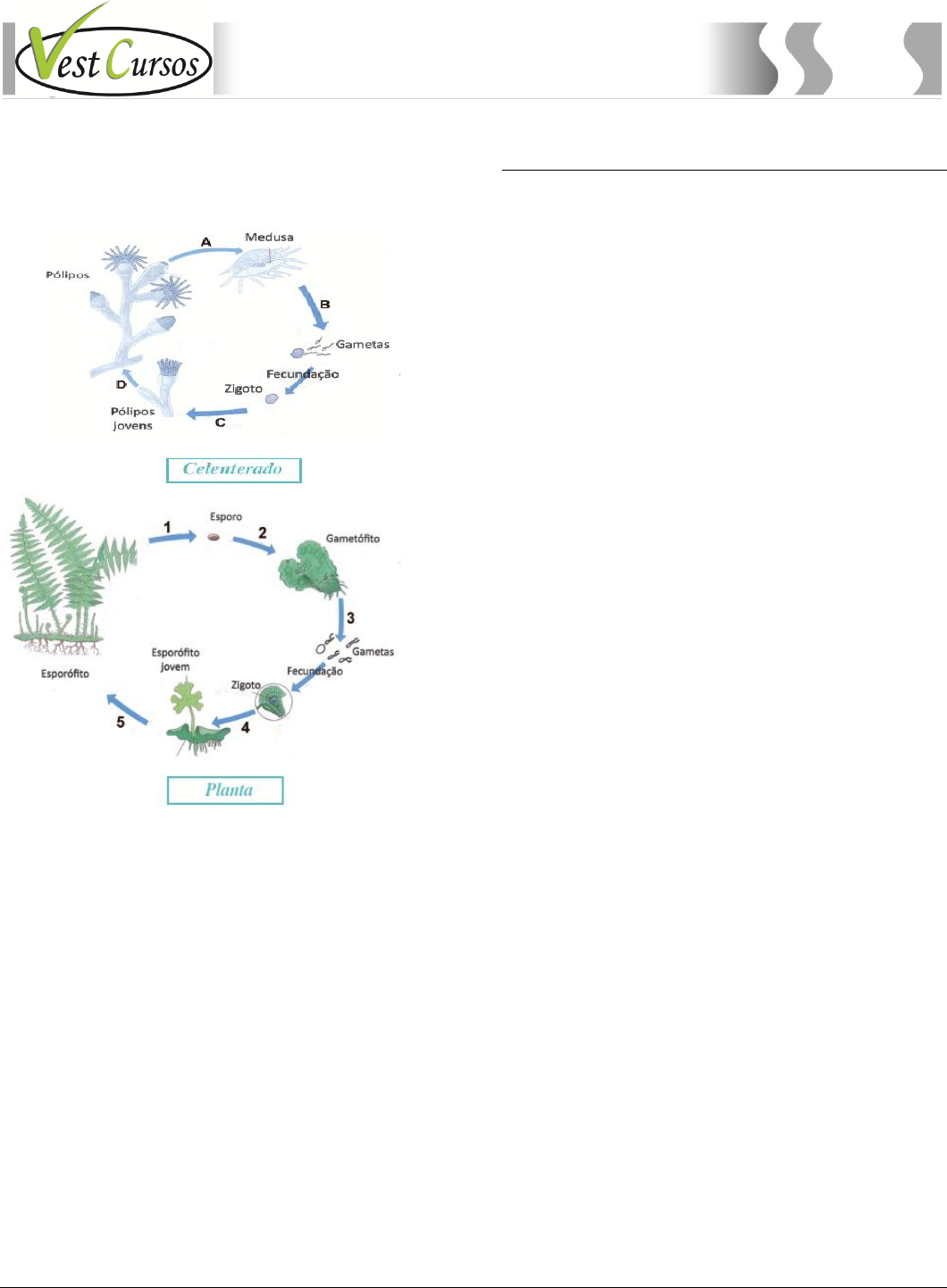 VestCursos – Curso de Biologia – Prof. Landim – www.VestCursos.com.br 21 Curso de Biologia 24. (UFRJ) Os esquemas a seguir mostram os ciclos de vida de dois organismos que apresentam alternância de gerações, um celenterado e uma planta, com a indicação do ponto onde ocorre a fecundação. No esquema do celenterado, as etapas são designadas por letras, no da planta, por números. A) Indique, para cada esquema, a etapa em que ocorre a meiose. B) Identifique a ploidia (haploide ou diploide) de cada um dos quatro indivíduos (pólipo, medusa, esporófito e gametófito) indicados nos ciclos. AULA 3 Vegetais intermediários: Briófitas e Pteridófitas Briófitas As briófitas são plantas consideradas criptógamas, por não produzirem flores, e avasculares, por não apresentarem tecidos condutores de seiva. Nesses organismos, a seiva é conduzida de célula a célula, por processos passivos denominados osmose e difusão. Em função disso, constituem plantas de pequeno porte, sendo que a maioria não ultrapassa 20cm de altura. Vivem em ambientes úmidos e sombreados, uma vez que não possuem estruturas impermeabilizantes desenvolvidas e são por isso muito suscetíveis à dessecação. Por serem criptógamas e dotadas de gametas masculinos flagelados, são fortemente dependentes da água para a reprodução. Ocorrem em abundância nas matas tropicais, formando coberturas densas, principalmente sobre barrancos úmidos e troncos de árvores. Existem espécies, como a Ricciocarpus natans, que vivem flutuando em águas doces pouco movimentadas, e outras, como a Riccia fluitans, que vivem submersas em água doce. A maioria das briófitas, entretanto, ocorre sobre solos úmidos, não havendo nenhuma espécie marinha. Alguns autores argumentam que pela ausência de raiz, caule e folhas, as briófitas devam ser consideradas talófitas, com o corpo sendo caracterizado como um talo, composto de rizóides, caulóides e filóides, todos avasculares. Apesar disso, ao contrário das algas, as briófitas possuem organização tecidual bem caracterizada. Diversidades das briófitas Briófitas hoje são consideradas um grupo de três Divisões: Divisão Hepatophyta, Divisão Anthocerotes e Divisão Bryophyta. Divisão Hepatophyta A Divisão Hepatophyta corresponde às hepáticas, e receberam esse nome em função da forma do corpo de algumas espécies, que lembra os lobos do fígado (hepatos = fígado). A maioria das hepáticas apresenta corpo achatado, cresce em contato com o solo e não possui porte ereto. Apresentam rizóides que fixam as plantas no substrato de onde absorvem água. A absorção de água e de minerais também se processa diretamente por todo o gametófito. As hepáticas mais comuns são as do gênero Marchantia, que vivem em solos úmidos. São as plantas mais simples: as únicas que não possuem estômatos. As espécies aquáticas Ricciocarpus natans e Riccia fluitans, já mencionadas, são briófitas do grupo das hepáticas. VestCursos – Curso de Biologia – Prof. Landim – www.VestCursos.com.br 22 Curso de Biologia Talo de hepáticas em forma de lóbulos hepáticos. Divisão Anthocerotes A Divisão Anthocerotes corresponde às antocerotas, cujo gênero mais comum é o Anthoceros, têm corpo multilobado e crescem aderidas a solos e rochas úmidos. Antóceros. Divisão Bryophyta A Divisão Bryophyta corresponde aos musgos, e são muito comuns em ambientes úmidos, sobre solos, rochas e árvores, os quais eles cobrem amplamente, formando o lodo ou limo. É raro que ocorram como indivíduos isolados; formam, em geral, uma extensa e ampla cobertura sobre o solo e, em função disso, são importantes na proteção contra a erosão. O musgo individual consiste em um eixo principal ereto, o cauloide, de onde partem estruturas semelhantes a folhas, denominadas filoides. A planta fixa-se ao substrato através de estruturas chamadas rizoides, que absorvem água e sais minerais. Musgo. Alguns autores utilizam para as briófitas os termos rizoide, caule e folha, mas preferimos manter os termos rizoide, cauloide e filoide em função da ausência de tecidos vasculares nessas estruturas. Hadrome Apesar de serem consideradas plantas avasculares, certas espécies de musgo apresentam, na porção central do cauloide, um tecido especializado na condução de água e nutrientes pelo corpo da planta. Esse tecido, denominado hadrome, é formado por dois tipos de células: hidroides e leptoides. VestCursos – Curso de Biologia – Prof. Landim – www.VestCursos.com.br 23 Curso de Biologia Hidroides (do grego hydro, água) são células alongadas, com paredes transversais finas e altamente permeáveis, dispostas em fileira ao longo do cauloide. Ao se tornarem maduros, os hidroides morrem e tornam-se ocos, permitindo o deslocamento de água e nutrientes minerais em seu interior. Nisso eles se assemelham aos vasos lenhosos das planta vasculares, que também são células mortas, especializadas na condução de seiva bruta (água e sais). Leptoides (do grego leptos, fino) são células alongadas que, na maturidade, perdem o núcleo, mantendo o citoplasma. Os leptoides também se dispõem em fileiras ao longo do cauloide, mantendo-se unidos por plasmodesmos. Os leptoides formam um cilindro contínuo ao redor do feixe de hidroides e são especializados no transporte de substâncias orgânicas pelos corpo das plantas. Tanto em estrutura como em função, os leptoides são semelhantes aos vasos condutores de seiva elaborada (solução de substâncias orgânicas) das plantas vasculares. O conjunto formado por hidroides e leptoides assemelha-se ao encontrado em fósseis de plantas conhecidas como protraqueófitas, consideradas um elo evolutivo entre as plantas avasculares e as plantas vasculares (traqueófitas). Extraído de Amabis & Martho, Biologia dos Organismos, 2ª edição O musgo-de-turfeira ou turfa (gênero Sphagnum) é usado em países de clima temperado para evitar a erosão do solo, bem com