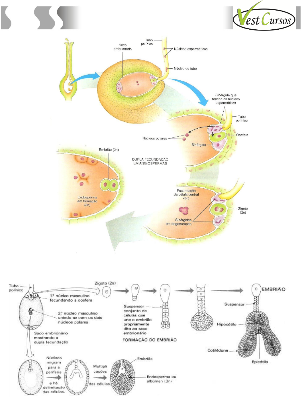 VestCursos – Curso de Biologia – Prof. Landim – www.VestCursos.com.br 46 Curso de Biologia Após a fecundação, as sinérgides e as antípodas degeneram. O zigoto (2n) sofre várias divisões mitóticas, gerando o embrião (2n). A célula geradora de albume (3n), também por divisões mitóticas, dá origem ao endosperma ou albúmen (3n), tecido que muitas vezes acumula reservas nutritivas utilizadas pelo embrião durante seu desenvolvimento. Formação do endosperma ou albúmen (3n). VestCursos – Curso de Biologia – Prof. Landim – www.VestCursos.com.br 47 Curso de Biologia Formação da semente O embrião maduro (2n) de angiosperma consiste basicamente em epicótilo, uma ou duas folhas, denominadas cotilédones, e um eixo abaixo dos cotilédones, denominado hipocótilo, que se estende até uma raiz embrionária denominada radícula. Com o desenvolvimento do embrião, os tegumentos do óvulo tornam-se impermeáveis. Nesse ponto, a estrutura toda passa a ser chamada de semente. Assim, a semente nada mais é do que o óvulo fecundado e desenvolvido. Os tegumentos do óvulo dão origem aos envoltórios da semente que contém o endosperma e o embrião, em situação dormente. Comparando-se as sementes de angiospermas com as de gimnospermas, verifica-se que ambas apresentam: - casca ou tegumento (2n) da semente, originada da diferenciação dos tegumentos (2n) do óvulo; - nucelo do megasporângio reduzido (2n); - tecido nutritivo denominado endosperma; - embrião (2n), que corresponde ao esporófito jovem (2n). A diferença entre elas está no tecido nutritivo ou endosperma, que nas gimnospermas é um tecido haploide, correspondendo aos restos do gametófito feminino (n) após a fecundação. Nas angiospermas, o endosperma é um tecido nutritivo especial, triploide, que se forma após a fecundação e não corresponde ao gametófito feminino. O endosperma das gimnospermas é também chamado de endosperma primário (n) e o das angiospermas, de endosperma secundário (3n), pois este se forma após a fecundação. A semente em angiospermas é formada por tegumento e amêndoa. O tegumento é constituído de: - testa (2n): originada da primina do óvulo; - tégmen (2n): originado da secundina do óvulo. A amêndoa é formada por: - embrião (2n): originado da oosfera fecundada; - endosperma (3n): tecido triploide originado da fusão dos dois núcleos polares com o núcleo espermático. Em algumas angiospermas, o endosperma é digerido pelo embrião antes de entrar em dormência. O endosperma digerido é transferido e armazenado geralmente nos cotilédones, que se tornam, assim, ricos em reservas nutritivas. Isso ocorre, por exemplo, em feijões, ervilhas e amendoins. As sementes que transferem as reservas do endosperma para os cotilédones são denominadas sementes sem endosperma ou sementes sem albúmen. Nas sementes em que isso não ocorre, os cotilédones não contêm reservas nutritivas, e as sementes são chamadas de sementes com albúmen (ou endosperma). À medida que a semente vai se formando, verifica-se, nas angiospermas, o desenvolvimento da parede do ovário da flor, um processo do qual irá resultar o fruto. Ao germinar, a semente dá origem à planta jovem (plântula), que por sua vez dá origem à planta adulta. ANGYOSPERMAE - Esporófito (2n): planta desenvolvida com raiz, caule, folhas, flores e sementes. - Androceu com estames (2n): parte masculina da flor, com estames que produzem grãos de pólen. - Grãos de pólen (n): esporos masculinos (micrósporos) modificados contendo duas paredes, exina e intina, e o gametófito masculino em seu interior. - Gametófito masculino (n): conjunto formado por célula do tubo e célula geradora (gametófito imaturo) e tubo polínico (gametófito maduro). - Gameta masculino (n): núcleos espermáticos. - Gineceu com pistilo (2n): parte feminina da flor, com ovários contendo óvulos. - Óvulo (2n): megasporângio revestido por dois tegumentos, primina e secundina. - Gametófito feminino (n): megaprótalo ou saco embrionário formado por apenas oito células haploides: uma oosfera, duas sinérgides, dois núcleos polares e três antípodas. - Gameta feminino (n): oosfera. - Semente: óvulo fecundado e desenvolvido. - Fruto: ovário desenvolvido. RESUMO DE DIFERENÇAS ENTRE GIMNOSPERMAS E ANGIOSPERMAS EM TERMOS REPRODUTIVOS: - o pólen de gimnospermas tem sacos aéreos e não possui exina e intina como em angiospermas; - o óvulo de gimnospermas não tem dois tegumentos (primina e secundina em angiospermas), apenas um; - em gimnospermas, com exceção das gnetófitas, não há a dupla- fecundação, uma vez que a célula geradora no grão de pólen também forma dois núcleos espermáticos, mas um deles degenera sem entrar no tubo polínico, de modo que não se forma uma célula geradora de albume ou um endosperma 3n; - neste caso, o endosperma é n, sendo equivalente às sobras do gametófito feminino n após a fecundação; - o gametófito feminino em gimnospermas não possui só 8 células haploides, mas várias células n, que se organizam formando dois ou três arquegônios, gametângios femininos (que não existem no VestCursos – Curso de Biologia – Prof. Landim – www.VestCursos.com.br 48 Curso de Biologia gametófito feminino das angiospermas), que formam cada qual uma oosfera; essas várias oosferas podem ser fecundadas por núcleos espermáticos de diferentes tubos polínicos, formando assim vários embriões (no entanto, apenas um embrião se desenvolve, e os demais se degeneram); - percebe-se então que arquegônio é uma estrutura que só existe em espermatófitas do grupo das gimnospermas; - não há ovários e frutos em gimnospermas. Semente de feijão (dicotiledônea). Fruto de milho com semente (monocotiledônea). Exercícios Questões estilo múltipla escolha 1. (UNIFOR) O esquema abaixo mostra uma flor completa de angiosperma. Sônia Lopes. BIO. São Paulo: Saraiva, 2004, v. único, p. 244 O grão de pólen e