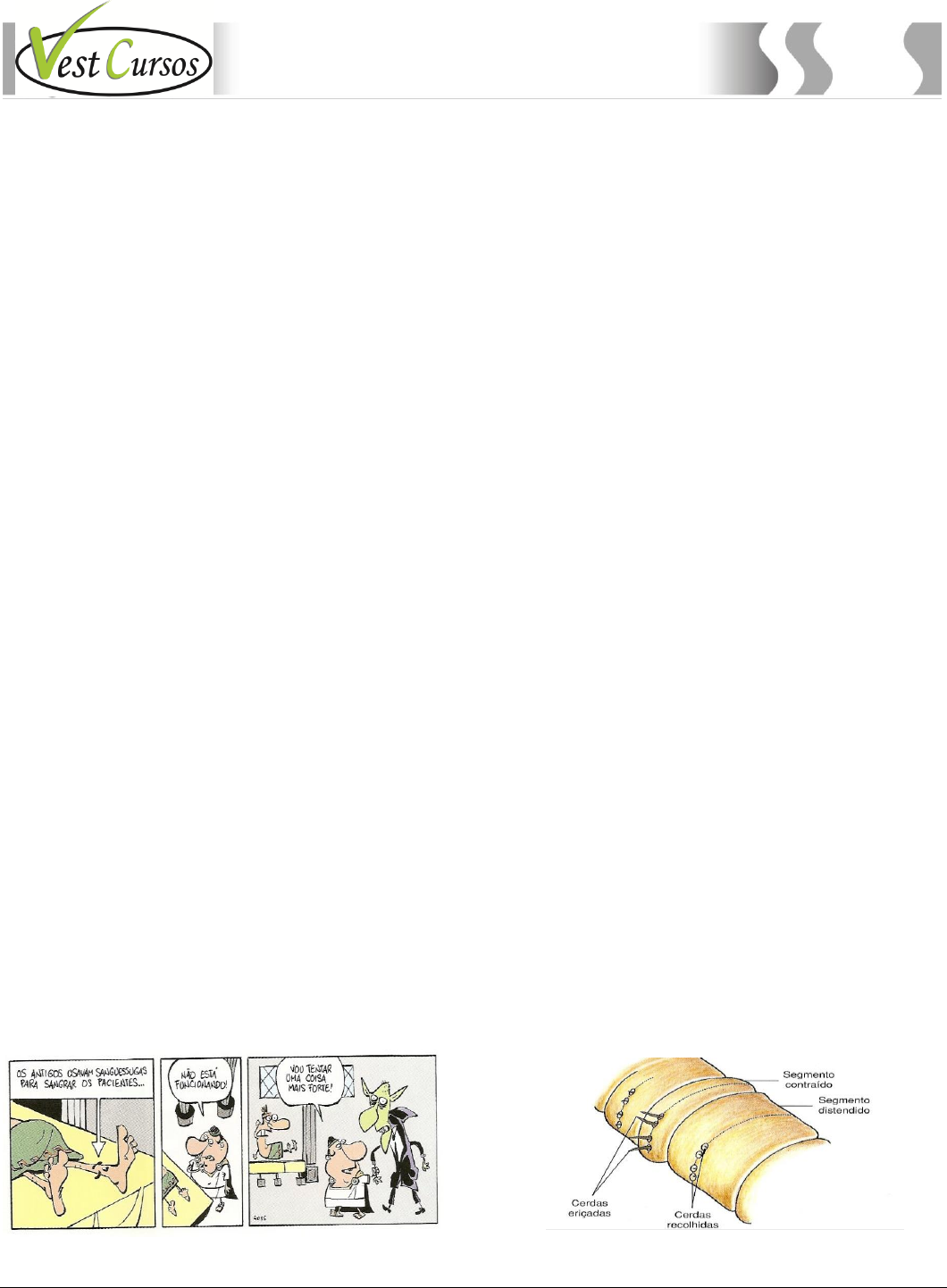 VestCursos – Curso de Biologia – Prof. Landim – www.VestCursos.com.br 241 Curso de Biologia mesmas. Além disso, as fezes e excretas das minhocas (à base de amônia), compõem um fertilizante agrícola natural conhecido como húmus, que facilita enormemente o desenvolvimento vegetal. Os túneis escavados por minhocas e a produção do húmus respondem pela grande importância agrícola desses animais, a ponto de haver uma atividade econômica denominada minhocultura própria para a criação deles. A minhoca vermelha da Califórnia (Eisenia foetida) e a minhoca gigante africana (Eudrilius eugeniae) são as espécies preferidas pelos minhocultores. Alguns anelídeos aquáticos agem como indicadores de poluição, por só se desenvolverem em águas poluídas, como é o caso dos vermes Tubifex. A presença deles na água é um indício da presença de poluentes orgânicos como os provenientes de esgoto doméstico. Outros anelídeos de razoável importância para as atividades humanas são os vermes sanguessugas (Hirudo medicinalis). Na medicina da Antiguidade, sanguessugas eram utilizadas numa prática muito comum da época, as sangrias. Acreditava-se que grande parte dos males que afetavam humanos eram resultantes do acúmulo de sangue “ruim”, devendo esse sangue ser removido para o organismo funcionar normalmente. Uma vez que sanguessugas dispõem de substâncias anestésicas em sua saliva, para não serem percebidas enquanto parasitam seus hospedeiros, elas eram frequentemente utilizadas para realizar as sangrias de modo indolor. Havia inclusive casas de sangria próprias para a aplicação desses animais. Apesar da prática de sangrias não ser mais considerada pela medicina, sanguessugas são ainda utilizadas na medicina moderna, com outros fins. Na recuperação de pacientes submetidos a cirurgias mais extensas, sanguessugas são utilizadas para remover acúmulos de sangue derramado sob a pele, os hematomas, tornando o pós-cirúrgico menos doloroso. Após o reimplante de órgãos amputados, o maior risco é o de uma oxigenação inadequada dos mesmos, conduzindo a uma necrose. Sanguessugas são aplicadas na extremidade do órgão reimplantado para, ao succionar o sangue, ativar a circulação e a oxigenação do mesmo, aumentando as chances de sucesso da cirurgia de reimplante. Só é meio nojento... É bom lembrar também que a hirudina da saliva das sanguessugas tem propriedades de interesse médico, sendo anticoagulante e anestésica. NÍQUEL NÁUSEA FERNANDO GONSALES Características gerais Anelídeos são: - bilatérias; - enterozoários de tubo digestivo completo; - protostômios; - eumetazoários triblásticos celomados (esquizocelomados); - metamerizados com metameria total. Em termos de fisiologia, anelídeos possuem: - respiração cutânea ou branquial; - sistema circulatório fechado; - sistema excretor formado por um par de metanefrídias em cada segmento; - tubo digestivo com papo, moela e tiflossole e digestão exclusivamente extracelular; - sistema nervoso ganglionar com um par de cordões nervosos ventrais; - reprodução com fecundação externa, podendo ser monoicos ou dioicos, e de desenvolvimento direto ou indireto. Fisiologia Tegumento A epiderme é um epitélio simples, recoberto por uma cutícula permeável. Uma vez que a pele é permeável, são capazes de realizar respiração cutânea, mas estão restritos a ambientes úmidos devido às altas chances de desidratação. Em algumas espécies, há cerdas de quitina, dispostas particularmente na região ventral; essas cerdas têm função sensorial e locomotora, dando apoio à locomoção do verme. Ainda em algumas espécies, há parapódios, projeções dermo- musculares laterais que servem como patas, tornando mais eficiente a locomoção, e inclusive possibilitando a natação por parte desses animais. Musculatura Logo abaixo da epiderme, encontra-se a musculatura principal do corpo, derivada da mesoderme e composta de uma camada externa circular e uma interna longitudinal, constituindo o tubo músculo dermático, que forma a parede corpórea. As contrações alternadas dessas musculaturas contraem (contração da musculatura circular) e distendem (contração da musculatura longitudinal) os metâmeros. Quando contraídos os metâmeros, as cerdas se eriçam, permitindo que se apoiem no solo, facilitando a locomoção como se fossem pernas. Quando os metâmeros distendem, as cerdas são recolhidas. Ação das cerdas na locomoção. VestCursos – Curso de Biologia – Prof. Landim – www.VestCursos.com.br 242 Curso de Biologia Respiração Anelídeos em geral apresentam uma respiração cutânea indireta, onde o oxigênio absorvido a partir da pele é conduzido aos tecidos pelo sangue. No caso de anelídeos aquáticos do grupo dos poliquetas, em muitos casos os parapódios apresentam grande desenvolvimento e vascularização e se ramificam, funcionando como brânquias externas. Circulação O sistema circulatório é do tipo fechado, independente do celoma, e consiste principalmente em dois vasos sanguíneos longitudinais, colocados dorsal e ventralmente em relação ao tubo digestivo. O vaso dorsal é contráctil, funcionando como um coração e impelindo o sangue de trás para diante, no outro, o ventral, o sangue circula em sentido inverso. Em cada metâmero, aparecem capilares transversais, que rodeiam o sistema digestivo, estabelecendo uma comunicação entre os vasos dorsal e ventral. Na região anterior do corpo, alguns vasos podem adquirir um calibre maior e uma musculatura mais desenvolvida, transformando-se em corações laterais. Na minhoca há 5 pares de vasos contráteis, os corações, situados ao redor do esôfago, que impelem o sangue para o vaso ventral. O sangue é constituído por um plasma, que contém amebócitos livres e um pigmento respiratório na forma de hemoglobina dissolvida (deve-se perceber que a hemoglobina não se encontra em hemácias, mas diretamente no plasma). E