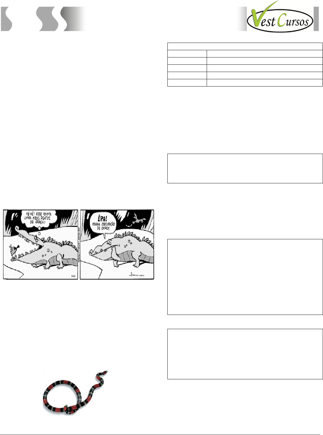 VestCursos – Curso de Biologia – Prof. Landim – www.VestCursos.com.br 316 Curso de Biologia E) serpentes não utilizam veneno para capturar presas, mas somente para se defender; do contrário, poderiam se envenenar ao consumir a caça. 26. (UFPB) Os anfíbios foram os primeiros vertebrados a invadirem o ambiente terrestre. No entanto, ainda necessitam da água para completarem o seu ciclo de vida. Para a adaptação dos anfíbios à vida terrestre, observam-se: A) desaparecimento de brânquias e aparecimento de pulmões nos adultos; respiração cutânea e pele rica em glândulas mucosas; absorção de água por osmose. B) amplificação do sistema sonoro com aparecimento de tímpano; olho com pálpebras e glândulas lacrimais; fecundação externa com produção de ovos sem casca. C) presença de pele lisa, pobre em queratina; olhos com pálpebras e glândulas lacrimais; excreção de amônia. D) respiração cutânea; presença de olhos com pálpebras e glândulas lacrimais; absorção de água por osmose. E) aparecimento de olhos com pálpebras e glândulas lacrimais; surgimento de membrana timpânica; presença de pulmões nos adultos. 27. (UFRN) NÍQUEL NÁUSEA – FERNANDO GONSALES Folha de São Paulo, 08.10.2001. Répteis e aves foram os primeiros grupos animais na escala filogenética a apresentar âmnio e alantoide no ovo. Por conta desse ganho evolutivo, esses animais tornaram-se capazes de A) desenvolver-se sem metamorfose. B) produzir maior número de filhotes. C) formar a cavidade celomática. D) reproduzir-se fora da água. 28. (UFF) Um agricultor capturou uma cobra venenosa em sua propriedade e verificou as seguintes características do corpo do animal: CARACTERÍSTICAS ANATÔMICAS cabeça arredondada e com a mesma largura do pescoço olhos minúsculos e de difícil identificação fosseta loreal Ausente cauda extremidade rombuda dentição Proteróglifa Fonte: www.cobrasbrasileiras.com.br. Acesso em setembro de 2011. Analisando as características morfológicas acima, pode-se concluir que a serpente era uma A) jararaca. B) coral verdadeira. C) surucucu. D) cascavel. E) falsa coral. 29. (UFMG) Dois estudantes, nadando numa lagoa, observaram alguns organismos na água e estabeleceram o seguinte diálogo: “- Olha os girinos, filhotes de sapo. - Não são girinos, são alevinos. - Mas... O que são alevinos? - São filhotes de peixe, animais dioicos." Com base nesse diálogo e em seus conhecimentos biológicos, é incorreto afirmar que A) os alevinos são etapas do desenvolvimento dos peixes. B) os girinos são etapas de metamorfose. C) os peixes realizam fecundação cruzada. D) os sapos realizam fecundação interna. 30. (UFT) O exame da dentição é frequentemente usado na identificação de serpentes peçonhentas e não-peçonhentas, sendo um critério bastante fidedigno para isso (mais confiável que o formato da cabeça e o padrão de coloração). Serpentes verdadeiramente peçonhentas (cascavéis, jararacas e corais) possuem dentes (presas) especializados para inoculação da peçonha, a qual é produzida em glândulas veneníferas especializadas localizadas uma em cada lado da cabeça, atrás do olho. A inoculação da peçonha através destes dentes requer a contração da musculatura em torno da glândula e leva à ejeção da peçonha. Fonte: http://www.univap.br/cen/denticao_serpentario.php (Acesso em 30-01-2014) Há essencialmente quatro tipos de dentição encontrados em serpentes. I. Possuem dentes maciços. II. Possuem um ou mais pares de dentes posteriores desenvolvidos, com sulco que permite a passagem da peçonha. III. Possuem presas anteriores fixas, com sulco que permite a passagem da peçonha. IV. Possuem um par de presas anteriores ocas, com canal injetor de peçonha, inseridas em uma maxilar móvel. Relacione o tipo de dentição de serpentes descritas acima com a sua classificação e marque a alternativa correta. A) I-Áglifas; II-Proteróglifas; III-Opistóglifas; IV-Solenóglifas. B) I-Solenóglifas; II-Opistóglifas; III-Proteróglifas; IV-Áglifas. C) I-Proteróglifas; II-Solenóglifas; III-Áglifas; IV-Opistóglifas. D) I-Opistóglifas; II-Áglifas; III-Solenóglifas; IV-Proteróglifas. E) I-Áglifas; II-Opistóglifas; III-Proteróglifas; IV-Solenóglifas. VestCursos – Curso de Biologia – Prof. Landim – www.VestCursos.com.br 317 Curso de Biologia Questões discursivas 31. (FUVEST) Um grupo indígena do sudoeste dos Estados Unidos, denominado Anasazi, tinha um animal vertebrado entre as divindades que cultuava. O desenho a seguir baseia-se na figura encontrada em seus objetos sagrados. Um estudante, desejando identificar esse animal, ficou em dúvida entre duas classes de vertebrados e por isso solicitou, ao professor, informações quanto ao tipo de revestimento corporal ou quanto ao desenvolvimento embrionário do animal desenhado. A) Como a informação sobre o revestimento corporal permite distinguir entre as duas classes? B) Como a informação sobre o desenvolvimento embrionário permite distinguir entre as duas classes? 32. (UNICAMP) Os anfíbios foram os primeiros vertebrados a habitar o meio terrestre. Provavelmente surgiram de peixes crossopterígeos que eventualmente saiam da água à procura de insetos. Antes de ganharem o meio terrestre, esses ancestrais dos anfíbios passaram por modificações em suas estruturas e em sua fisiologia. A) Mencione duas modificações importantes nessa transição. B) Os anfíbios são classificados em três ordens: Gymnophiona ou Apoda (cobras cegas), Urodela (salamandras) e Anura (sapos, rãs e pererecas). Mencione uma característica exclusiva de cada uma delas. 33. (UNICAMP) Muitas espécies de tartarugas marinhas estão ameaçadas de extinção pela ação do homem. As rotas de migração das tartarugas marinhas são bastante estudadas no Brasil pelo Projeto Tamar-Ibama, através da colocação de transmissores em seus cascos. Adaptado do site http://www.projetotamar.org.br A) Sabe