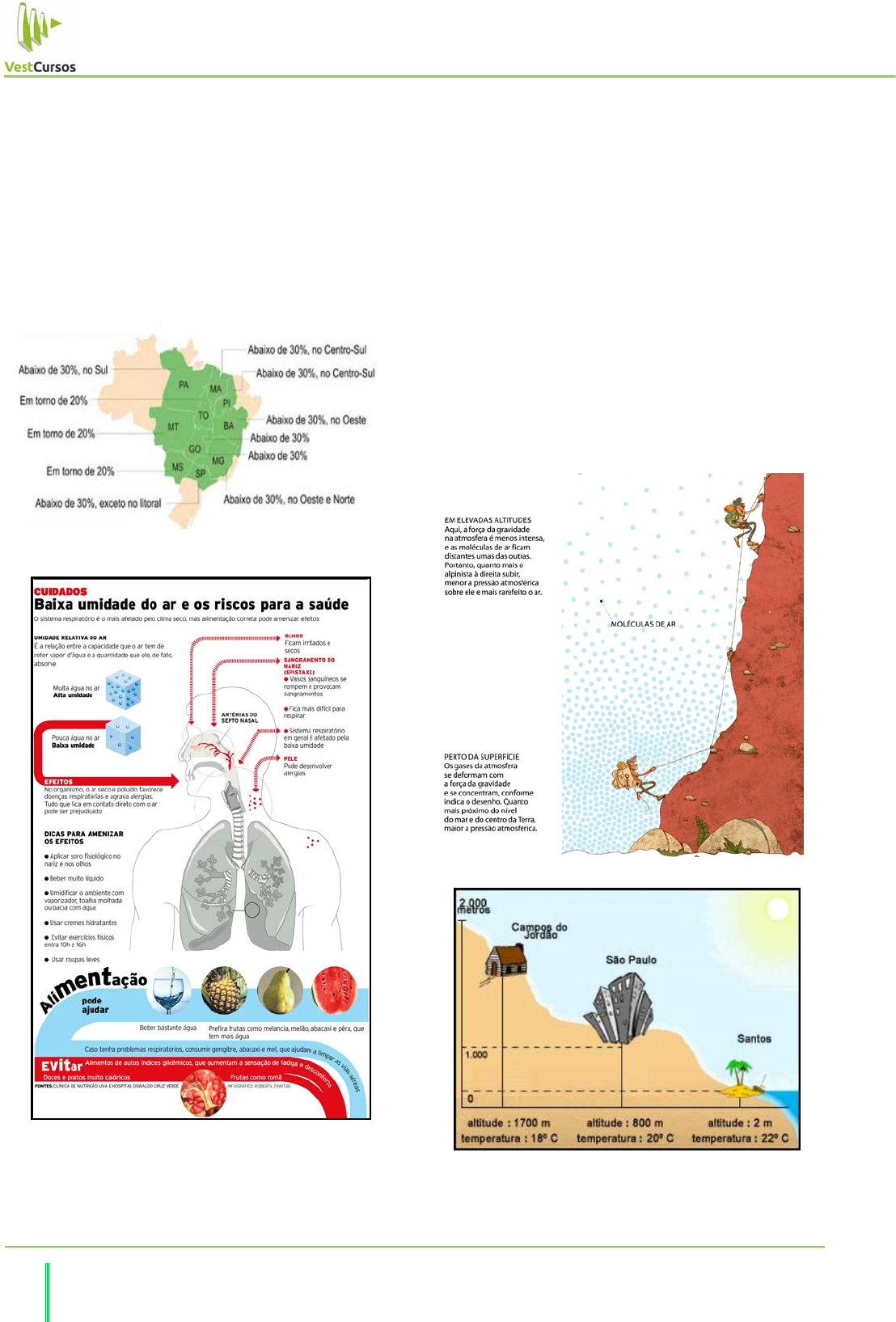 Aula 25 – Clima I 215 VestCursos – Especialista em Preparação para Vestibulares de Alta Concorrência presente em uma quantidade específica de ar. A umidade absoluta é o quociente do peso da água contida no ar e o volume desse ar úmido, ou seja, é a relação entre o peso da água dissolvida no ar (medido em gramas) e o peso do ar seco (medido em kg (m³)). A atmosfera apresenta um ponto de saturação, também chamado de ponto de orvalho, que é atingido quando recebe a quantidade máxima de vapor de água que pode suportar. A relação entre a umidade absoluta do ar e seu ponto de saturação é a umidade relativa, que é expressa em porcentagem. Quando a umidade relativa alcança 100%, a atmosfera é considerada saturada, ocorrendo a precipitação. UMIDADE NO BRASIL EM PERÍODOS SECOS Fonte: www.novaimprensa.inf.br PRESSÃO ATMOSFÉRICA A pressão atmosférica corresponde ao peso que uma coluna de ar exerce sobre a superfície terrestre. Ela é medida por barômetros e cartografada através das isóbaras – linhas que interligam os pontos de igual valor de pressão ao nível do mar. Como os demais elementos do clima, a pressão varia em função dos diversos fatores climáticos, entre os quais podemos destacar a temperatura e a altitude. A altitude é responsável pela variação do tamanho da coluna de ar: quanto maior a altitude em relação ao nível do mar, menor a coluna de ar, reduzindo a pressão atmosférica. Já a temperatura é responsável pela quantidade de moléculas de gás existente numa unidade de volume e, portanto, pela quantidade de massa. Com o aumento da temperatura, aumenta o grau de agitação das moléculas, que, por isso, ocupam mais espaço. Assim, quanto maior a temperatura, menor o número de moléculas por unidade de volume e, portanto, menor peso e menor pressão atmosférica. A pressão atmosférica é a força que o ar exerce sobre uma superfície. Quanto maior a altitude, menor a coluna e maior a rarefação do ar, o que diminui a pressão. Sabe-se, ainda, que o ar quente é leve. Esse fenômeno é explicado pela expansão dos gases, ou seja, quanto maior a temperatura, menor o número de moléculas e, portanto, menor o peso de cada metro cúbico de ar. Em contrapartida, quanto menor a temperatura, maior o número de moléculas por metro cúbico de ar; tem-se, então, maiores peso e pressão. 216 VestCursos – Especialista em Preparação para Vestibulares de Alta Concorrência CURSO ANUAL DE GEOGRAFIA – (Prof. Italo Trigueiro) EXERCÍCIOS DE APRENDIZAGEM Questão 01 LUCCI, Elian A; BRANCO, Anselmo L; MENDONÇA, Cláudio - Geografia Geral do Brasil, Cap. 14 . Espaço e Sociedade, Editora Saraiva. A língua portuguesa possui palavras com mais de um significado. Assim, é incorreto afirmar que a palavra tempo no a) significado de hora, dia, semana, mês, ano, decênio, século e milênio; dependendo do fato ou acontecimento a que estamos nos referindo, utiliza-se, por exemplo: Quanto tempo falta para chegar ao domingo? b) sentido atmosférico, seja o conjunto de variações ou os sucessivos estados do ar, registrados em um determinado lugar, depois de um longo período de observações. c) sentido de idade, que pode ser compreendido no tempo do ser humano, ou da história do ser humano, é o período desde o momento em que ele surgiu até os dias atuais. d) sentido das condições meteorológicas, seja um conjunto de valores que caracteriza o estado da atmosfera em um momento e em um certo lugar. e) sentido da natureza seja o tempo geológico, que é medido em milhões e bilhões de anos, e abrange um período de tempo muito mais longo do que o tempo do ser humano. Questão 02 Clima é a sucessão habitual dos estados do tempo meteorológico. A grande variação climática no planeta é resultante da interação dos fatores climáticos, que são os responsáveis pela grande heterogeneidade climática da Terra e estão diretamente relacionados com a geografia de cada porção da superfície terrestre. Em qual das alternativas a seguir há APENAS fatores climáticos, isto é, aqueles que contribuem para determinar as condições climáticas de uma região do globo? a) Correntes marítimas, temperatura do ar, umidade relativa do ar e grau geotérmico. b) Temperatura do ar, pressão altitude, hidrografia e massas de ar. c) Umidade do Ar, Hidrografia, correntes marítimas, latitude e relevo. d) Altitude, maritimidade e latitude. e) Temperatura do ar, umidade relativa do ar, insolação e grau geotérmico. Questão 03 A maior parte dos fenômenos meteorológicos, como as chuvas, os ventos e os deslocamentos de massas de ar, ocorre na: a) Estratosfera c) Mesosfera b) Troposfera d) Termosfera Questão 04 Existem diferenças entre clima e tempo. O clima é o conjunto de condições meteorológicas de uma região em determinado período. Já o tempo é a combinação passageira dos elementos do clima. Leia as descrições climáticas abaixo e assinale “T” para TEMPO e “C” para CLIMA. ( ) A frente fria se afasta, mas parte de sua instabilidade ainda permanece sobre o centro-leste do Paraná. Nuvens carregadas provocam chuva desde cedo nestas regiões. Os demais setores paranaenses terão um dia de sol entre muitas nuvens com pancadas de chuva, principalmente à tarde. ( ) Nublado, alguns períodos de melhoria e chuva a qualquer hora do dia. ( ) Temperado, com verão ameno, chuvas uniformemente distribuídas, sem estação seca e a temperatura média do mês mais quente não chega a 22ºC. Precipitação de 1.100 a 2.000 mm. Geadas severas e frequentes, num período médio de ocorrência de dez a 25 dias anualmente. ( ) Com sol forte e poucas nuvens. O ar seco que predomina no Estado ainda desfavorece a formação de áreas de instabilidade. Faz calor à tarde. Anotações Aula 25 – Clima I 217 VestCursos – Especialista em Preparação para Vestibulares de Alta Concorrência ( ) Está inserida na região de clima temperado de categoria su