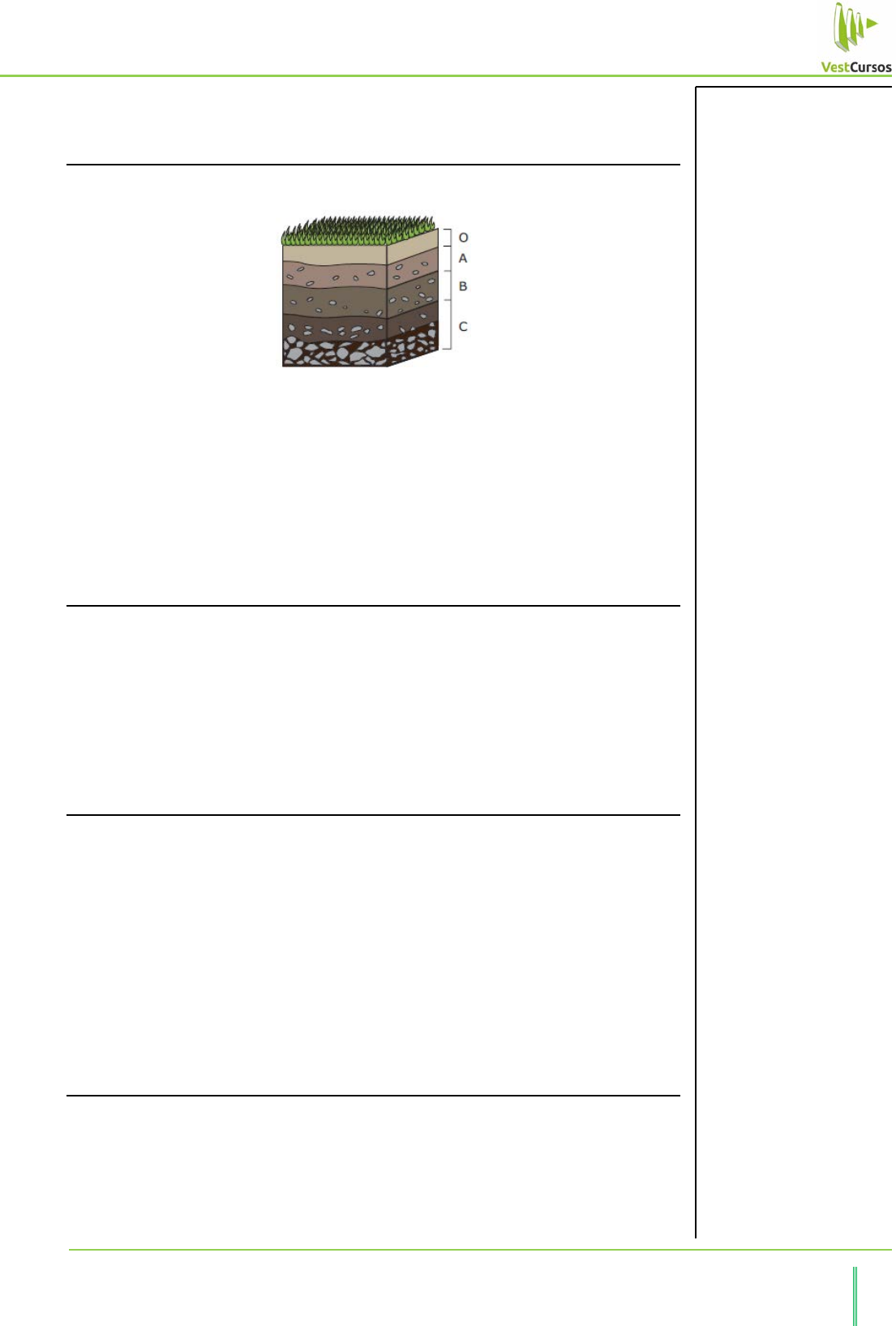 300 VestCursos – Especialista em Preparação para Vestibulares de Alta Concorrência CURSO ANUAL DE GEOGRAFIA – (Prof. Italo Trigueiro) d) do cerrado, da caatinga e amazônico. e) cerrado, amazônico e da caatinga. Questão 04 Considere as informações apresentadas a seguir. Os solos são constituídos por uma película delgada de material terroso que recobre as terras emersas, e esses são capazes de sustentar as plantas. MAGNOLI, D.; ARAÚJO, R. Projeto de ensino de Geografia. São Paulo: Moderna, 2000, p. 60. Analise o perfil do solo apresentado na figura anterior e assinale a alternativa INCORRETA. a) O horizonte B é constituído basicamente por material inorgânico, embora receba material orgânico pela infiltração da água. b) O horizonte A é caracterizado pela mistura de material inorgânico e orgânico, é bastante poroso, retém água e perde minerais para o estrato profundo. c) O horizonte O é formado basicamente por material inorgânico, de coloração escura e só existe em áreas cobertas por vegetação. d) O horizonte C é caracterizado pela presença de blocos de rocha pouco impermeabilizada e pela escassez de material orgânico. Questão 05 Assinale a alternativa que preenche CORRETAMENTE as lacunas do texto a seguir, na ordem em que aparecem. Nas áreas de declividade acentuada, os solos são mais ____________ porque a ___________ velocidade de escoamento das águas ____________ a infiltração; assim, a água fica pouco tempo em contato com as rochas, ____________ a intensidade do intemperismo. a) profundos – alta – aumenta – diminuindo b) rasos – alta – aumenta – aumentando c) profundos – baixa – diminui – diminuindo d) rasos – alta – diminui – diminuindo e) profundos – baixa – aumenta – aumentando Questão 06 Leia o texto. Segundo dados das Nações Unidas, este fenômeno é responsável por impedir o aproveitamento de solos correspondentes a 6 milhões de hectares (60 000 km2) por ano devido ao sobrepastoreio, salinização dos solos por irrigação e processos de uso intensivo e sem manejo adequado na agricultura. MORAES, Paulo Roberto. Geografia Geral e do Brasil. São Paulo: Harbra, 2005. (Adaptação) O texto trata de um dos principais problemas ambientais do mundo contemporâneo: a) A redução da biodiversidade. b) A lixiviação. c) A desertificação. d) A poluição dos rios. e) O fenômeno El Niño. Questão 07 Por muito tempo, os solos tropicais foram considerados pobres e pouco produtivos. No Brasil, os solos gerados em climas quentes e úmidos apresentam grandes diferenças de comportamento ecológico e agrário-econômico, podendo-se afirmar que a) em termos de atividades agrícolas comprovadas os melhores solos brasileiros encontram-se na Amazônia. b) os melhores solos produtivos do Brasil são os silicosos dos planaltos interiores. c) os solos oriundos da decomposição de basaltos e diabásios são os mais ricos do país. Anotações Aula 31 – Pedogênese - Modelado Antrópico 301 VestCursos – Especialista em Preparação para Vestibulares de Alta Concorrência d) solos oriundos das areias de restingas têm grande fertilidade natural. e) os solos agricolamente ricos no Brasil estão localizados apenas nas regiões subtropicais. Questão 08 Solo é a camada superior da superfície terrestre, onde se fixam as plantas, que dependem de seu suporte físico, água e nutrientes. Um perfil de solo é representado na figura abaixo. Sobre o perfil apresentado é correto afirmar que: a) O horizonte (ou camada) O corresponde ao acúmulo de material orgânico que é gradualmente decomposto e incorporado aos horizontes inferiores, acumulando-se nos horizontes B e C. b) O horizonte A apresenta muitos minerais não alterados da rocha que deu origem ao solo, sendo normalmente o horizonte menos fértil do perfil. c) O horizonte C corresponde à transição entre solo e rocha, apresentando, normalmente, em seu interior, fragmentos da rocha não alterada. d) O horizonte B apresenta baixo desenvolvimento do solo, sendo um dos primeiros horizontes a se formar e o horizonte com a menor fertilidade em relação aos outros horizontes. Anotações 302 VestCursos – Especialista em Preparação para Vestibulares de Alta Concorrência CURSO ANUAL DE GEOGRAFIA – (Prof. Italo Trigueiro) EXERCÍCIOS DE FIXAÇÃO Questão 01 Causado pela água das chuvas, tem abrangência em quase toda a superfície terrestre, em especial nas áreas com clima tropical, cujos totais pluviométricos são bem mais elevados do que em outras regiões do planeta. O processo tende a se acelerar à medida que mais terras são desmatadas [...] uma vez que os solos ficam desprotegidos da cobertura vegetal e, consequentemente, as chuvas incidem direto sobre a superfície do terrenos. GUERRA, A. J. T. Geomorfologia urbana. Rio de Janeiro: Bertrand Brasil, 2011. O texto descreve um processo que pode ser acelerado com: a) a manutenção da vegetação. b) a construção de curvas de nível. c) o planejamento urbano e ambiental. d) o aumento da matéria orgânica do solo. e) a construção nas encostas de morros. Questão 02 Analise os dois perfis de solo a seguir. (ADAS, Melhem e ADAS, Sergio. Panorama Geográfico do Brasil. São Paulo: Moderna. 2004.) Identifique qual das assertivas traz informações corretas sobre os perfis de solo. a) O perfil II é típico do semiárido nordestino. Devido à escassez de chuvas, a ação do intemperismo físico é limitada, o que faz com que o intemperismo químico seja o principal agente de formação do solo. b) O perfil I é típico do semiárido nordestino. Devido à escassez de chuvas, a ação do intemperismo químico é limitada, o que faz com que o intemperismo físico seja o principal agente de formação do solo. Em consequência, o horizonte A é pouco profundo e se apoia diretamente sobre a rocha-mãe. c) O perfil I é típico das terras baixas amazônicas. Devido a abundância de chuvas, a ação do intemperismo 