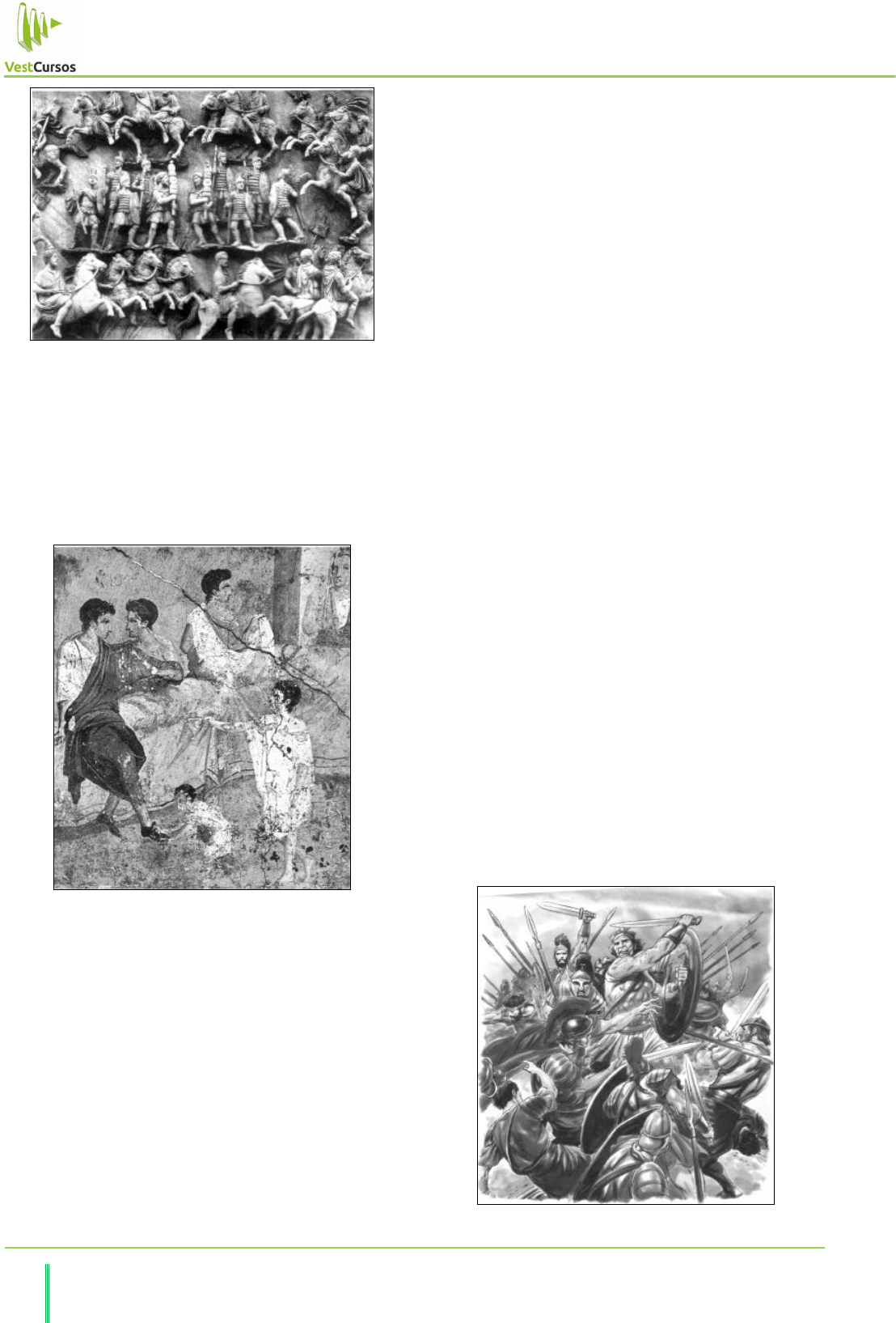 Aula 5 – Civilização Romana 51 VestCursos – Especialista em Preparação para Vestibulares de Alta Concorrência Neste relevo, que se encontra no Museu do Vaticano, vemos um regimento militar romano. A disciplina, as armas e os equipamentos fizeram das legiões romanas um exército quase invencível. ESCRAVISMO Com as guerras de conquista, milhares de vencidos foram escravizados e enviados para a Itália. Os ricos tinham dezenas e, às vezes, centenas de escravizados a seu serviço. Os escravizados, em Roma, eram de diversas origens: gregos, macedônios, asiáticos etc. Nesta pintura mural, encontrada na cidade de Pompéia, vemos escravos domésticos a serviço da aristocracia romana, durante um banquete. Os escravos eram empregados em minas e pedreiras, no trabalho agrícola e pastoril e em serviços domésticos, como cozinheiros, médicos, músicos, dançarinos, camareiros e professores dos filhos dos ricos. No entanto, no período republicano, a agricultura foi a atividade que mais absorveu mão de obra escrava. A concentração de terras pelos aristocratas e o aumento de escravos, proporcionado pelas guerras, originaram grandes propriedades escravistas que produziam vinho e azeite de oliva, produtos que alcançavam bons preços no mercado. A pequena propriedade camponesa não desapareceu completamente, mas não conseguia competir com a grande propriedade escravista, pois era necessário muito investimento. As pequenas propriedades produziam então apenas produtos de subsistência para mercados locais. Já o vinho e o azeite produzidos nas grandes propriedades escravistas eram vendidos para outras províncias romanas. A grande propriedade escravista possuía uma residência para quando seu proprietário a visitasse. Na sua ausência era um capataz, um escravo, quem cuidava da propriedade e controlava os outros escravos. Apesar de predominar o trabalho escravista, em determinadas épocas, como a da colheita, era usado o trabalho de camponeses livres. Se, por um lado, livres e escravos podiam trabalhar juntos, por outro, também entre os escravos havia diferenças. O escravo que era capataz tinha mais privilégios do que os escravos que comandava. Ele podia se casar e ter uma casa própria, por exemplo. Alguns podiam transportar dinheiro, viajar e negociar para o seu senhor. Mas, como toda pessoa nesta condição, podiam ser vendidos como escravo, a qualquer momento. Podiam também ser torturados até a morte, castigados com surras de varas, queimados com ferro em brasa, presos em jaulas e, se a falta fosse considerada muito grave, crucificados. No entanto, a escravidão romana não se baseava apenas na violência. Os senhores e escravos buscavam alternativas de controle que diminuíssem as possibilidades de revoltas. Por exemplo, um escravo que servisse bem o seu senhor podia ganhar a liberdade como recompensa. ESPÁRTACO: A RESISTÊNCIA À ESCRAVIDÃO No período inicial da expansão romana pelo Mediterrâneo, ocorreram revoltas de escravos na ilha da Sicília. Os escravos revoltados trabalhavam em grandes propriedades como agricultores e pastores, sofrendo maus tratos. Porém, a maior rebelião de escravos foi liderada pelo escravo Espártaco. Espártaco foi capturado no norte da Grécia e trazido para a Itália. Por ser forte e corajoso, foi escolhido por seu dono para ser um gladiador. Segundo as descrições, ele era loiro, musculoso e coberto de cicatrizes, que ganhara nas lutas de que fora obrigado a participar. Em 73 a.C., ele fugiu acompanhado de 74 gladiadores. Com eles iniciou um exército que recebeu a adesão de milhares de escravos e homens livres pobres, e chegou a reunir cerca de 100 mil combatentes. À frente desse exército de ex escravos, Espártaco venceu algumas legiões romanas por diversas vezes e dominou boa parte do sul da Itália. Em 71 a.C., os exército romanos se uniram contra os rebeldes e, finalmente, conseguiram vencê-los. O romano Crasso massacrou mais de 6 mil seguidores de Espártaco, sendo que muitos deles foram crucificados e expostos em vários trechos da via Ápia. Espártaco(ao centro) liderou um exército rebelde que contou com quase mil ex escravos. 52 VestCursos – Especialista em Preparação para Vestibulares de Alta Concorrência CURSO ANUAL DE HISTÓRIA GERAL – Prof. Monteiro Jr. Esse problema social agravou-se de tal modo que, a partir do final do século II a.C., alguns políticos tentaram realizar reformas para a distribuição de terras entre os pobres. Os tribunos da plebe Tibério Graco, em 133 a.C., e seu irmão Caio, em 123 a.C., propuseram uma reforma agrária, mas enfrentaram uma forte oposição do Senado, composto em sua maioria por grandes proprietários, e, com isso, acabaram assassinados. A LUTA PELA TERRA Durante as conquistas militares romanas, grandes extensões dos territórios conquistados tornaram-se terra pública. Mas, como vimos, a aristocracia acabou tomando para si essas terras e montando propriedades escravistas de médio e grande porte. Nesse processo, os camponeses saíram prejudicados. Como cidadãos, eles eram obrigados a servir ao exército, abandonando suas terras. Ao retornarem, encontravam-nas devastadas ou incorporadas ilegalmente às terras dos grandes proprietários. Além disso, com a utilização de mão de obra escrava, parte do campesinato ficou sem ocupação e, sem outra opção, teve de mudar-se para as cidades. Júlio César durante a conquista da Britânia, no século I a.C. Além do problema da terra, outro sinal da crise da República provinha do exército. Muitos camponeses empobrecidos alistavam- se como soldados permanentes. Tal alistamento tornou-se possível a partir de 107 a.C., quando o cônsul Mário promoveu uma reforma militar instituindo o pagamento de salário aos soldados. Além disso, os soldados recebiam parte dos saques de guerra e terras como recompensa. A consequência política dessa reforma foi que os soldados ficaram ligados principalmente por laços de lealdad
