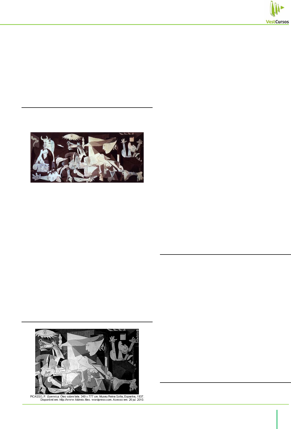 34 VestCursos – Especialista em Preparação para Vestibulares de Alta Concorrência CURSO ANUAL DE LITERATURA – (Prof. Steller de Paula) O comentário de Pablo Picasso, em relação à sua obra Guernica, refere-se a) à separação entre manifestações artísticas e realidade histórica. b) ao bombardeio alemão da cidade basca em apoio ao general Franco. c) aos massacres cometidos pelos nazistas durante a Segunda Guerra Mundial. d) à denúncia da anexação do território espanhol pelas tropas nazistas. e) à aliança dos nazistas com os comunistas no início da Segunda Guerra Mundial. Questão 06 A obra “Guernica” de Pablo Picasso retrata, em linguagem cubista, os horrores da guerra por ocasião no bombardeio alemão (nazista) à cidade natal do artista em apoio ao general Francisco Franco na fase final da Guerra Civil Espanhola (1936-1938). A obra-prima de Picasso, Guernica, é considerada por muitos a maior pintura do século XX. Pintada no contexto da ascensão das ditaduras nazistas e fascistas e do período imediatamente anterior à Segunda Guerra mundial, a obra é ainda hoje é impactante e nos lembra a capacidade destrutiva do homem. Seu caráter vanguardístico pode ser observado: a) graças à imponência com que trata o tema histórico, num grande painel monocromático que retrata realisticamente os horrores da guerra. b) pelo uso de formas irregulares e fragmentadas e rostos distorcidos com grande efeito, criando uma atmosfera de pânico e terror, numa confusão de planos narrativos. c) pela geometrização das formas, explorando com perfeição a noção de profundidade ao dar forma exata e volume aos seres e objetos representados tridimensionalmente. d) pelo aspecto monocromático e pela bidimensionalidade, criando uma pintura não figurativa que abre mão de linhas e contornos na composição dos planos. e) pela forma como une o clássico e o moderno, ao retratar a realidade de forma fragmentada, mas respeitando os princípios de equilíbrio e harmonia na composição. Questão 07 (Enem 2011) O pintor espanhol Pablo Picasso (1881-1973), um dos mais valorizados no mundo artístico, tanto em termos financeiros quanto históricos, criou a obra Guernica em protesto ao ataque aéreo à pequena cidade basca de mesmo nome. A obra, feita para integrar o Salão Internacional de Artes Plásticas de Paris, percorreu toda a Europa, chegando aos EUA e instalando-se no MoMA, de onde sairia apenas em 1981. Essa obra cubista apresenta elementos plásticos identificados pelo a) painel ideográfico, monocromático, que enfoca várias dimensões de um evento, renunciando à realidade, colocando-se em plano frontal ao espectador. b) horror da guerra de forma fotográfica, com o uso da perspectiva clássica, envolvendo o espectador nesse exemplo brutal de crueldade do ser humano. c) uso das formas geométricas no mesmo plano, sem emoção e expressão, despreocupado com o volume, a perspectiva e a sensação escultórica. d) esfacelamento dos objetos abordados na mesma narrativa, minimizando a dor humana a serviço da objetividade, observada pelo uso do claro-escuro. e) uso de vários ícones que representam personagens fragmentados bidimensionalmente, de forma fotográfica livre de sentimentalismo. Texto De um modo geral, todos esses movimentos da vanguarda europeia de fins do século XIX e início do século XX estavam sob o signo da desorganização do universo artístico de sua época. A diferença é que uns, como o futurismo e o dadaísmo, queriam a destruição do passado e a negação total dos valores estéticos presentes; e outros, como o expressionismo e o cubismo, viam na destruição a possibilidade de construção de uma nova ordem superior. No fundo eram, portanto, tendências também organizadoras de uma nova estrutura política e social. (TELES, Gilberto Mendonça, Vanguarda europeia e modernismo brasileiro. Rio de Janeiro: Vozes, 1972, p. 10) Questão 08 (Puccamp 2016) Alguns artistas reconhecidos e certos movimentos de vanguarda, do início do século XX, aproximaram-se publicamente de partidos e ideologias políticas. Essa proximidade pode ser verificada entre alguns a) dadaístas e anarquistas, a exemplo da atuação política de Tristán Tzara, que propôs a criação de um partido e uma internacional anarquista durante o entreguerras. b) futuristas e fascistas, a exemplo de Filippo Marinetti, que lutou ao lado do exército italiano na II Guerra e militou no Partido Nacional Fascista. c) integralistas e nazistas, a exemplo do apoio dos modernistas brasileiros Plínio Salgado e Cassiano Ricardo ao Eixo, durante o Estado Novo. d) surrealistas e comunistas ortodoxos, a exemplo do “Manifesto por uma Arte Revolucionária Independente”, redigido por André Breton e León Trotski, na URSS. e) expressionistas e republicanos, caso de Francisco de Goya, que lutou contra os franquistas e pintou os horrores da Guerra Civil Espanhola. Questão 09 (FGV-RJ 2016) A cidade do Rio de Janeiro recebeu a exposição “Picasso e a Modernidade” em 2015, para comemorar os 40 anos do fim do regime franquista. Em uma das salas, um vídeo apresentava o Aula 23 – Impressionismo e Vanguardas I 35 VestCursos – Especialista em Preparação para Vestibulares de Alta Concorrência processo de criação do quadro Guernica, reproduzido a seguir. Com relação ao quadro Guernica, assinale V para a afirmação verdadeira e F para a falsa. ( ) O touro, figura representativa da cultura espanhola, simboliza o terror e a violência das forças que apoiavam o ditador Francisco Franco, responsáveis pelo bombardeio da cidade de Guernica, no País Basco. ( ) A iconografia da figura feminina, com uma criança nos braços, que urra em direção ao alto, remete à dor das mães que perdem seus filhos na guerra. ( ) A composição das figuras em formas geométricas produz uma imagem realista que, em perspectiva, busca uma semelhança com a natureza. As afirmações são, respectivamente, a) F - 