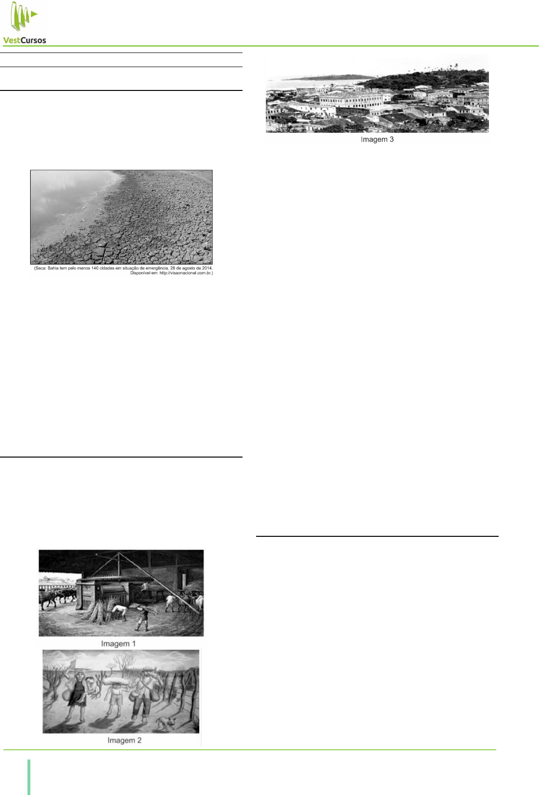 Aula 28 – Prosa de 30 99 VestCursos – Especialista em Preparação para Vestibulares de Alta Concorrência EXERCÍCIOS DE FIXAÇÃO Questão 01 (Uern 2015) Considere o texto e a imagem a seguir. O decênio de 1930 teve como característica própria um grande surto do romance, tão brilhante quanto o que se verificou entre 1880 e 1910, e que apenas em pequena parte dependeu da estética modernista. (Antônio Candido e J. Aderaldo Castello. Presença da Literatura Brasileira: Modernismo. São Paulo / Rio de Janeiro: Difel, 1979.) O comentário do especialista associado à imagem apresenta e representa características importantes da prosa modernista da geração de 1930. Em relação à produção literária identificada, assinale a alternativa correta. a) A preocupação com a documentação da realidade presente no Pré-Modernismo é retomada. b) Utiliza-se uma linguagem rebuscada objetivando demonstrar a importância do tema abordado. c) O regionalismo é explorado de forma preconceituosa, demonstrando com exagero a situação difícil das regiões retratadas. d) O desejo por um país melhor, isento de desigualdades sociais, faz com que os romancistas de 1930 descrevam cenários e personagens idealizados. Questão 02 (Upe-ssa 3 2016) A literatura de 1930 é demarcada por uma temática social, em que o urbano e o rural se intercruzam, haja vista os romances de José Lins do Rego, Graciliano Ramos e Jorge Amado. Os dois primeiros autores dão prioridade às histórias que transcorrem em espaço rural; a mesma coisa já não se pode afirmar em relação à obra de Jorge Amado, pois grande parte dela tem como ambiente a cidade da Bahia, atual Salvador. Com base no exposto, observe as imagens a seguir: Analise as seguintes afirmativas: I. As três imagens referem-se, de modo simultâneo, às obras dos romancistas de trinta, José Lins do Rego, Graciliano Ramos e Jorge Amado, pois a produção artística desses autores relata acontecimentos que ocorrem nos três espaços representados nas imagens expostas. II. Dos três autores mencionados, dois deles têm textos memorialistas, Graciliano Ramos, por relatar as memórias dos anos que passou na prisão, e Jorge Amado, quando narra a história dos amores de Gabriela com Nacib e de Dona Flor com os seus dois maridos. III. Há antagonismo entre as imagens 1, 2 e 3, respectivamente, com os romances de José Lins do Rego, Graciliano Ramos e Jorge Amado os quais, pelo fato de fazerem parte da geração denominada regionalista, mimetizam, de modo crítico, aspectos da realidade que têm por cenários o campo e a cidade. IV. A imagem 2 representa o espaço onde transcorrem os acontecimentos relatados nos romances do ciclo do açúcar, de José Lins do Rego, enquanto a 3 relaciona-se com o cenário da seca, tema central de Vidas Secas. Trata-se de uma narrativa de Graciliano Ramos, na qual o animal e o homem se equivalem, pois, enquanto Fabiano se considera “bicho”, Baleia nutre sentimentos humanos. V. Dos três autores, o único que apresenta, na maioria de seus romances, um cenário urbano tal qual se encontra representado na imagem 3 é Jorge Amado, cuja crítica social se volta para acontecimentos na cidade da Bahia, atual Salvador. Está(ão) CORRETA(S) apenas a) I, II e III. b) I e II. c) IV. d) I e V. e) I, III e IV. Questão 03 (Unisc 2016) Leia atentamente o trecho do romance O Quinze, de Rachel de Queiroz, e, depois, analise as afirmativas a seguir. “Novamente a cavalo no pedrês, Vicente marchava através da estrada vermelha e pedregosa, orlada pela galharia negra da caatinga morta. Os cascos do animal pareciam tirar fogo nos seixos do caminho. Lagartixas davam carreirinhas intermitentes por cima das folhas secas no chão que estalavam como papel queimado. O céu, transparente que doía, vibrava, tremendo feito uma gaze repuxada. Vicente sentia por toda parte uma impressão ressequida de calor e aspereza. Verde, na monotonia cinzenta da paisagem, só algum juazeiro ainda escapo à devastação da rama; mas em geral as pobres árvores apareciam lamentáveis, mostrando os cotos dos galhos como membros amputados e a casca toda raspada em grandes zonas brancas. E o chão, que em outro tempo a sombra cobria, era uma confusão 100 VestCursos – Especialista em Preparação para Vestibulares de Alta Concorrência CURSO ANUAL DE LITERATURA – (Prof. Steller de Paula) desolada de galhos secos, cuja agressividade ainda mais se acentuava pelos espinhos. (...) Quando Vicente se despediu, e montou ligeiro no cavalo que arrancou de galope, Conceição estirou-se na rede e ficou olhando o vulto branco que a poeira ruiva envolvia, até o ver se sumir atrás de um grupo de umarizeiras da várzea. Todo o dia a cavalo, trabalhando, alegre e dedicado, Vicente sempre fora assim, amigo do mato, do sertão, de tudo o que era inculto e rude. Sempre o conhecera querendo ser vaqueiro como um caboclo desambicioso, apesar do desgosto que com isso sentia a gente dele. E a moça lembrou-se de certa vez, em casa do Major, no dia em que se inaugurou o gramofone, e as meninas, e ela própria, que também estava lá, puseram-se a dançar. Os pares eram o filho mais velho da casa – hoje casado e promotor no Cariri – e dois outros rapazes, colegas dele, que tinham vindo passar as férias no sertão.” QUEIROZ, Rachel de. O Quinze. São Paulo: Siciliano, 1993, p. 13-17. I. O trecho apresenta um narrador em primeira pessoa. II. Os personagens não apresentam um grande aprofundamento psicológico. III. Nos parágrafos citados, observa-se uma identificação entre o espaço e o personagem masculino. Assinale a alternativa correta. a) Somente as afirmativas I e II estão corretas. b) Somente as afirmativas II e III estão corretas. c) Somente as afirmativas I e III estão corretas. d) Nenhuma afirmativa está correta. e) Todas as afirmativas estão corretas. TEXTO Na América Latina do século XX, em incontáveis momentos, a criação artística articulou-se com uto