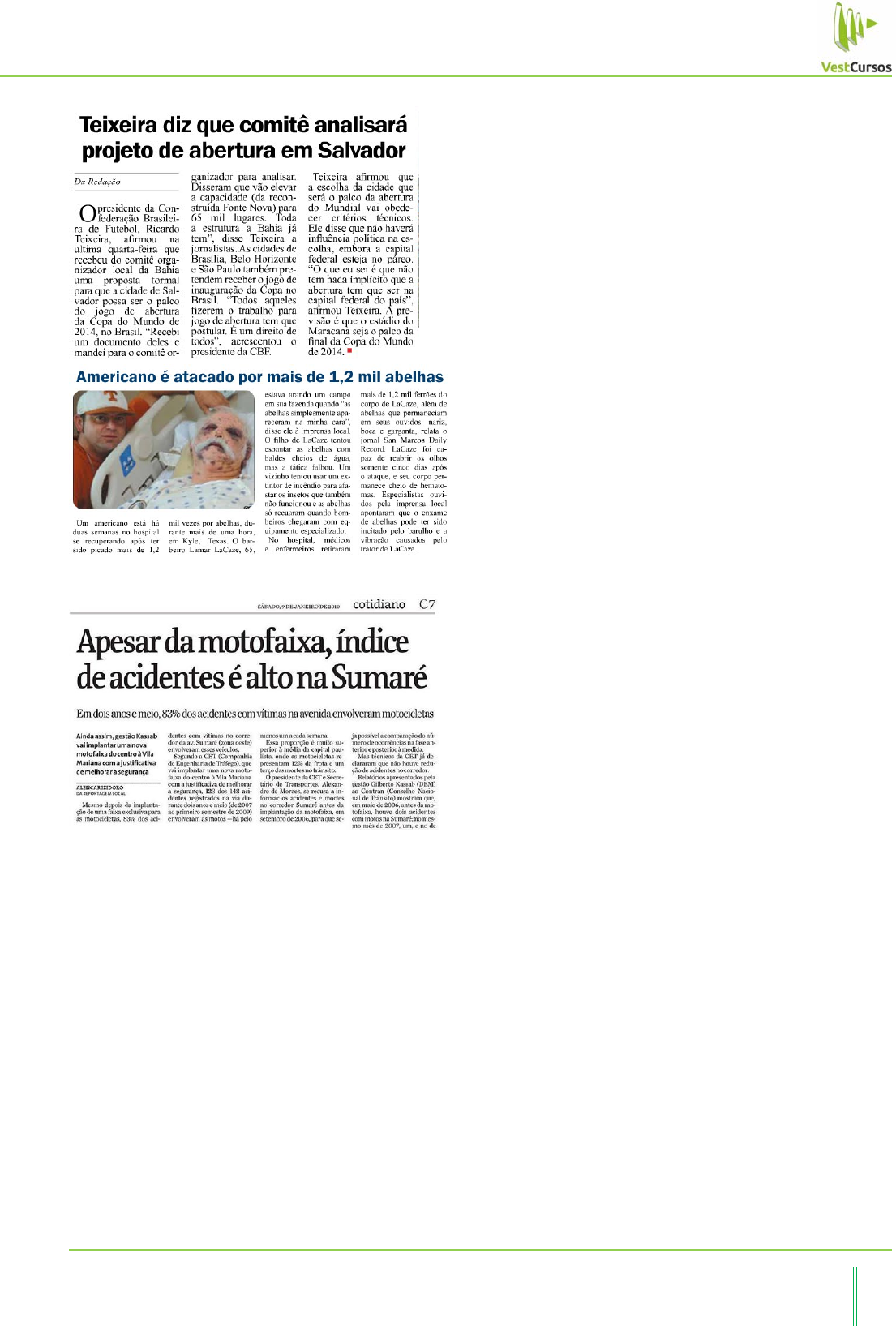 124 VestCursos – Especialista em Preparação para Vestibulares de Alta Concorrência CURSO ANUAL GRAMÁTICA E INTERPRETAÇÃO – (Prof. Cláudio Neves) Exemplos de notícia. Exemplo de reportagem. SEMANA 11 – Orações Adverbiais 125 VestCursos – Especialista em Preparação para Vestibulares de Alta Concorrência EXERCÍCIOS DE APRENDIZAGEM Questão 01 Tendo em vista que os gêneros apresentam determinadas características, identifique os gêneros apresentados a seguir: I. Texto jornalístico que tem como função a exposição de informações. Esse texto pode ser descritivo e narrativo ao mesmo tempo, apresentando, portanto, tempo, espaço e as “personagens” envolvidas. II. É um texto jornalístico que informa e, ao mesmo tempo, cria uma opinião nos leitores, o que configura uma função social muito importante. III. É um texto jornalístico que tem como função a apresentação e defesa do ponto de vista do periódico em questão. IV. É um texto que tem como principal característica transmitir a opinião de pessoas de destaque sobre algum assunto de interesse público. As afirmações correspondem, respectivamente, a que gêneros textuais? a) Carta de leitor, carta argumentativa, editorial e notícia. b) Reportagem, notícia, editorial e entrevista. c) Notícia, reportagem, artigo de opinião e carta de leitor. d) Notícia, reportagem, editorial e entrevista. e) Reportagem, notícia, editorial e carta de leitor. Questão 02 Nós, brasileiros, estamos acostumados a ver juras de amor, feitas diante de Deus, serem quebradas por traição, interesses financeiros e sexuais. Casais se separam como inimigos, quando poderiam ser bons amigos, sem traumas. Bastante interessante a reportagem sobre separação. Mas acho que os advogados consultados, por sua competência, estão acostumados a tratar de grandes separações. Será que a maioria dos leitores da revista tem obras de arte que precisam ser fotografadas antes da separação? Não seria mais útil dar conselhos mais básicos? Não seria interessante mostrar que a separação amigável não interfere no modo de partilha dos bens? Que, seja qual for o tipo de separação, ela não vai prejudicar o direito à pensão dos filhos? Que acordo amigável deve ser assinado com atenção, pois é bastante complicado mudar suas cláusulas? Acho que essas são dicas que podem interessar ao leitor médio. Disponível em: http://revistaepoca.globo.com. Acesso em: 26 fev. 2012 (adaptado). O texto foi publicado em uma revista de grande circulação na seção de carta do leitor. Nele, um dos leitores manifesta-se acerca de uma reportagem publicada na edição anterior. Ao fazer sua argumentação, o autor do texto a) faz uma síntese do que foi abordado na reportagem. b) discute problemas conjugais que conduzem à separação. c) aborda a importância dos advogados em processos de separação. d) oferece dicas para orientar as pessoas em processos de separação. e) rebate o enfoque dado ao tema pela reportagem, lançando novas ideias. Questão 03 (UFPR - 2010) Considere as seguintes características: 1. Texto expressionista de subjetividade exacerbada. 2. Predominância da forma narrativa e humanização do relato. 3. Texto de natureza impressionista e objetividade dos fatos narrados. 4. Predominância da forma descritiva e desumanização do relato. 5. Texto literário e alta subjetividade. São estabelecidas para o gênero reportagem as características: a) 1 e 3 apenas. b) 2 e 3 apenas. c) 2, 3 e 4 apenas. d) 3, 4 e 5 apenas. e) 1 e 2 apenas. Questão 04 São características do gênero reportagem: a) Comunicação utilizada entre pessoas que mantêm algum tipo de relação íntima, cuja linguagem é predominantemente coloquial. b) Seu principal objetivo é transmitir a opinião de pessoas de destaque sobre algum assunto de interesse. c) Texto jornalístico divulgado nos meios de comunicação de massa, informa fatos de interesse público, cuja linguagem deve ser objetiva e clara. Anotações 126 VestCursos – Especialista em Preparação para Vestibulares de Alta Concorrência CURSO ANUAL GRAMÁTICA E INTERPRETAÇÃO – (Prof. Cláudio Neves) d) A linguagem é sua principal característica, pois há uma preocupação com a seleção e a combinação vocabular. Sua linguagem é predominantemente subjetiva. Questão 05 A reportagem publicada no jornal “O Globo”, do dia 21 de abril de 2010, tem como assunto principal informar sobre os problemas que atingem os moradores do entorno de Brasília. Sobre ela, é possível afirmar que: I. Apresenta linguagem clara e objetiva, recurso predominante na linguagem jornalística. II. Apesar de contrariar o princípio da imparcialidade, é possível observar que há uma opinião pessoal do enunciador na reportagem. III. A imagem da campanha institucional do Governo do Distrito Federal, aliada aos seus recursos linguísticos, estabelece um paradoxo com a informação veiculada na reportagem. IV. O fragmento da reportagem corrobora com as informações veiculadas na campanha institucional do Governo do Distrito Federal. Estão corretas: a) I e IV. b) I, II e III. c) Apenas IV. d) I e II. Anotações SEMANA 11 – Orações Adverbiais 127 VestCursos – Especialista em Preparação para Vestibulares de Alta Concorrência EXERCÍCIOS DE FIXAÇÃO Questão 01 Texto 01 No ano de 1990, o filósofo francês Gilles Deleuze criou o conceito de “sociedade do controle” para explicar a configuração totalitária das sociedades atuais. Na sociedade de controle as pessoas têm a ilusão de desfrutarem de maior autonomia, pois podem, por exemplo, acessar contas correntes e fazer compras pela Internet. Mas, por outro lado, seus comportamentos e hábitos de consumo podem ser conhecidos pelo governo, pelos bancos e grandes empresas. Sem suspeitarem disso, os indivíduos podem ser controlados à distância, como se cada um fosse dotado de uma “coleira eletrônica”. Texto 02 Um quarto dos alemães ace