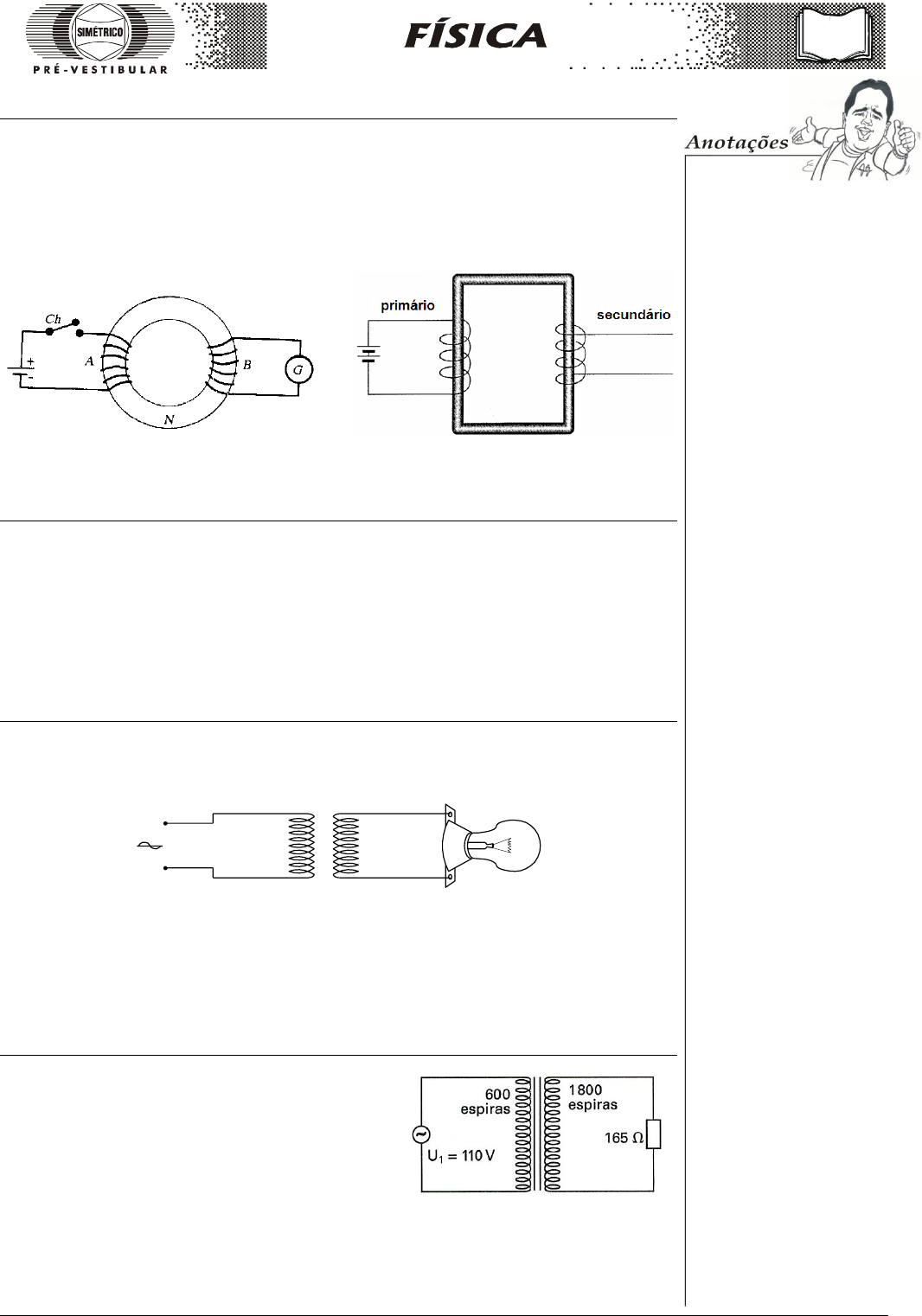 Simétrico Pré-Universitário – Há 23 anos ensinando com excelência os estudantes cearenses – www.simétrico.com.br 183 Questão 11 (ITA-SP) Na montagem da figura, A e B são enrolamentos de fios condutores, G é um galvanômetro e N um núcleo de ferro. Pode-se afirmar que: a) Mantendo a chave fechada, haverá uma corrente elétrica constante em G. b) Há corrente em G, enquanto Ch estiver fechada. c) Somente haverá corrente em G, quando Ch for aberta. d) Nunca haverá corrente em G. e) Há uma corrente transitória em G, quando a chave Ch é fechada. Questão 13 Questão 14 Questão 12 Ligando-se duas pilhas de 1,5 V ao primário de um pequeno transformador, conforme mostra a figura, não haverá voltagem induzida no secundário. Qual das afirmações seguintes justifica esse fato? a) O número de pilhas no primário não é suficiente. b) Uma corrente contínua não produz campo magnético no núcleo de ferro. c) O campo magnético criado na bobina primaria não atravessa o secundário. d) O número de espira da bobina secundaria não é suficiente. e) Existe fluxo magnético no secundário, mas ele não varia. Questão 13 Um estudante ligou os terminais A e B de uma bobina B1 a uma tomada do laboratório. Aproximando de B1 a bobina B2, ligada a uma lâmpada, ele verificou que a lâmpada acendeu. Das afirmações seguintes, qual está errada ? A B B 1 B 2 a) Em B1, existe uma corrente alternada. b) A corrente em B1 origina um campo magnético variável na região em torno dela. c) A bobina B2 é atravessada por um fluxo magnético variável. d) É induzida uma fem alternada na bobina B2. e) haverá uma corrente elétrica constante atravessando a lâmpada. Questão 14 Seja o transformador ideal mostrado na figura a seguir: Pede-se determinar: a) a tensão U2 induzida no secundário; b) a corrente i2 no secundário; c) a corrente i1 que circula na bobina primária. Simétrico Pré-Universitário – Há 23 anos ensinando com excelência os estudantes cearenses – www.simétrico.com.br 184 Questão 15 Para transmitir a energia elétrica das hidrelétricas até nossas residências, o transporte de energia é feito utilizando ____________________ para possibilitar o uso de transformadores para elevar ou diminuir a tensão elétrica convenientemente. Para minimizar as perdas de energia elétrica nos fios condutores das redes de transmissão por efeito joule, as companhias elétricas optam por transportar a energia elétrica usando __________ tensões elétricas e ___________ correntes elétricas. Qual sequência abaixo completa corretamente as lacunas acima ? a) tensão contínua, altas, baixas b) tensão contínua, baixas, altas c) tensão alternada, baixas, altas d) tensão alternada, altas, altas e) tensão alternada, altas, baixas Questão 16 Um condutor AB de resistência elétrica 0,50 pode deslizar livremente sobre um fio condutor ideal dobrado em U e imerso num campo magnético uniforme de indução B, perpendicular ao plano do circuito, conforme a figura. B tem intensidade 0,20 T. Um agente externo puxa AB com velocidade constante v, induzindo uma corrente elétrica de intensidade i = 2A. Determine: a) o sentido da corrente elétrica induzida; b) o módulo da velocidade v. c) a direção, sentido da força magnética Fmag que age na barra. V A B 0,2m B Questão 17 (UFPA) A figura mostra uma barra metálica que faz contato com um circuito aberto, fechando-o. A área do circuito é perpendicular a um campo magnético constante B = 0,15 T. A resistência total do circuito vale R = 3 . Qual é a intensidade da forca necessária para mover a barra, como indicado na figura, com uma velocidade constante igual a v = 2,0 m/s ? a) 5,5 . 101 N b) 2,50 . 102 N c) 3,75 . 103 N d) 2,25 . 103 N e) 5,50 . 104 N V 50 cm B R Questão 18 (OSEC – SP) Uma espira retangular de 4,0 cm x 7,0 cm está colocada perpendicularmente a um campo magnético de 0,6 Wb/m2 e, após 0,3 segundos, o plano da espira torna-se paralelo ao vetor campo magnético. A força eletromotriz média nesse intervalo de tempo é de: a) 5,6 mV b) 56 V c) 2,8 mV d) 28 V e) 46 V Simétrico Pré-Universitário – Há 23 anos ensinando com excelência os estudantes cearenses – www.simétrico.com.br 185 Pensando em Casa Pensando em Casa ATENÇÃO: É absolutamente necessário ler a teoria desse capítulo antes de resolver as questões referentes a ele. As questões que se seguem não são mera aplicação de fórmulas, requerem uma real compreensão dos aspectos teóricos do assunto. Se você não leu TODA A TEORIA relativa a esse capítulo, NÃO INICIE A TAREFA DE CASA AGORA. Questão 01 A Lei de Lenz determina o sentido da corrente induzida. Tal lei diz que a corrente induzida: a) surge em sentido tal, que tende a reforçar a causa que lhe deu origem. b) surge sempre num sentido que tende a anular a causa que lhe dá origem. c) aparece num sentido difícil de ser determinado. d) há duas alternativas certas. e) aparece sempre que alteramos a forma de uma bobina. Questão 02 (MACK-SP) O fenômeno da indução eletromagnética em uma bobina ocorre quando: a) passa pela bobina uma corrente contínua. b) ocorre variação do fluxo magnético no interior da bobina. c) existe um campo de indução magnético constante no interior da bobina. d) cargas positivas percorrem o fio que constitui a bobina. e) aplicamos aos terminais da bobina uma ddp. Questão 03 A figura mostra um ímã que está sendo aproximado de uma espira circular com seu pólo sul (S) voltado para a mesma. Durante esse movimento, o fluxo indutor do campo magnético concatenado a essa espira está a) aumentando b) diminuindo c) constante Questão 04 De acordo com a Lei de Lenz, a espira da questão 3 reagirá: a) gerando um fluxo induzido que se reforça o fluxo indutor b) gerando um fluxo induzido que se opõe ao fluxo indutor Questão 05 A corrente induzida i’ na espira questão 3, produzirá um campo magnético B’ através da mesma, orientado: a) de C par